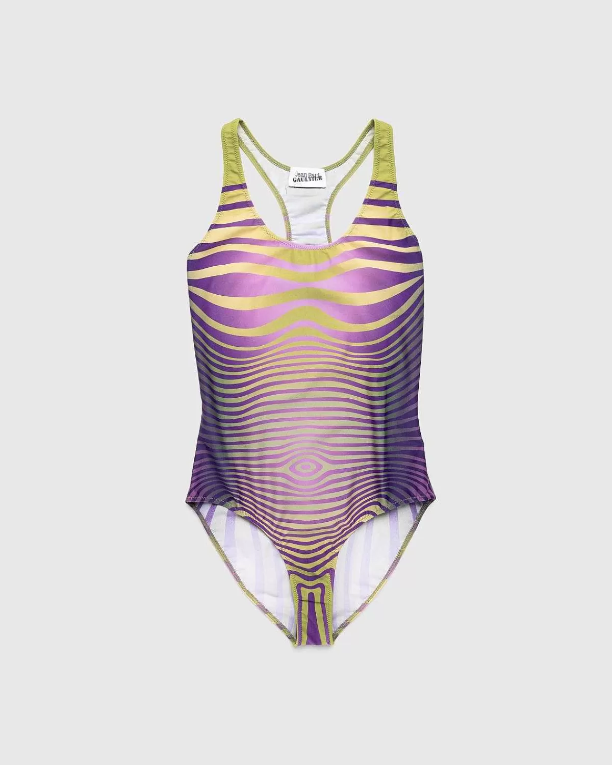 Denne Badedragt Fra Jean Paul Gaultier, Der Er Ideel Til Sommerferier Eller Besøg På Din Lokale Strand. Den I Ét Stykke Badedragt Er Detaljeret Med Et Fascinerende Lilla Og Grønt Gradientmønster Og Har En Klassisk Scoop-Udskæring Med En Skabsløkke På Bagsiden.