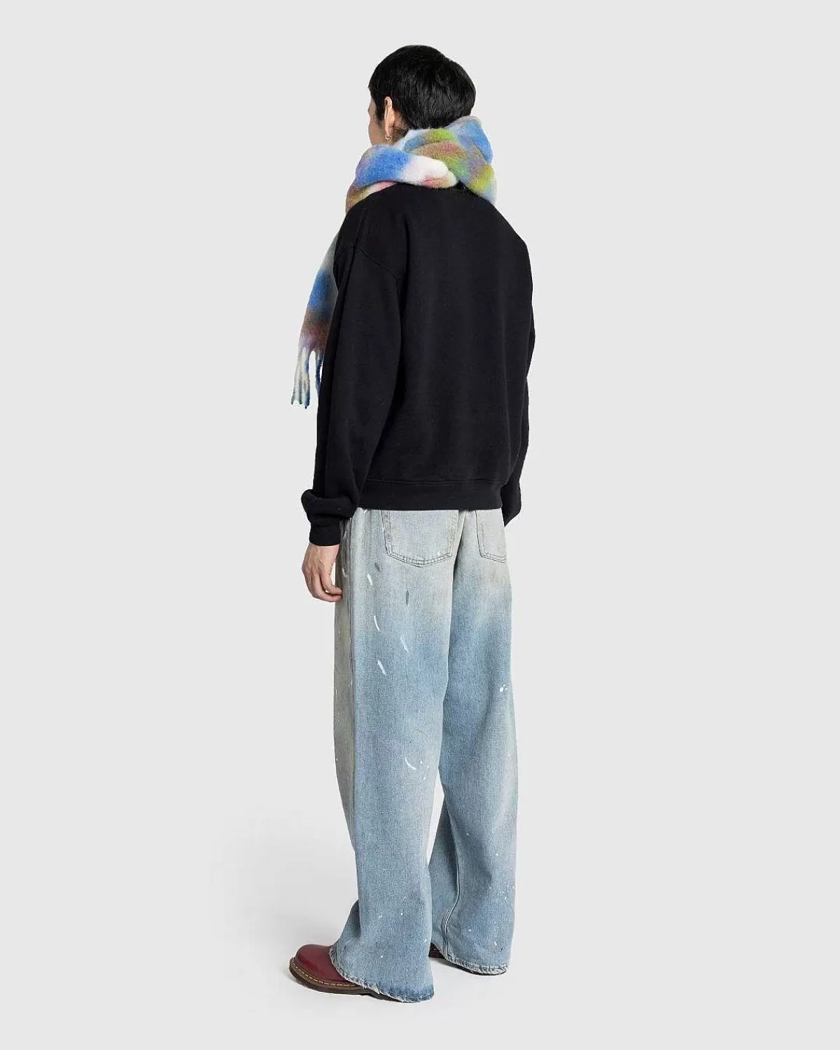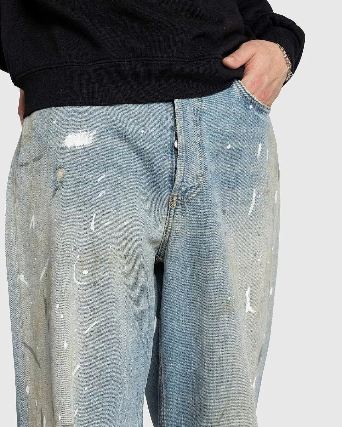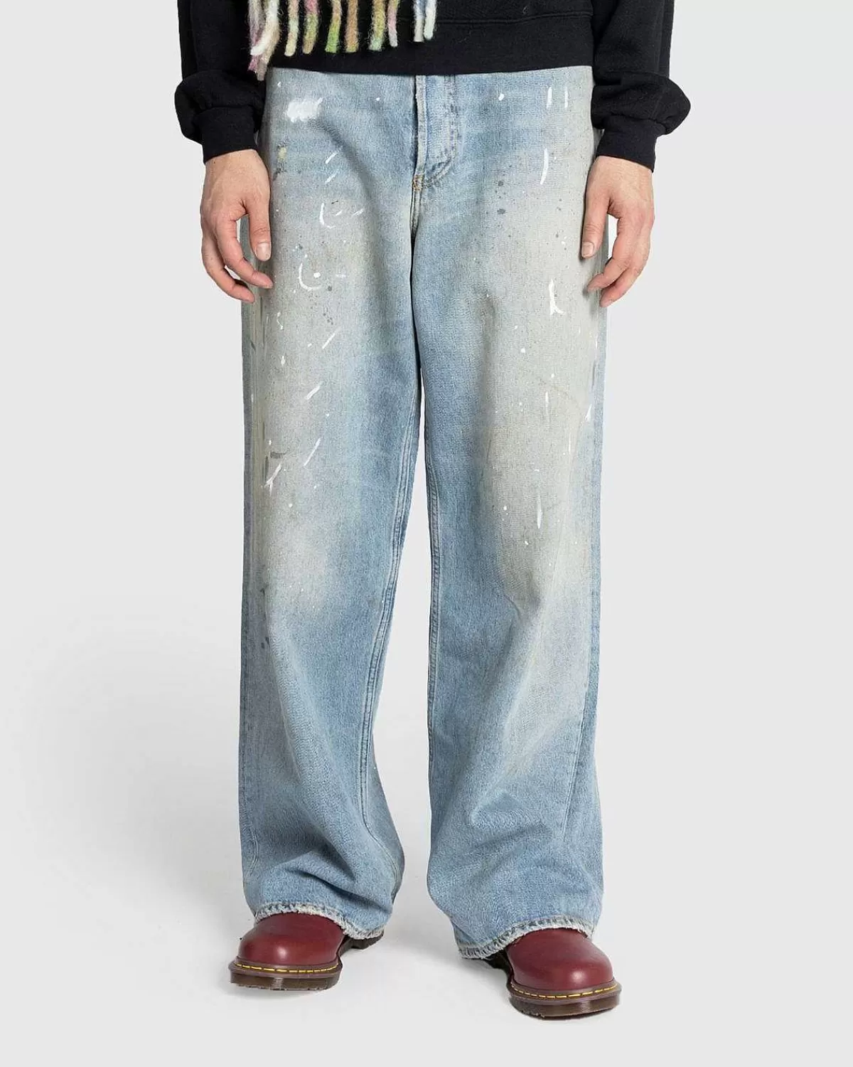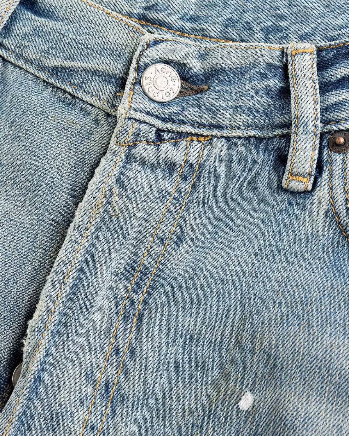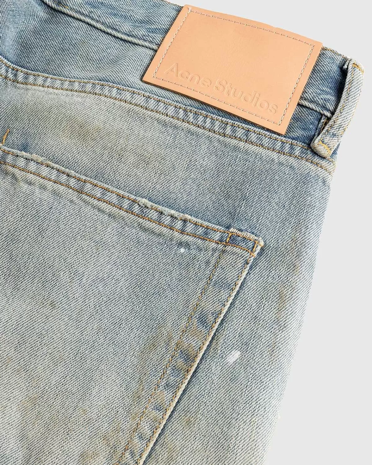 Dette Par Acne Studios-Denim Er Skåret Til En Løs Pasform Med Et Bredt Ben Og En Lav Talje Fra En Økologisk Bomuldsblanding. Den Har En Lyseblå Vask Med Maling Og Snavsdetaljer Samt Klassisk Fem-Lommet Styling. Yderligere Detaljer Omfatter En Knapgylp, Bælteløkker I Taljen Og Et Læderlogomærke På Bagsiden Af Silhuetten.
