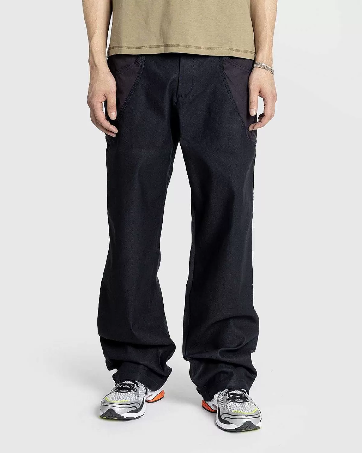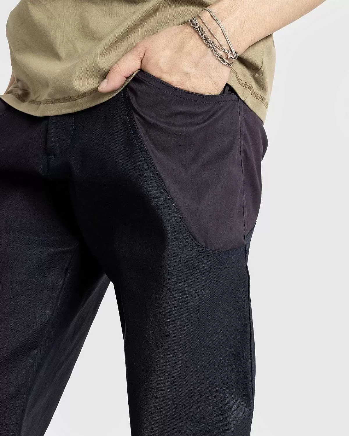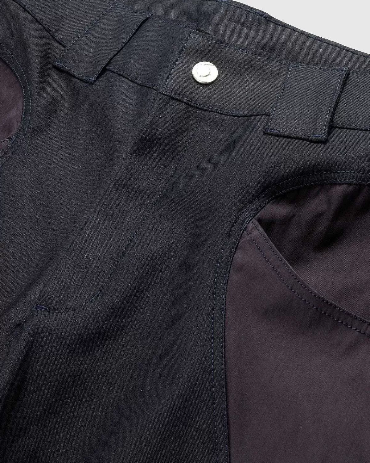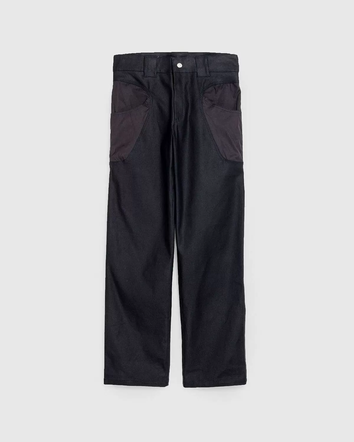 Forge-Bukserne Er Skåret Til Lige Pasform Af Coated Denim Med Pulverberøringsnylonindlæg. De Ovale Omsluttede Kontrastpaneler Definerer I Sidste Ende Silhuetten, Som Er Udstyret Med Dybe Lommer På Hver Side. Yderligere Designdetaljer Omfatter Knapfastgørelse, En Skjult Flue Og Brede Bælteløkker, Der Kanter Langs Taljen.