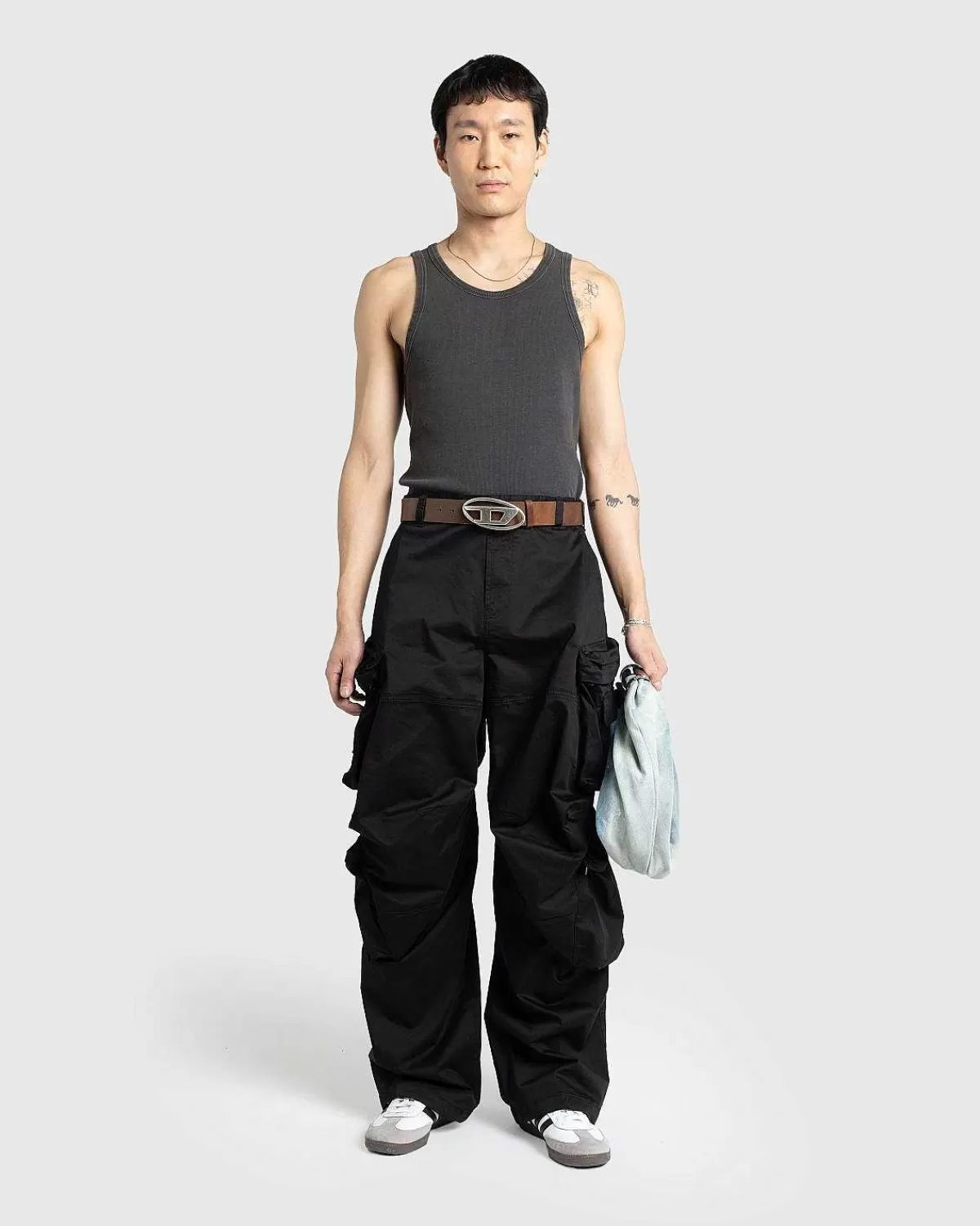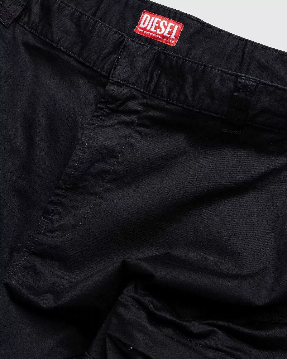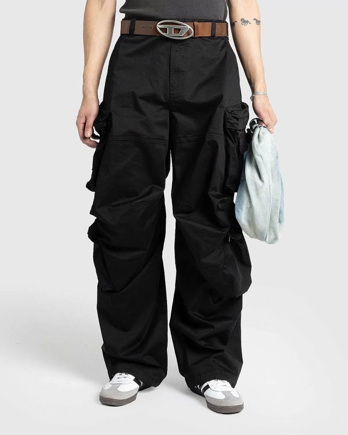 En Moderne Opdatering Til Den Klassiske Cargo-Buks, Diesels P-Huges-Nye Buks Ankommer Til Sæsonen I En Snigende Helsort Farvevariant, Overvejende Konstrueret Af Elastisk Bomuld. Det Brede Benpar Er Kendetegnet Ved En Række Lastlommer Indbygget På Benene, Mens De Er Minimalt Mærket Med Et Lille Ovalt “D” Logomærke På Bagsiden. Yderligere Designdetaljer Inkluderer Skjult Frontfastgørelse, Bælteløkker Og Ankler Med Snøre, Der Giver Mulighed For Mindre Justeringer Af Stylingen.