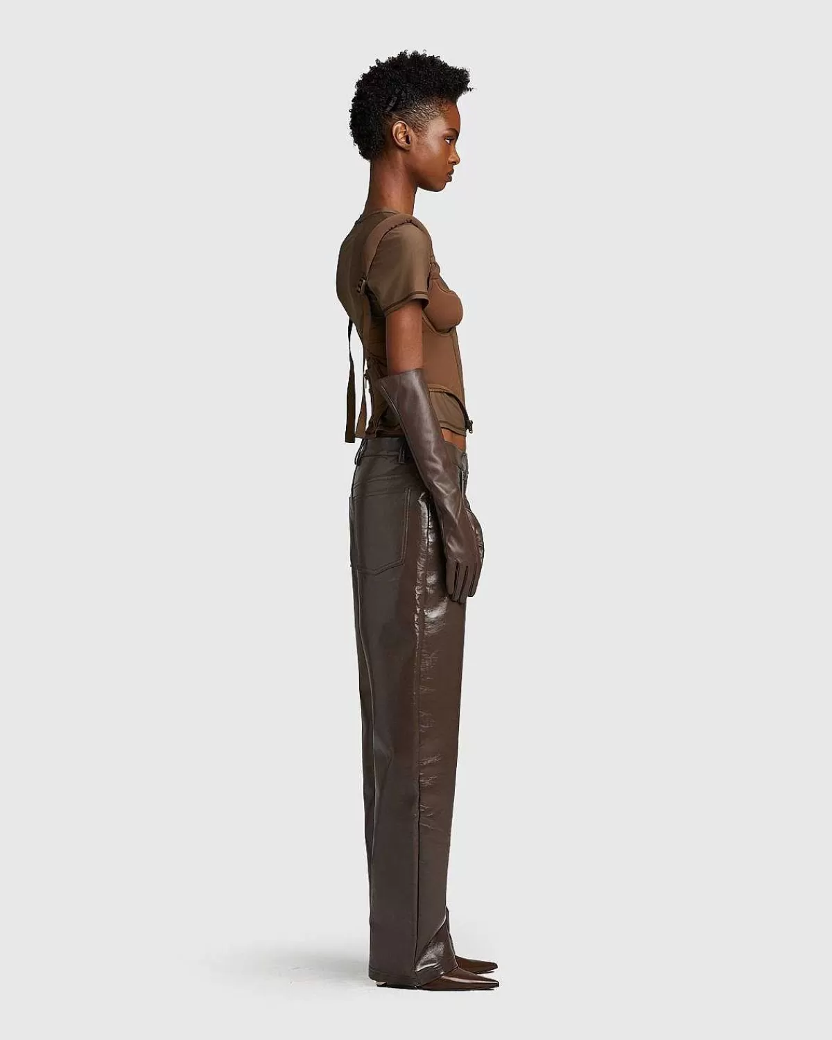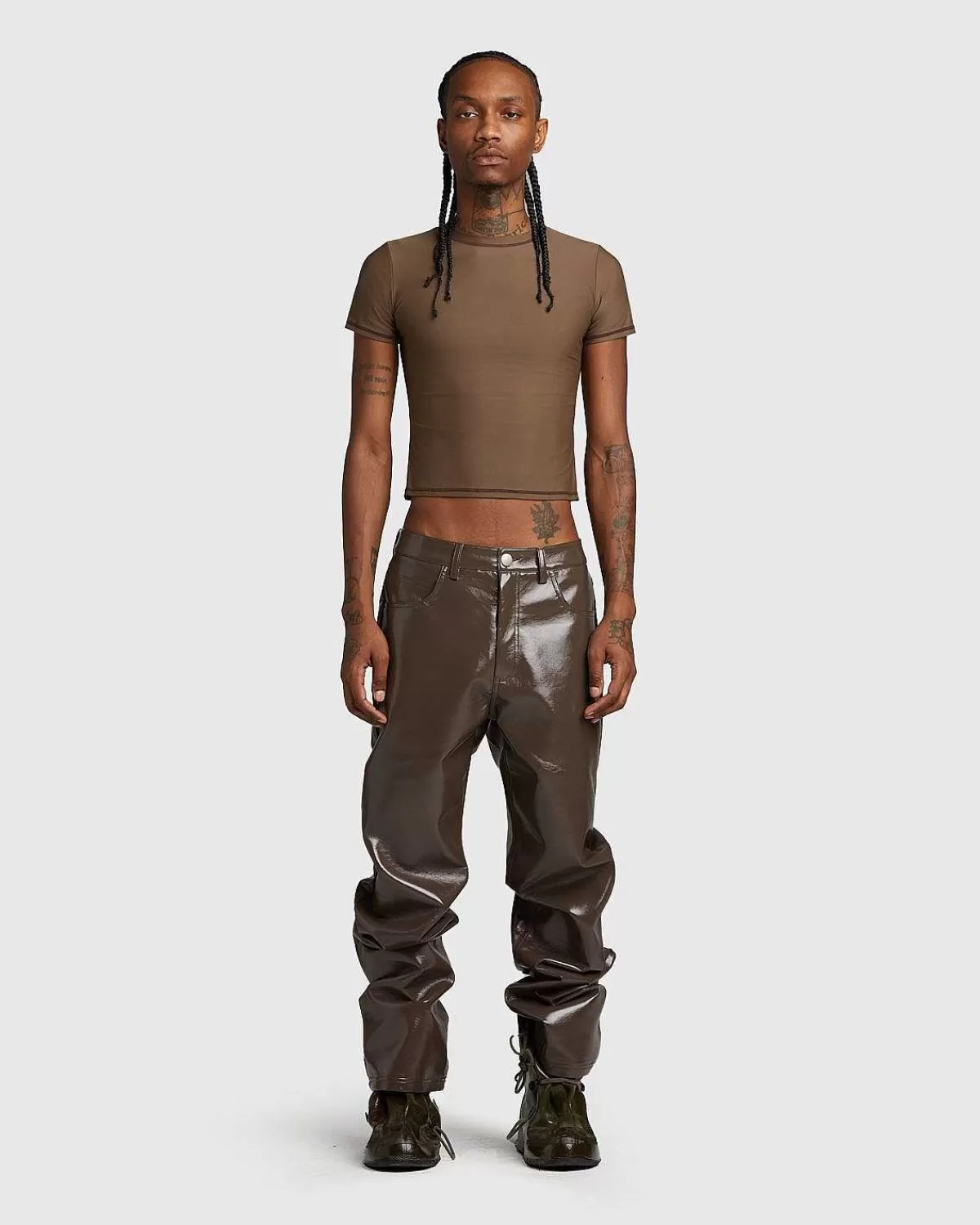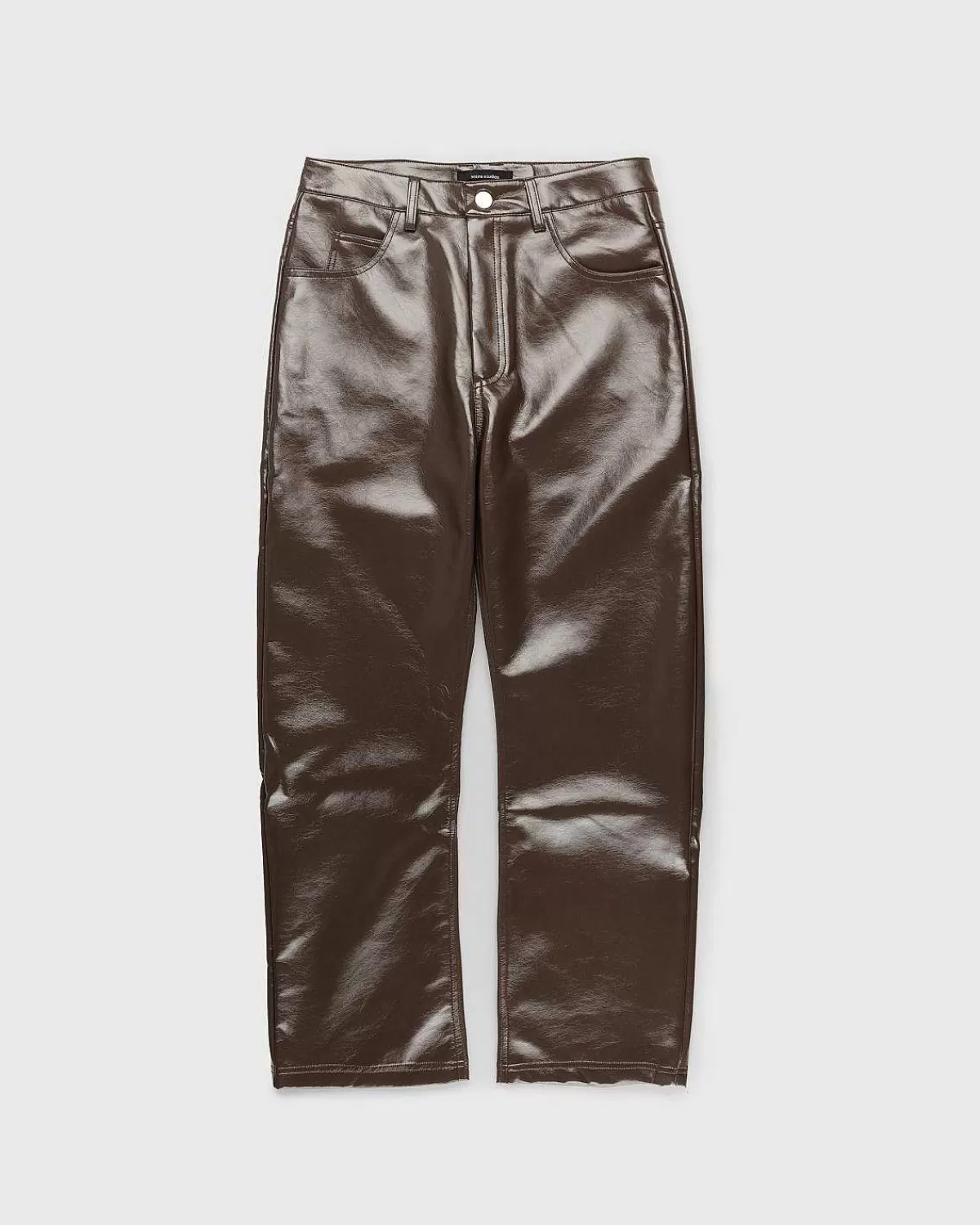 The Wet Pant Er En Iøjnefaldende Beklædningsgenstand For Hele Studios, En Der Giver Os Et Indblik I Fremtidens Mode. Skåret I En Normal Pasform Med Et Bredt Ben, Er Parret Produceret I 100 % Polyurethanlæder For At Levere En Blank Finish, Der Sikrer, At Disse Bunde Fanger Øjet. Stilen Har Traditionel Fem-Lommers Konstruktion Med Side- Og Baglommer Samt Standard Knaplukning Med Lynlås.