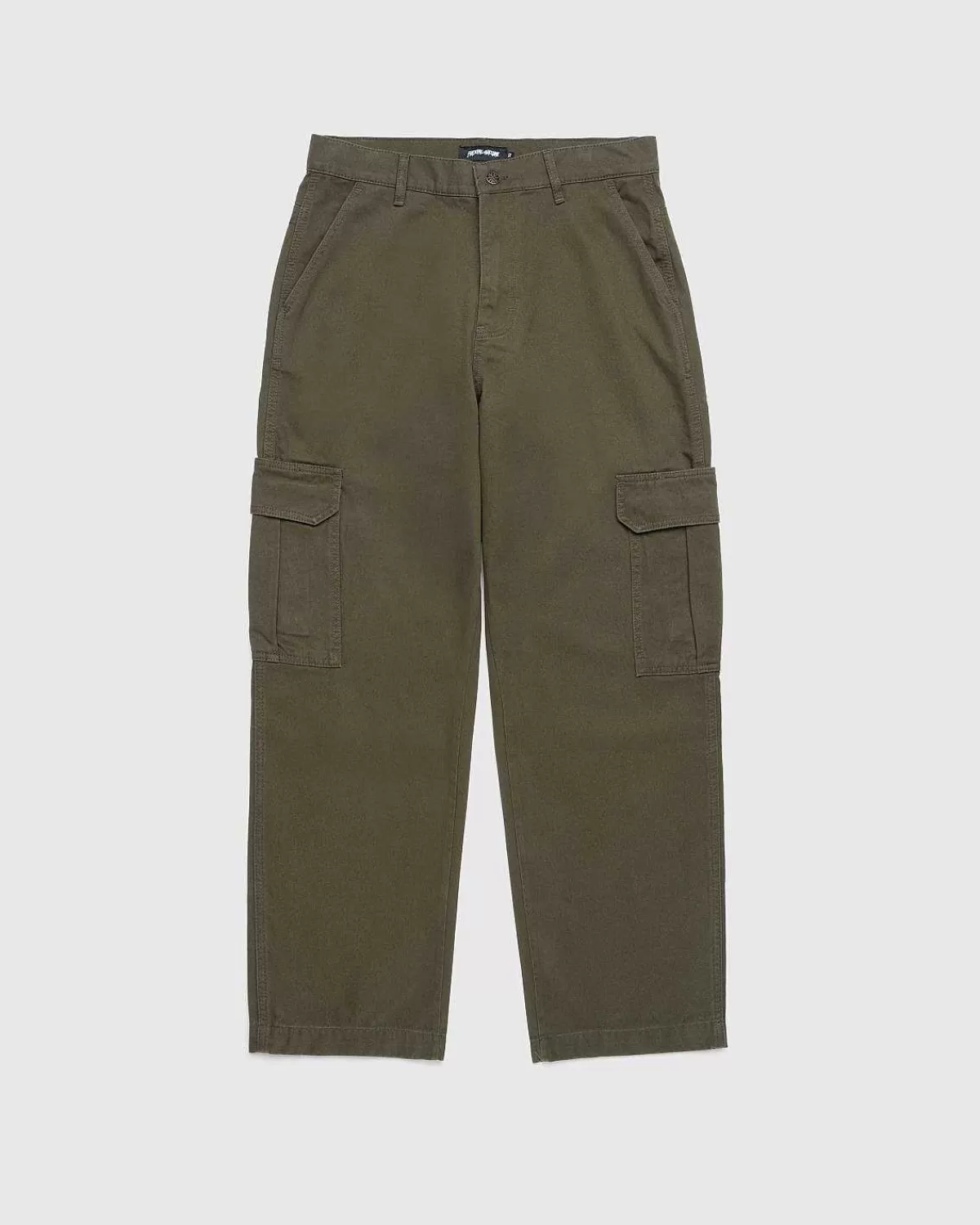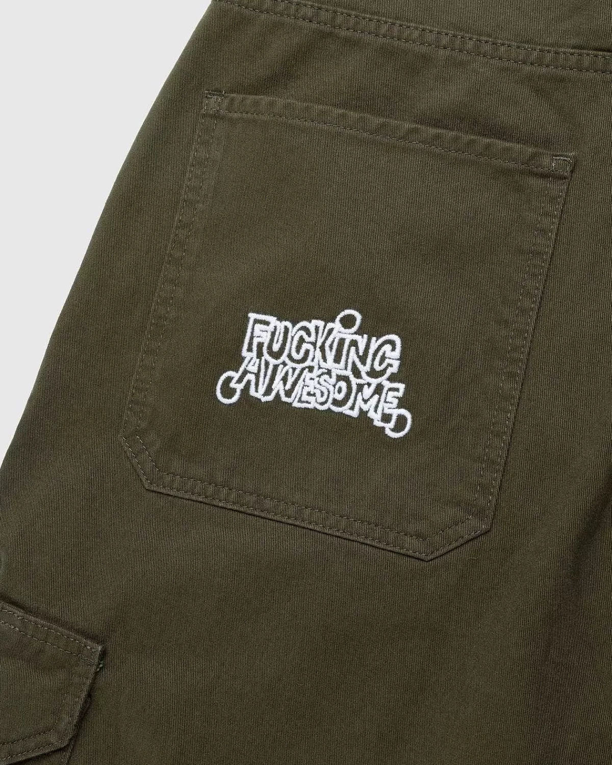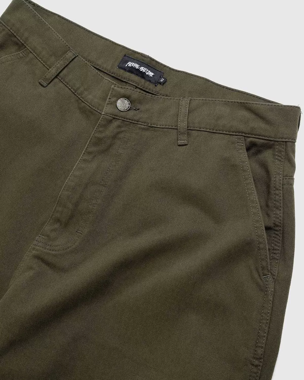 Fucking Awesome Leverer Et Frisk Lastdesign Med Pbs-Buksen. Ankommer Til Sæsonen I En Alsidig Olivenfarvevariant, Det Baggy-Tilpassede Par Er Lavet Af 100 % Bomuld Og Detaljeret Med En Tilpasset “Spiral” Logo Antik Tackknap Samt Mærket Broderi På Bagsiden Af Silhuetten. Ud Over En Lastlomme Ved Hvert Ben Har Buksen Skrå Håndlommer Og To Baglommer.