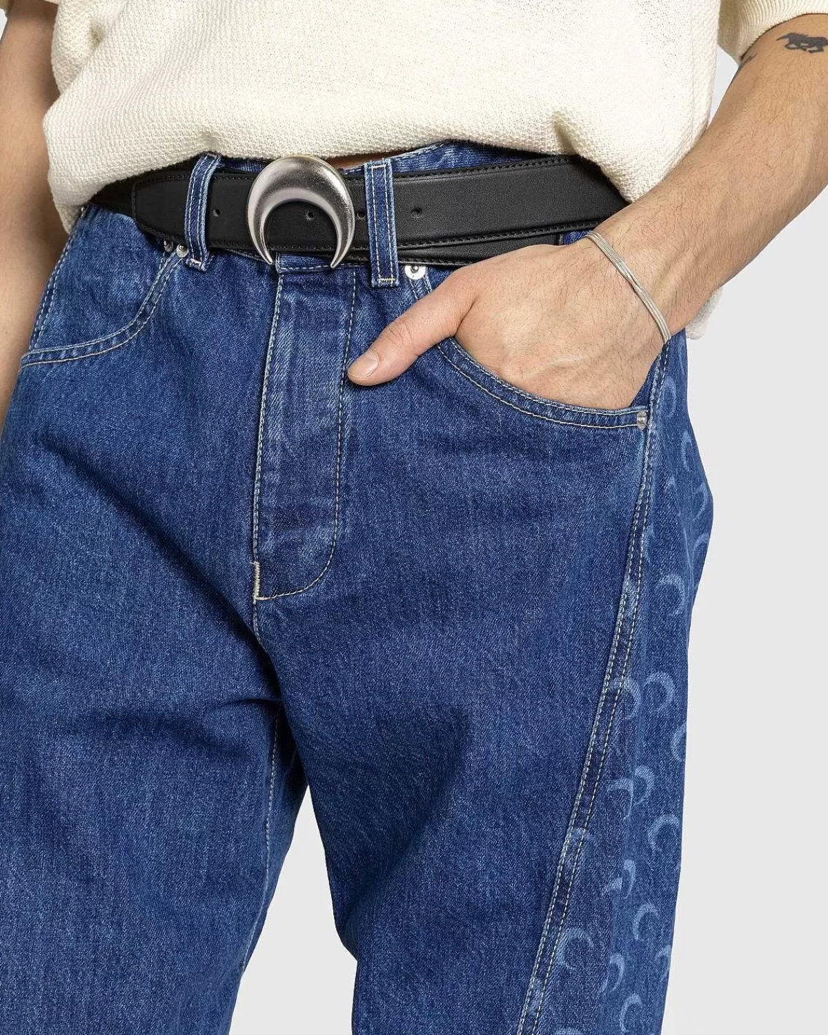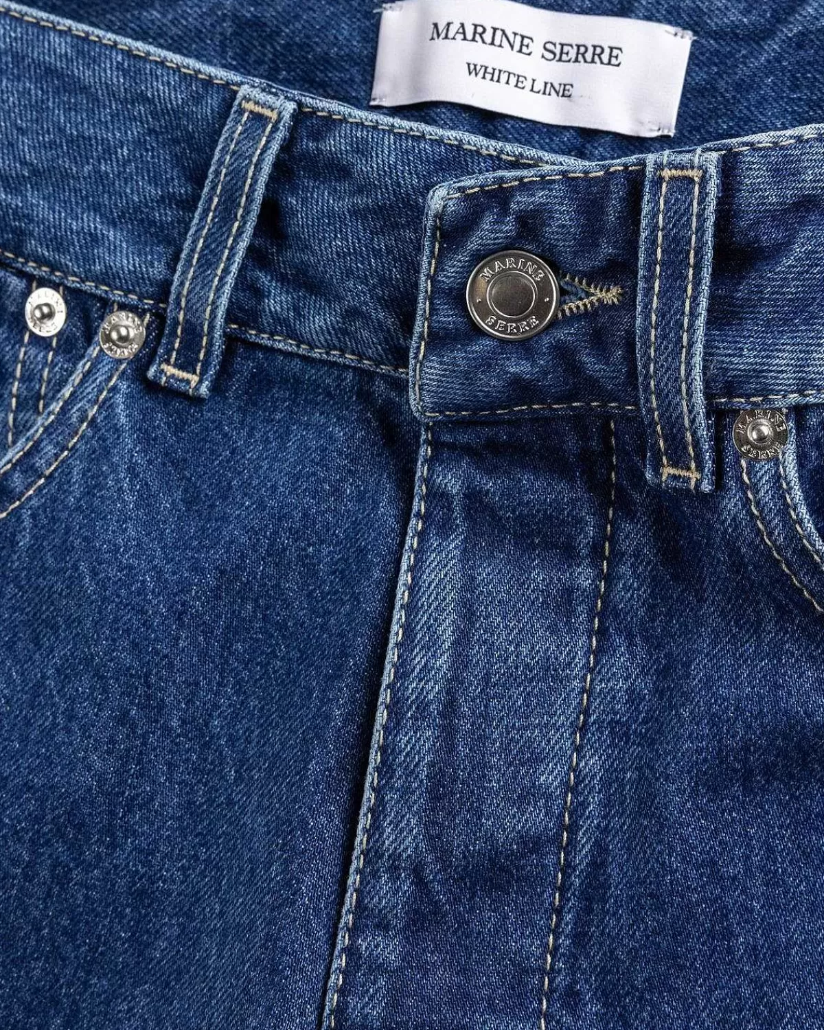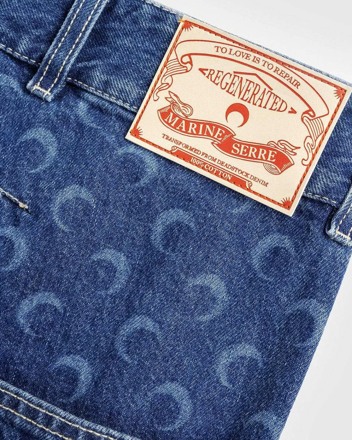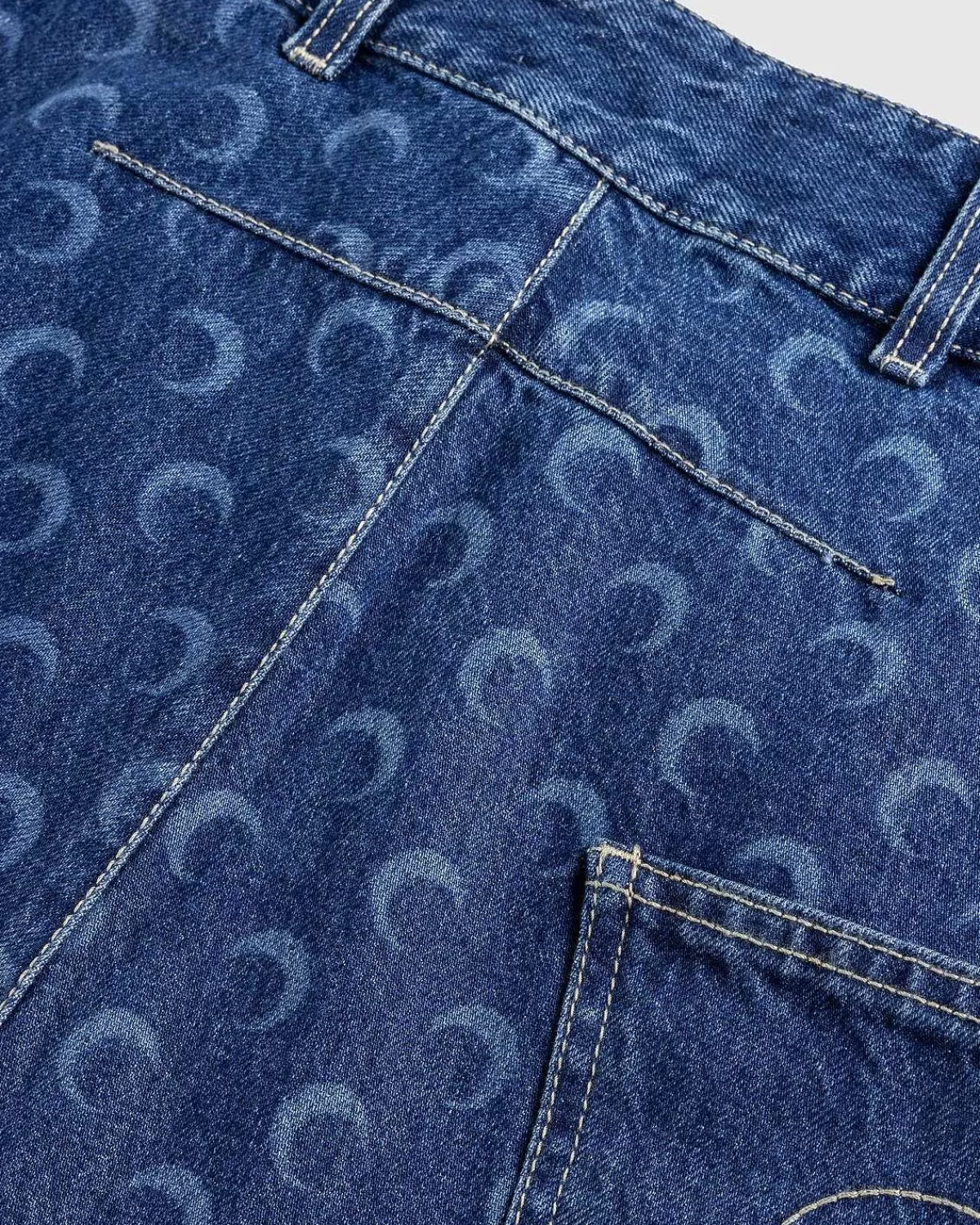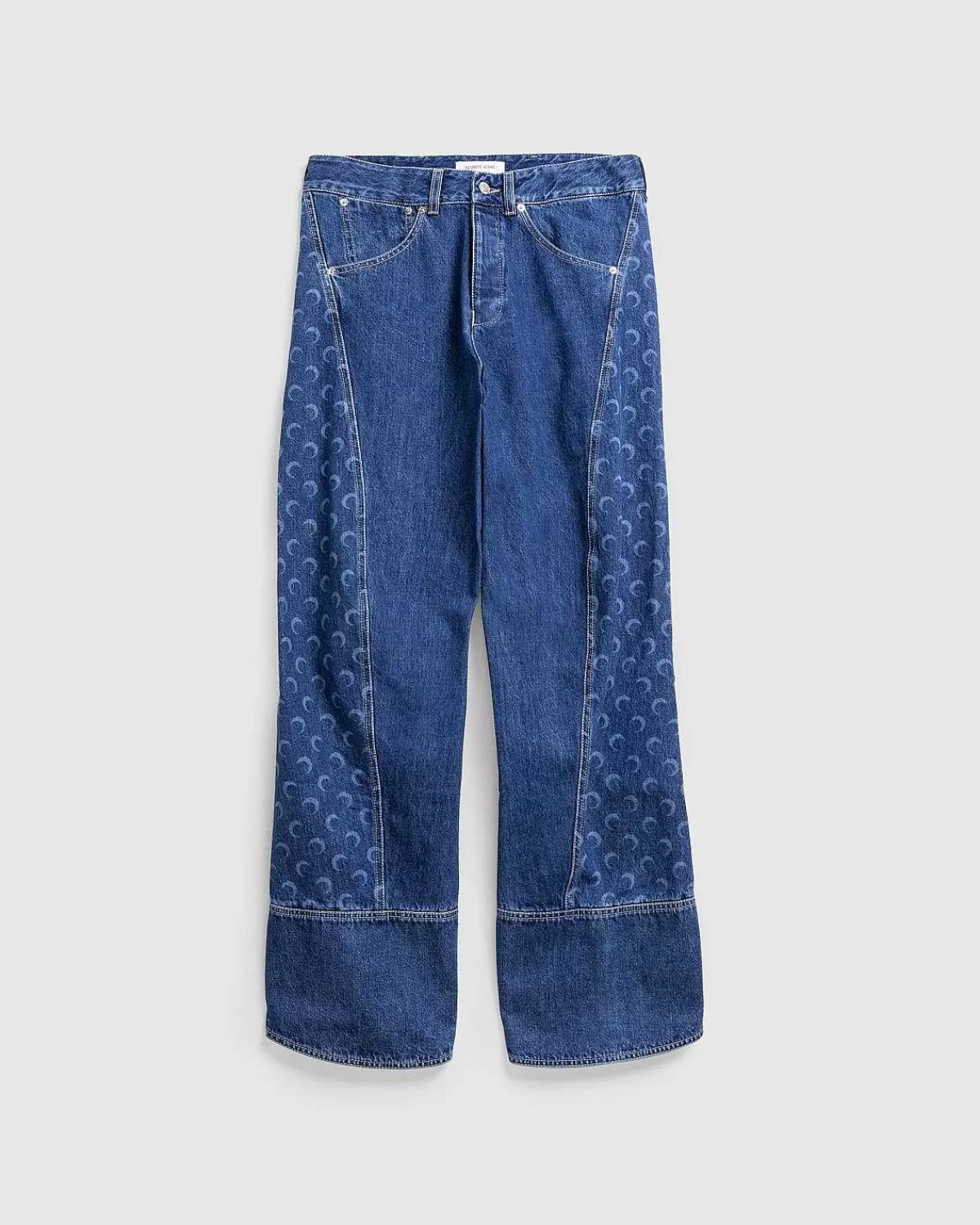 Dette Par Marine Serre-Denim Er Produceret I 100 % Bomuld Og Defineret Af Snoede Snit På Front- Og Bagpaneler, Der Viser Etikettens Signaturmåneikon. Stilen Har Knaplukning Og Bælteløkker For I Taljen, Med Håndlommer, Der Kan Glide Ind Og En Enkelt Patchet Broderet Baglomme.