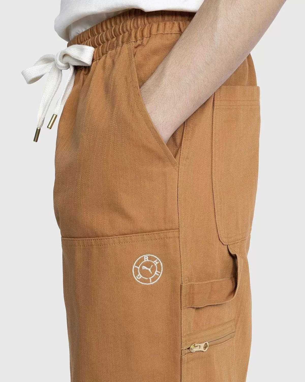 Puma Og Rhuigi Kædes Sammen For At Få Et Forhøjet Bud På En Klassisk Arbejdstøjstil. Den Dobbelte Knæbuks Er Lavet Af 100 % Bomuld, Med Dobbeltlag Af Samme Materiale På Forsiden Af Begge Ben. Parret Er Udstyret Med Arbejdstøj-Inspirerede Detaljer, Herunder Værktøjslommer Og En Hammerløkke, Mens De Også Har En Elastisk Linning Med En Indsat Snøre For Overlegen Komfort.