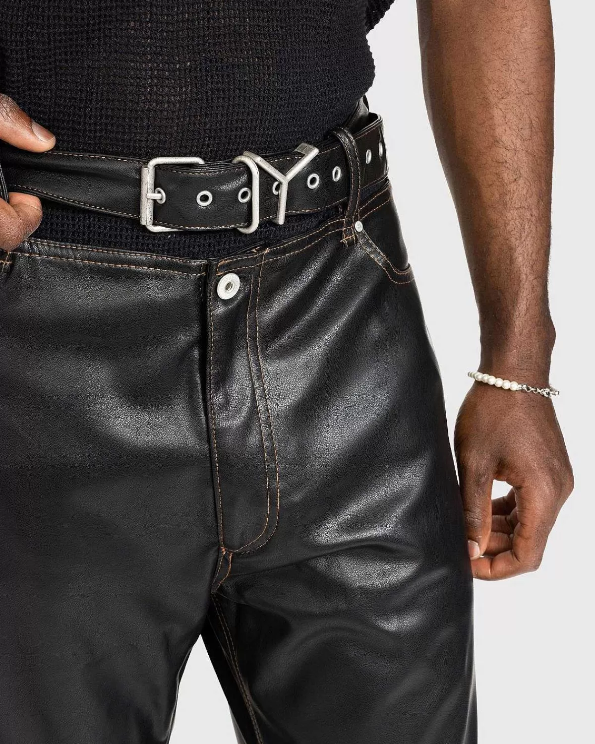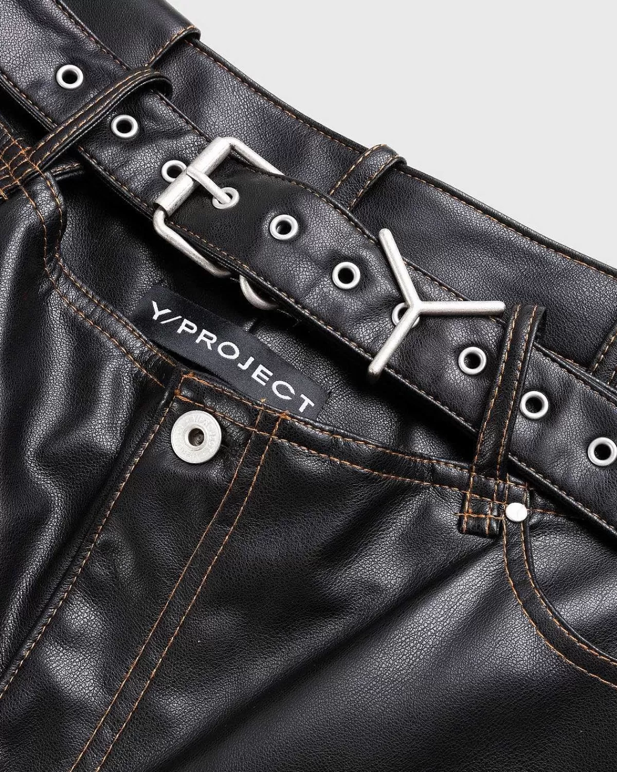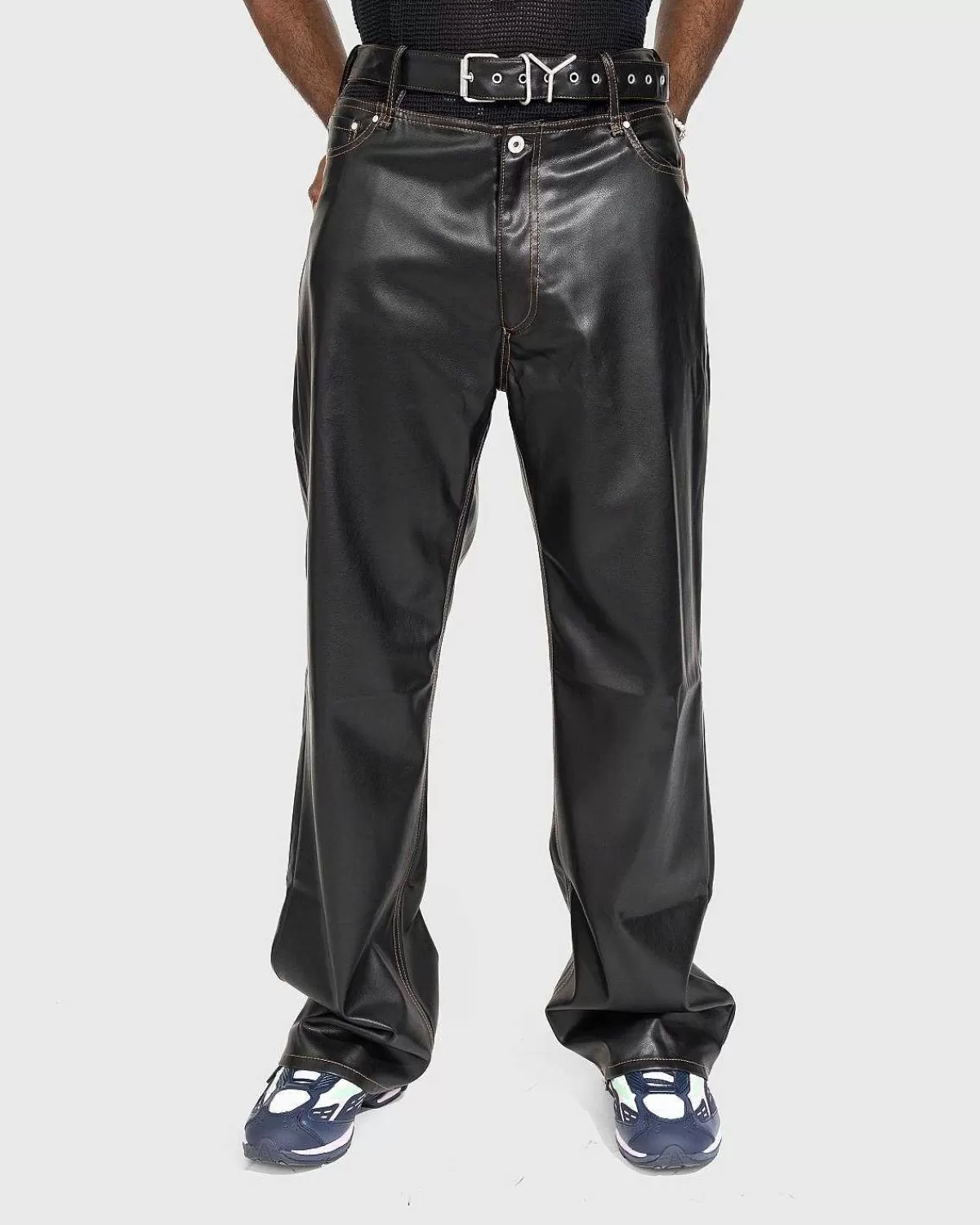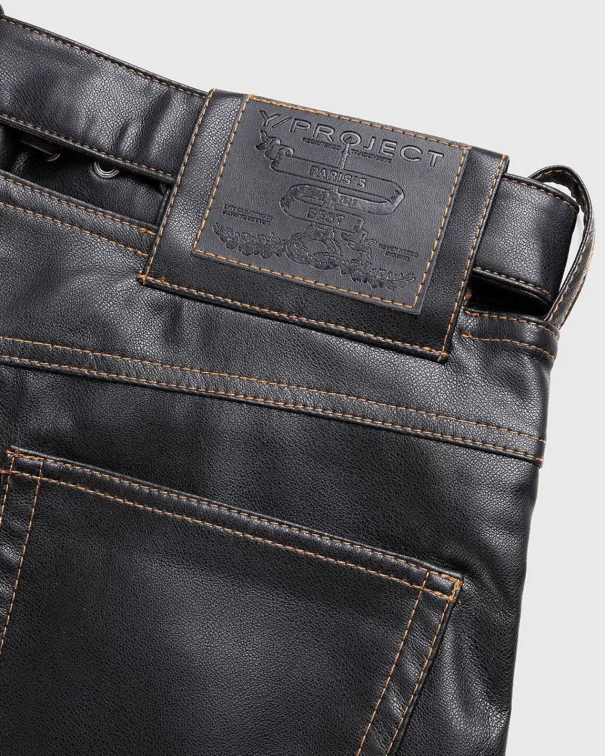 Y/Project’S Læderbukser Er En Karakteristisk Stil, Der Indeholder Et Fastgjort, “Svævende” Y-Bælte I Taljen. Det Brede Ben Er Produceret I Vegansk Læder Og Har Traditionel Fem-Lommet Styling. På Bagsiden Af Silhuetten Er Der Påført Et Læderlogomærke Til At Mærke Det Polariserende Design.