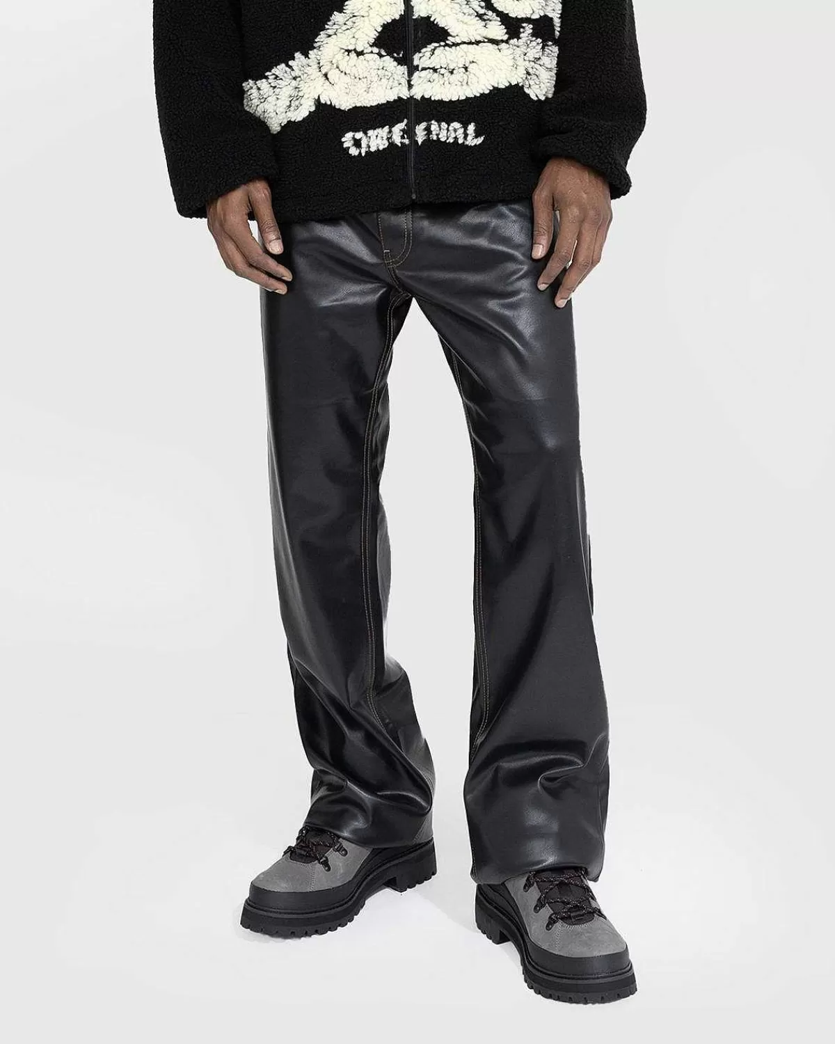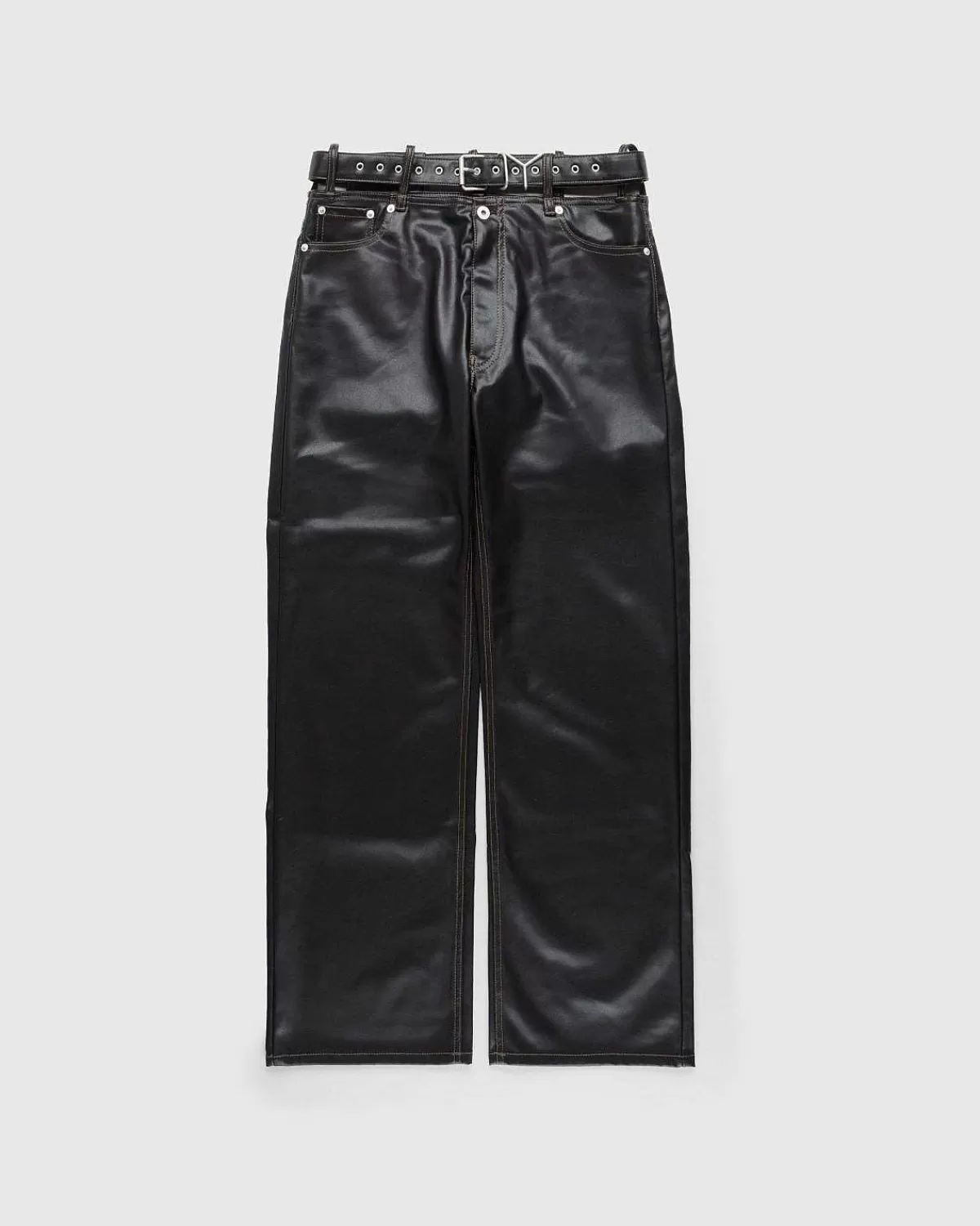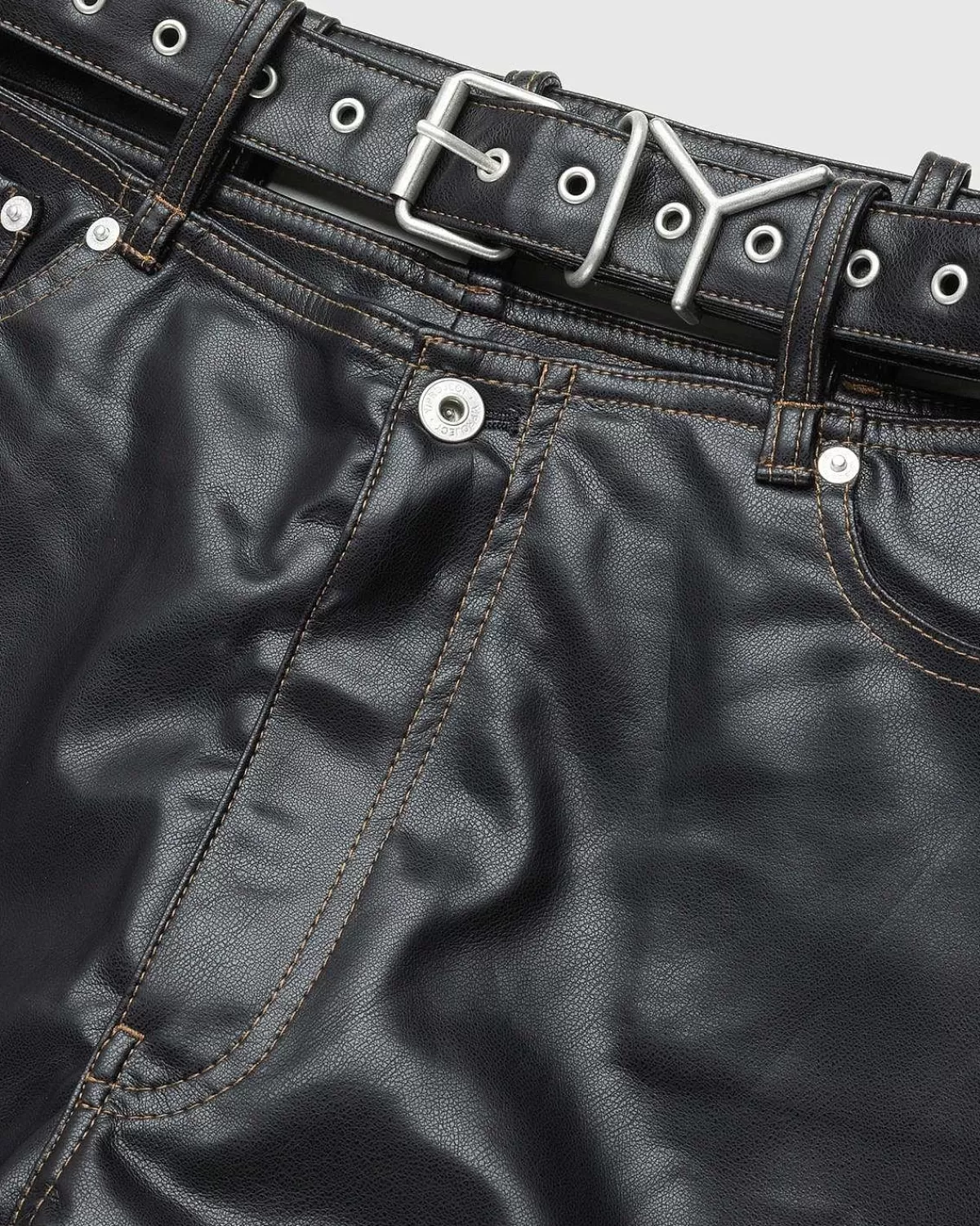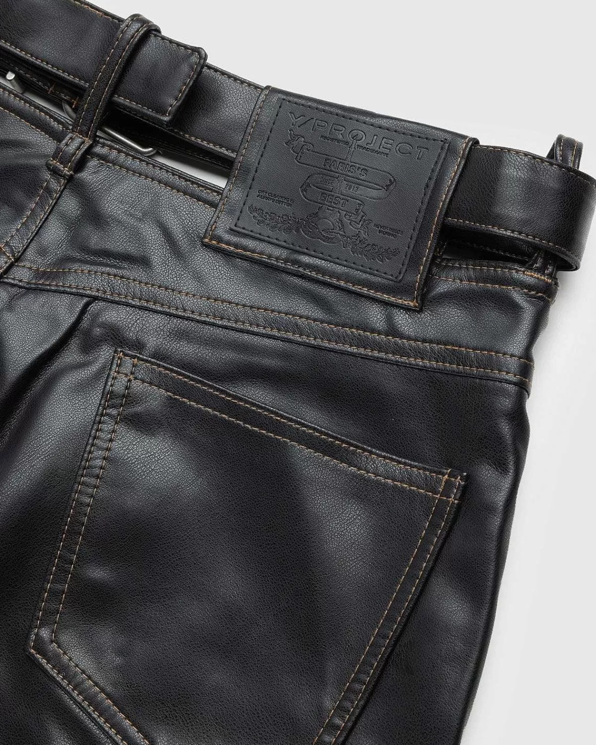 Y/Project’S Læderbukser Er En Karakteristisk Stil, Der Indeholder Et Fastgjort, “Svævende” Y-Bælte I Taljen. Det Brede Ben Er Produceret I Vegansk Læder Og Har Traditionel Fem-Lommet Styling. På Bagsiden Af Silhuetten Er Der Påført Et Læderlogomærke Til At Mærke Det Polariserende Design.