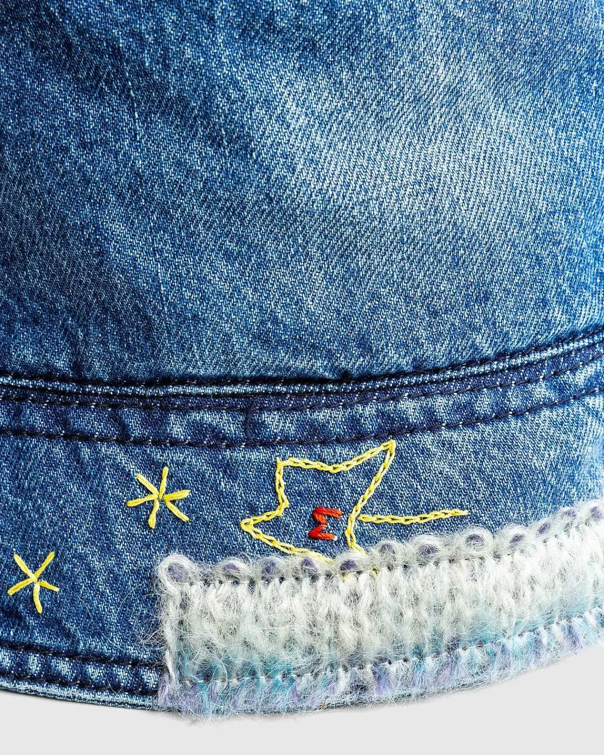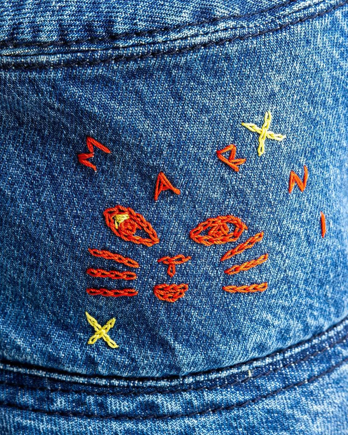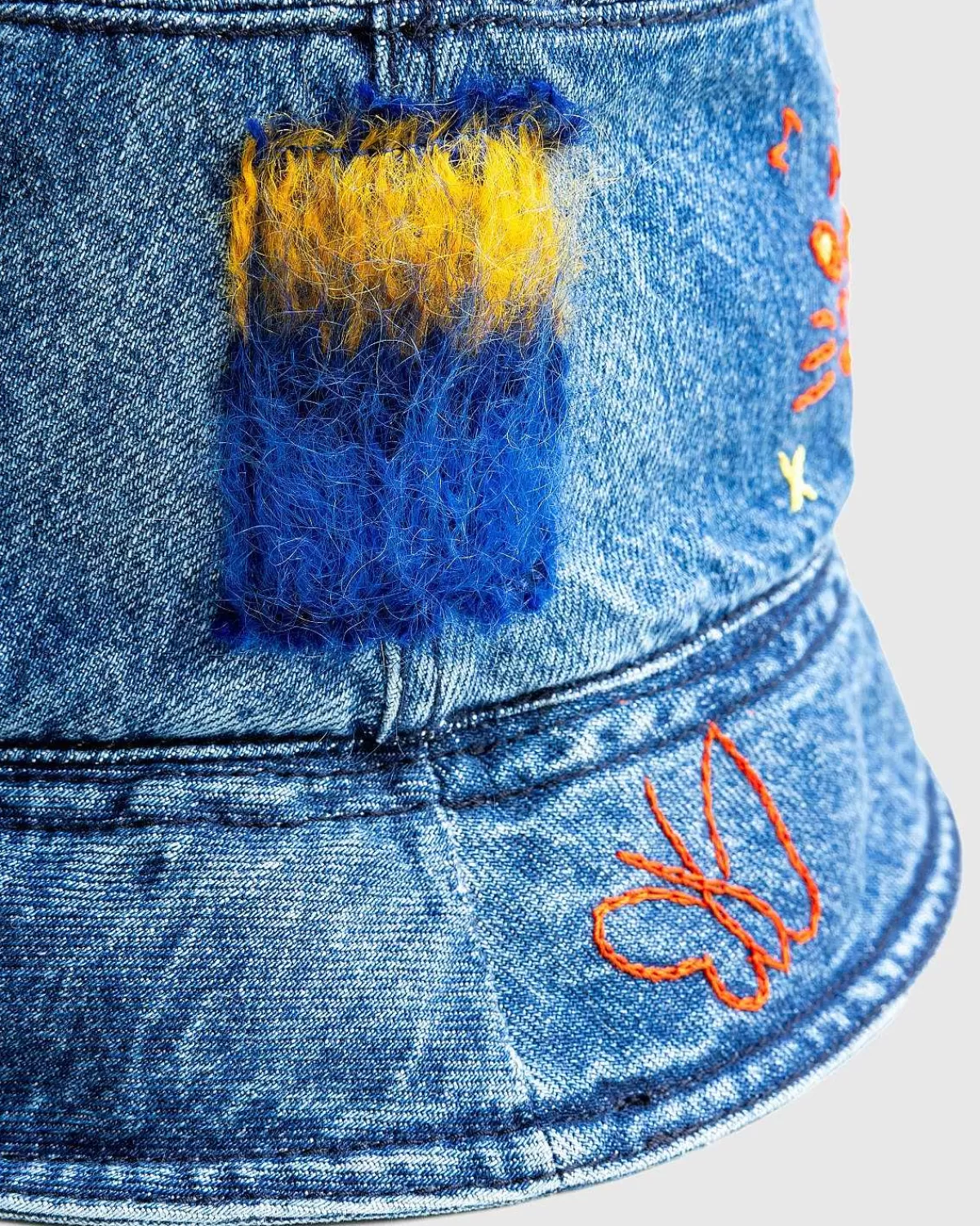 Denne Marni Bucket Hat Er Primært Konstrueret Af Biobomuldsdenim, Der Er Stenvasket For At Skabe Et Karakteristisk Udseende. Det Er Defineret Af Mohair-Lapper Og Indviklede Broderier, Der Dekorerer Den Legende Hovedbeklædningsstil I Hele Silhuetten.