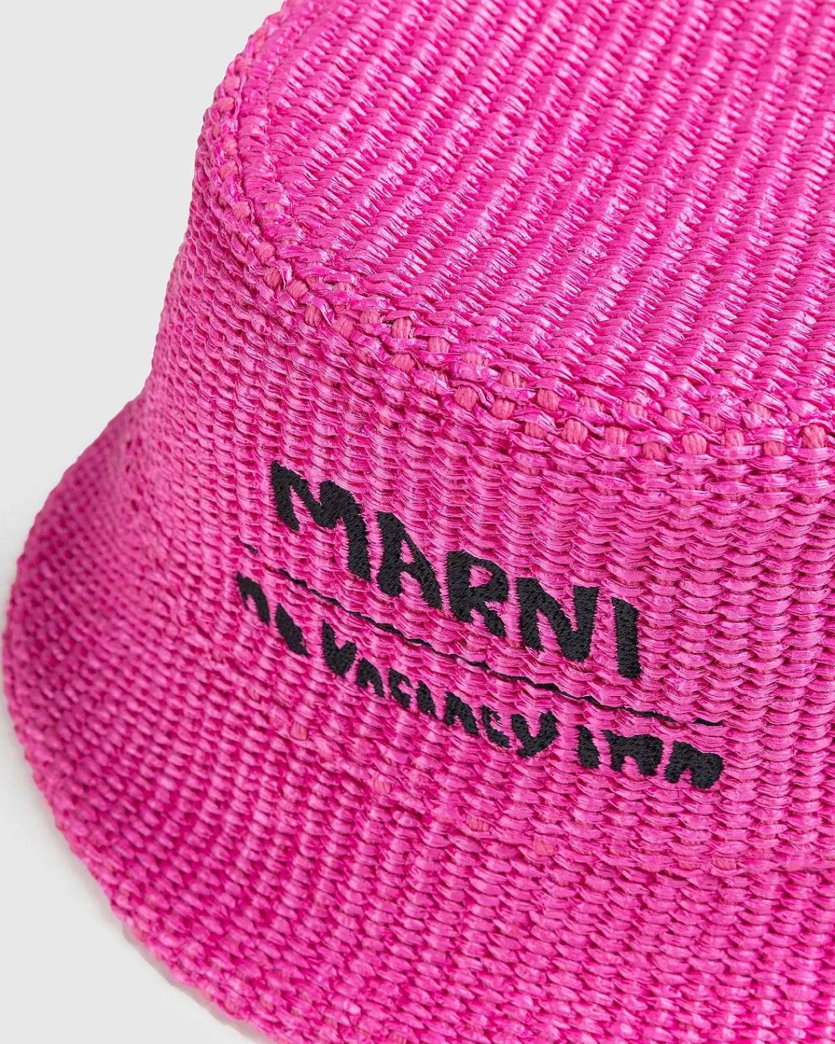 Marni Og No Vacancy Inn Kommer Sammen For At Levere Et Forhøjet Bud På Den Klassiske Bøttehat. Vævet Af En Bomuld-Nylonblanding, Hovedbeklædningen Ankommer I En Levende Lyserød Farvevariant, Udsmykket Med Kontrasterende Co-Branding På Forsiden.