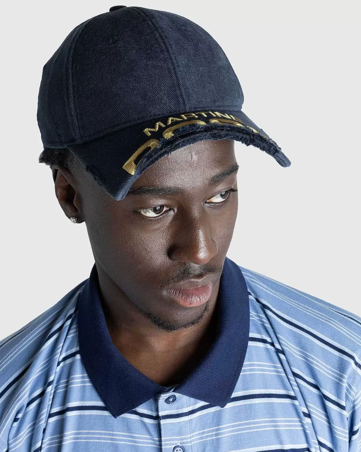 Denne Iøjnefaldende Martine Rose-Hovedbeklædningsstil Er Defineret Af En Afskåret Rand Med Flossede Og Afrevne Kanter…