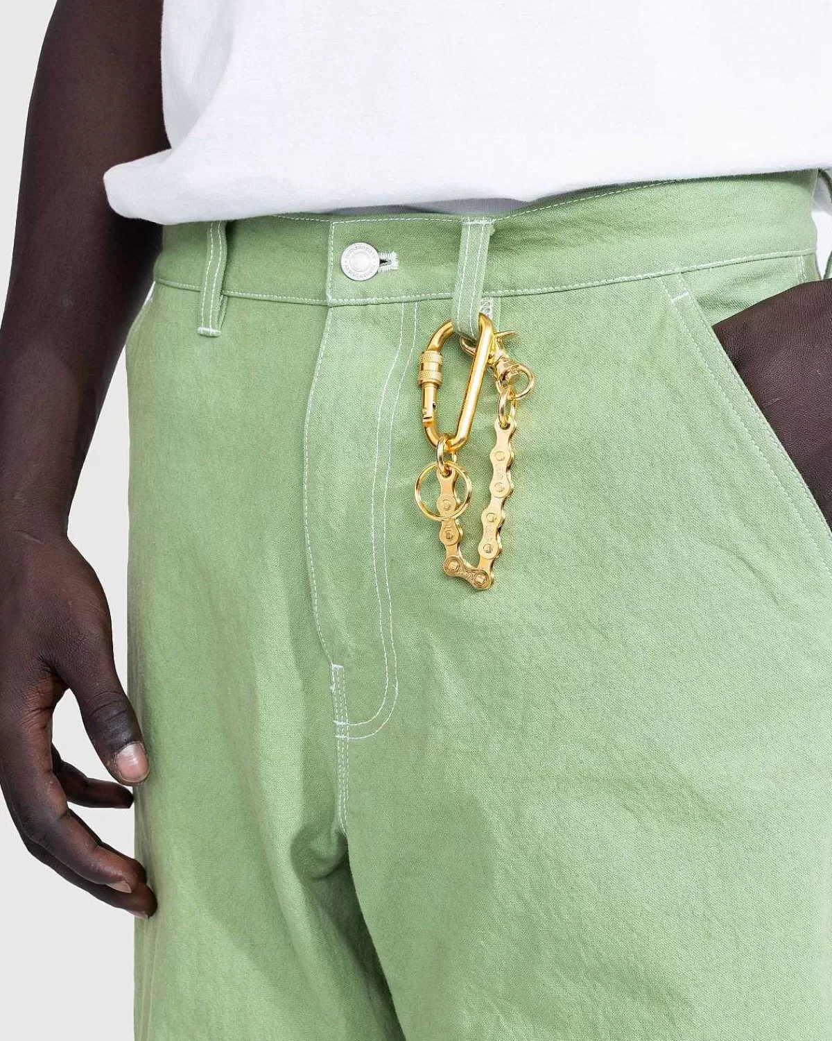 Dette Smarte Tilbehør Fra Porter Bruger En Racercykelkæde Fra Izumi Chain Co., Der Har Udviklet Sine Produkter I Over 100 År. Nøgleringen Er Detaljeret Med En Guldpatina Og Har En Karabinhage Med Et Præget Porter-Logo I Midten.