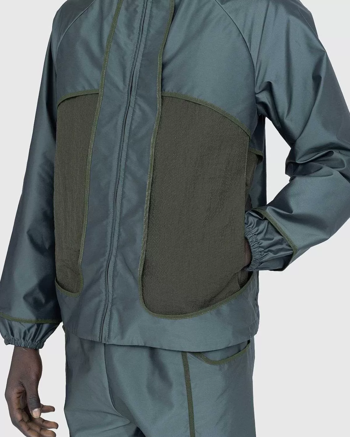 Cavaty-Jakken Fremviser Et Karakteristisk Udseende, Der Næsten Ser Ud Som Om Den Er Indefra Og Ud, Da Beklædningen Er Lavet Af Gennemsigtigt Nylon Ripstop-Net Med Overliggende Nylonpaneler. Den Har En Stående Krave Og Lynlås Foran, Ud Over Raglanærmer Med Elastiske Manchetter Og En Snørekant, Der Giver Plads Til Mindre Justeringer Af Stylingen. Lommer Er Indbygget På Forsiden Af Silhuetten Ved Hjælp Af Lodrette Rum Med Forsegling.