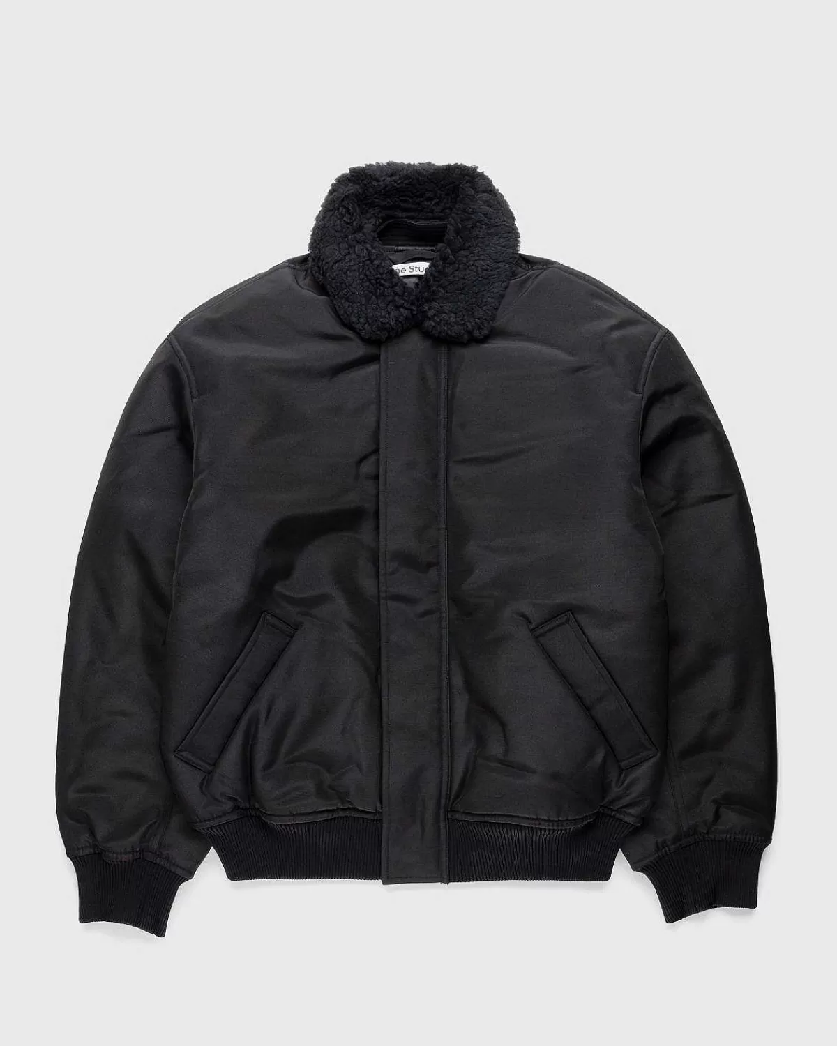 Denne Acne Studios Bomber Er Lavet Af Et Teknisk Almindeligt Vævet Stof Med En Halvskinnende Overflade. Den Er Defineret Af En Aftagelig Uld-Blandet Shearling Krave, Mens Den Også Har Lynlås Foran, Ribkanter Og Sidelommer. Tøjet Er Skåret Til En Afslappet Pasform I Hoftelængde.
