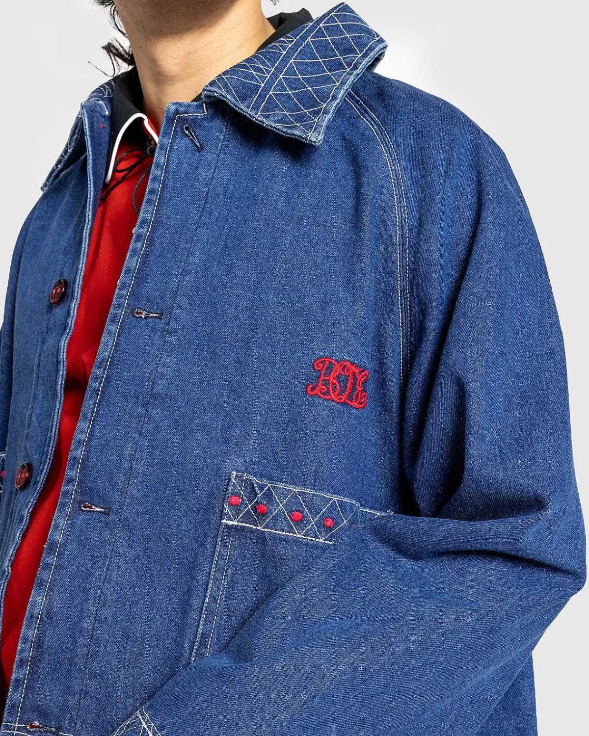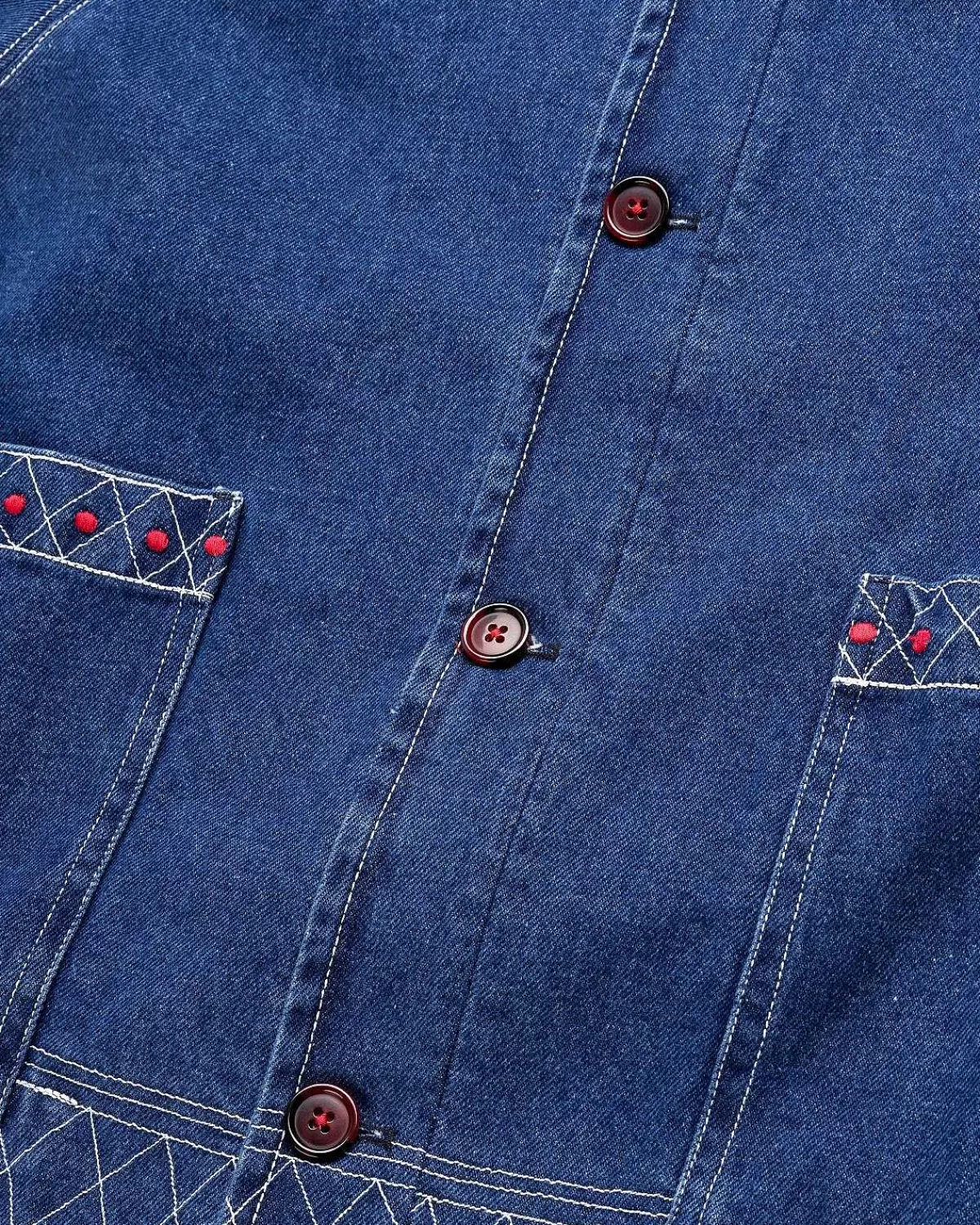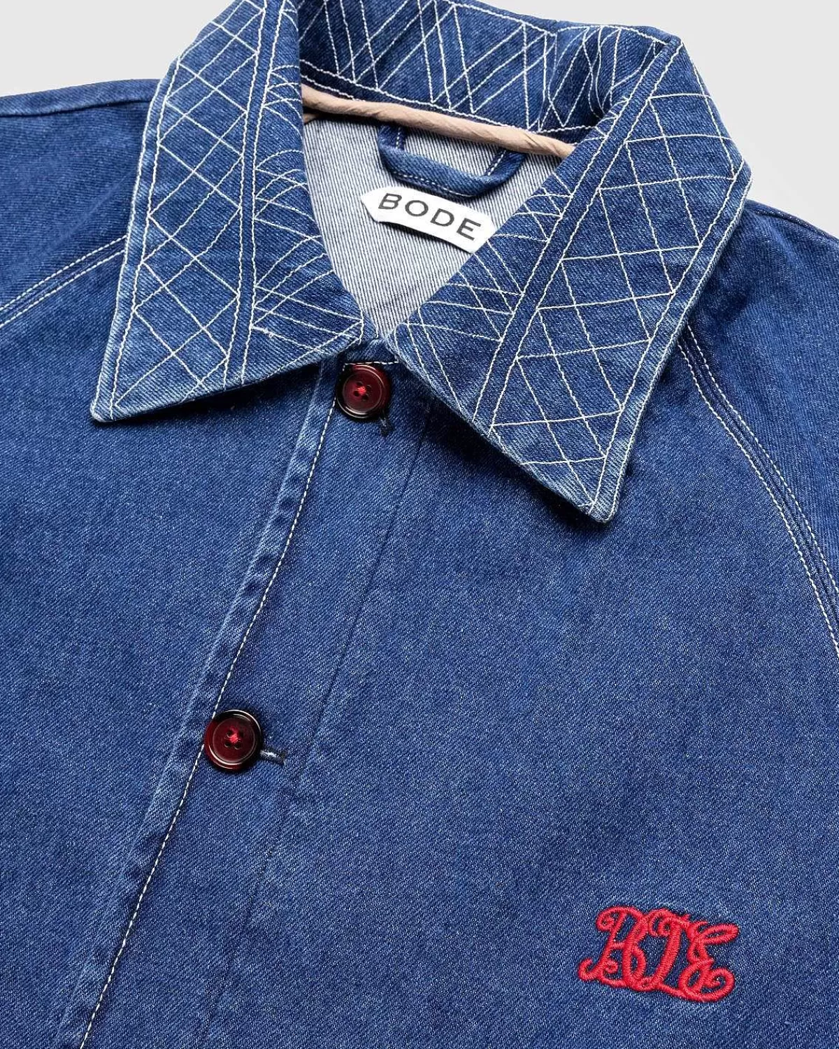 Lavet I Indien Af 100 % Bomuld Er Dette Enestående Bodestykke Baseret På En Vintage Denimkjole Fra 1970’Erne Til 1980’Erne. Mærket Gengav Igen Den Definerende Broderede Detalje Langs Kraven, Ærmerne, Lommerne Og Forneden Til Denne Forhøjede Arbejdstøjssilhuet. Beklædningsgenstanden Har En Stor Spredt Krave, Knaplukning Foran Med Overdimensionerede Knapper Og To Frontlommer. Ud Over Det Geometriske Broderi Er Stykket Udsmykket Med Et Bodemonogram På Forsiden.