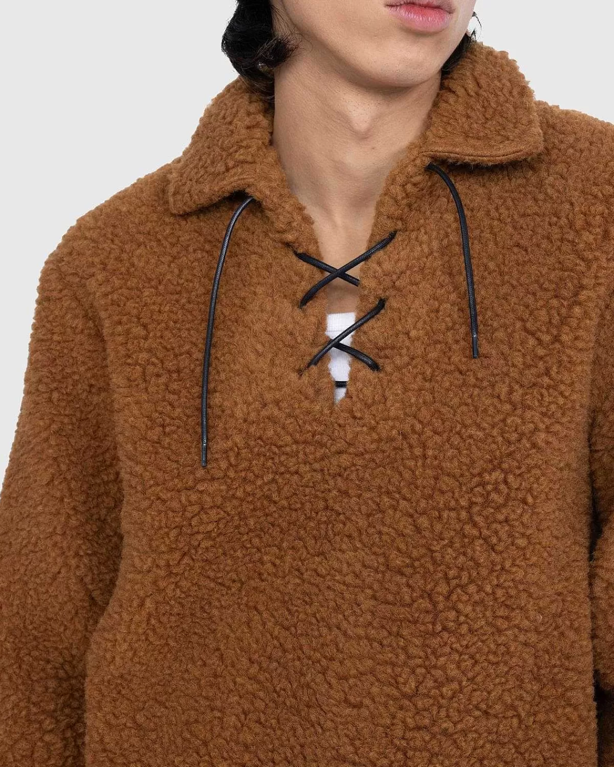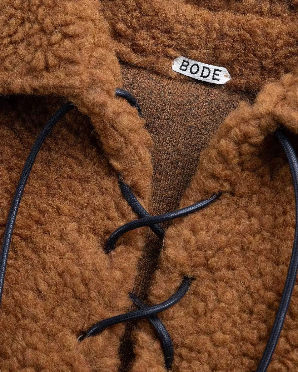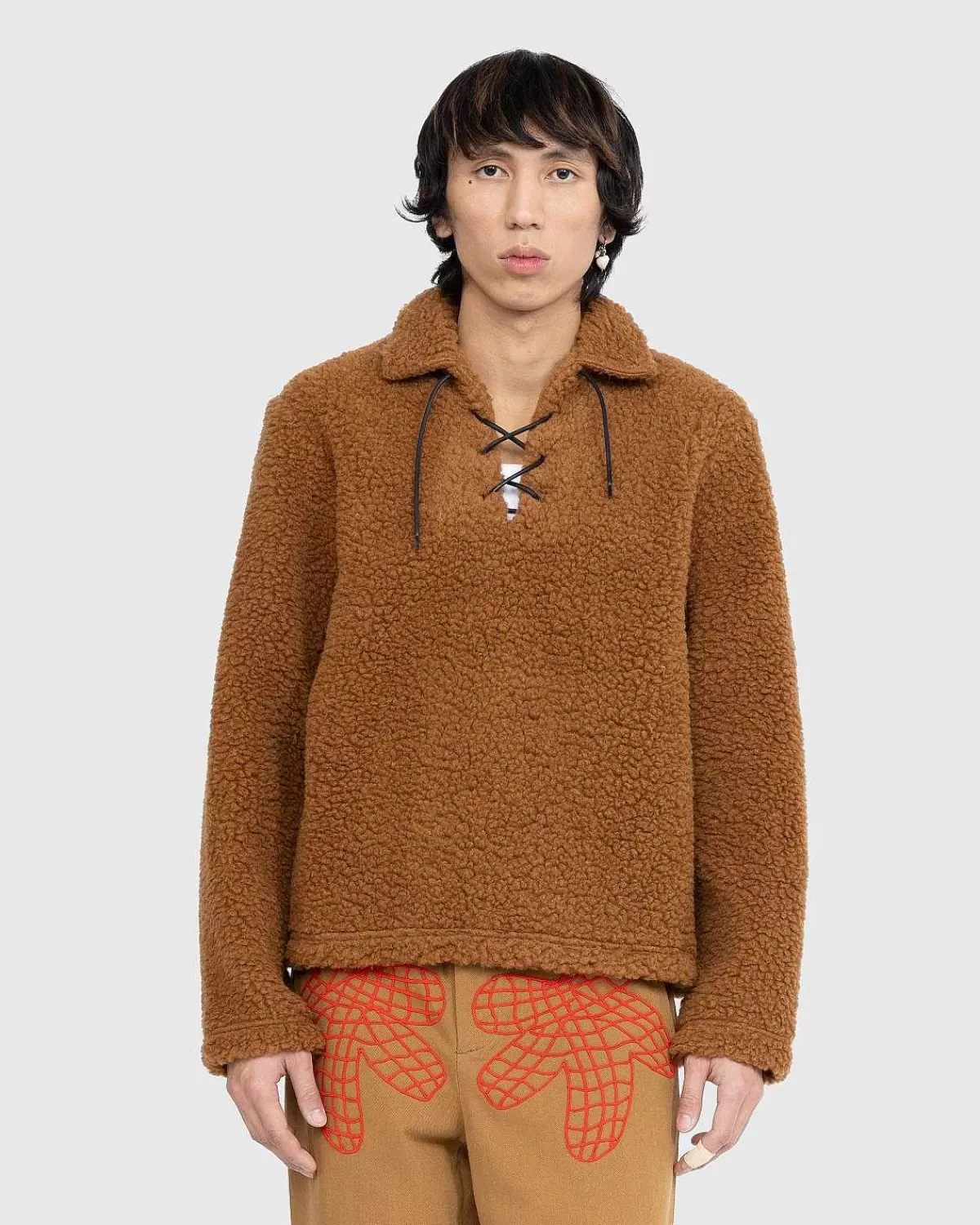 Denne Bløde, Karamelfarvede Fleece Henter Inspiration Fra En Sweater Omkring 1970’Erne. Bode Gengav Igen Silhuetten For Sin Nye Sæsonkollektion, Da Den Hyggelige Beklædningsgenstand Er Udført I Plys Jomfruuld. Det Er Defineret Af En Snøret Halsudskæring, Med Yderligere Detaljer, Der Inkluderer En Krave Og En Lige Søm.