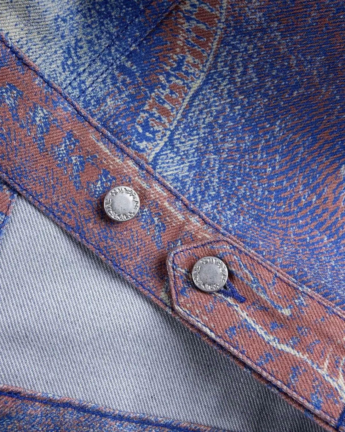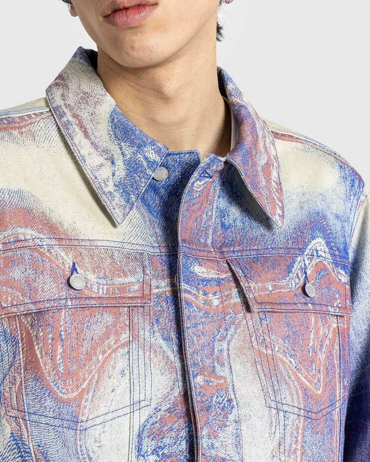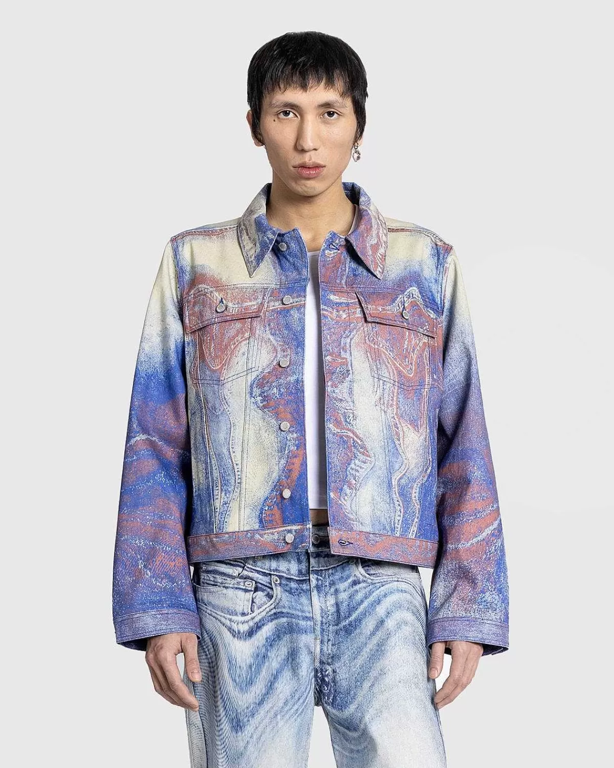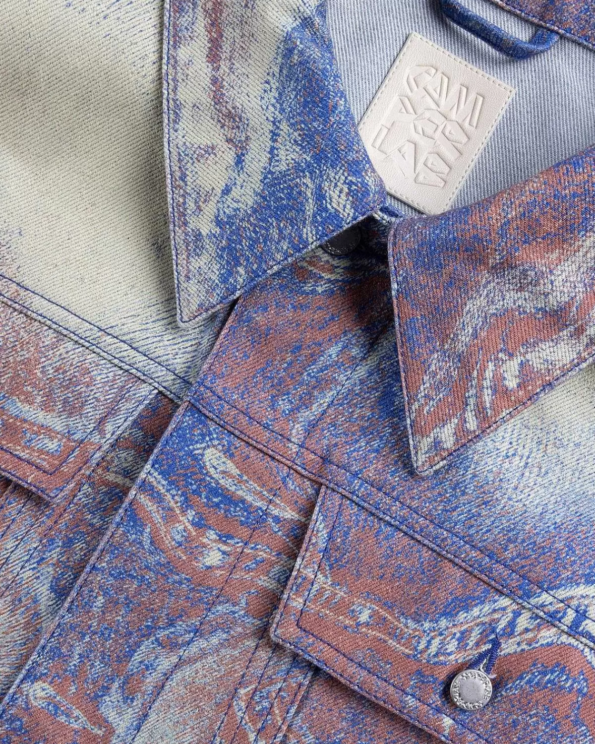 Denne Camperlab-Denimjakke Er Defineret Af Et Sæsonbestemt Kontrastfarveprint, Der Giver Den Et Modigt Urbant Look. Stilen Er Skåret Til En Afslappet Unisex Pasform Med Overdimensionerede Ærmer Og Faldende Skuldre. Bølgede Denimoverlays Dekorerer Overtøjsstilen, Der Er Afsluttet Med To Brystlommer Og En Klassisk Reverskrave.