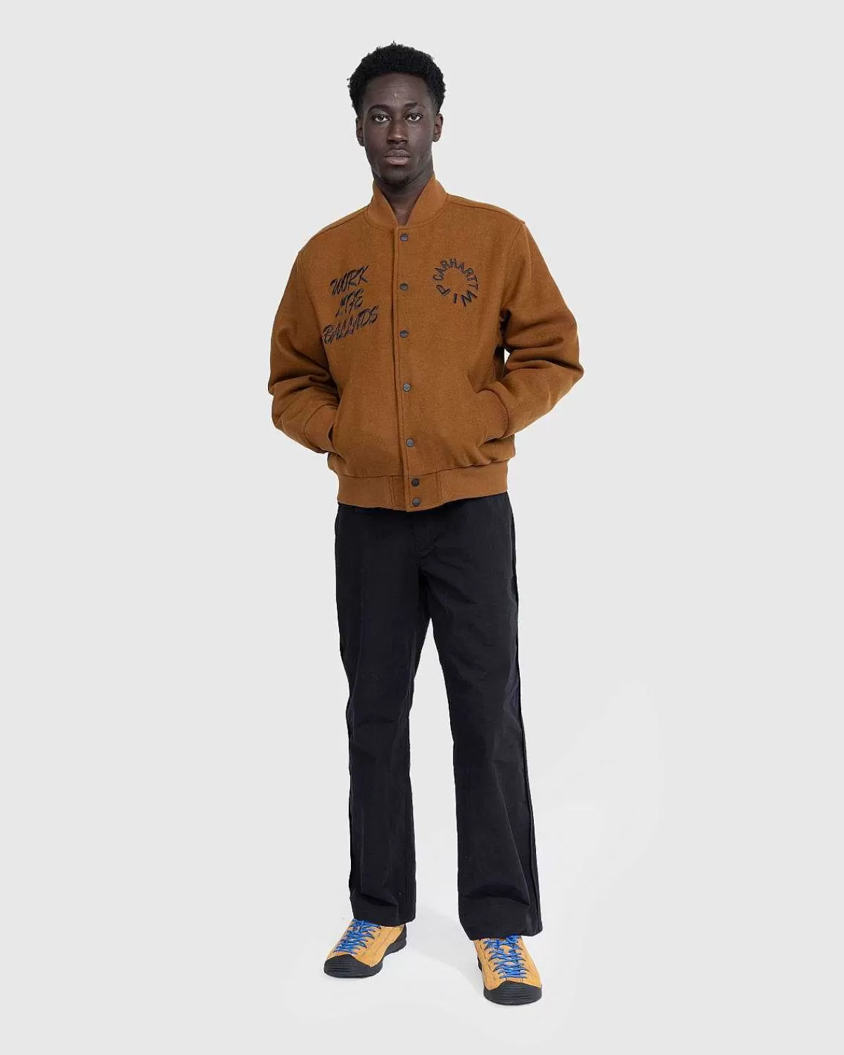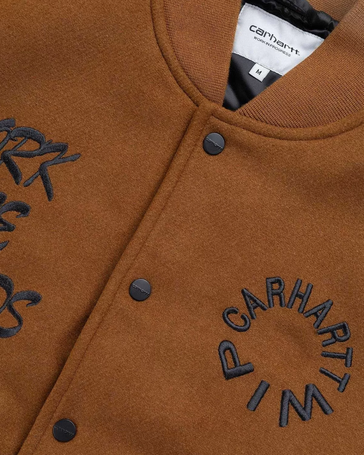 Carhartt Wips Work Varsity Bomber Er Konstrueret Af En Tung Blanding Af Polyester Og Uldstoffer. Den Ankommer Denne Sæson I Mærkets Signatur Deep Hamilton Brown Colorway, Med Knaplukning Foran Og Ribstrikket Kant Ved Kraven, Manchetterne Og Forneden. Welt-Lommer Er Indbygget På Forsiden Af Silhuetten, Da Stykket Er Udsmykket Med Grafisk Broderi På Forsiden Og Bagsiden.