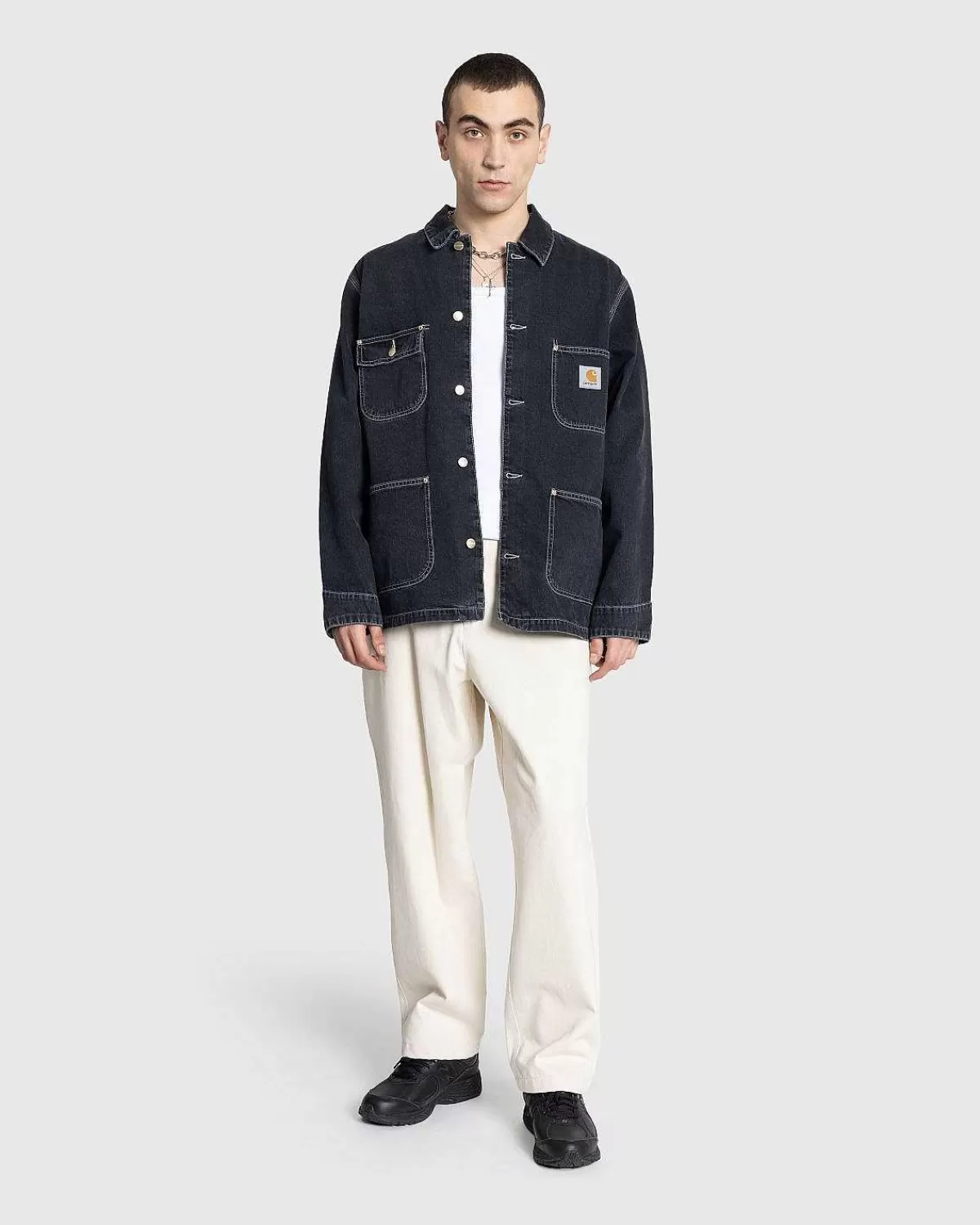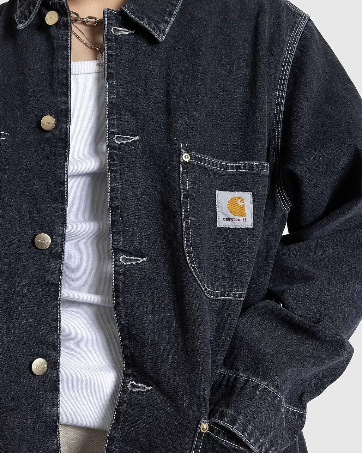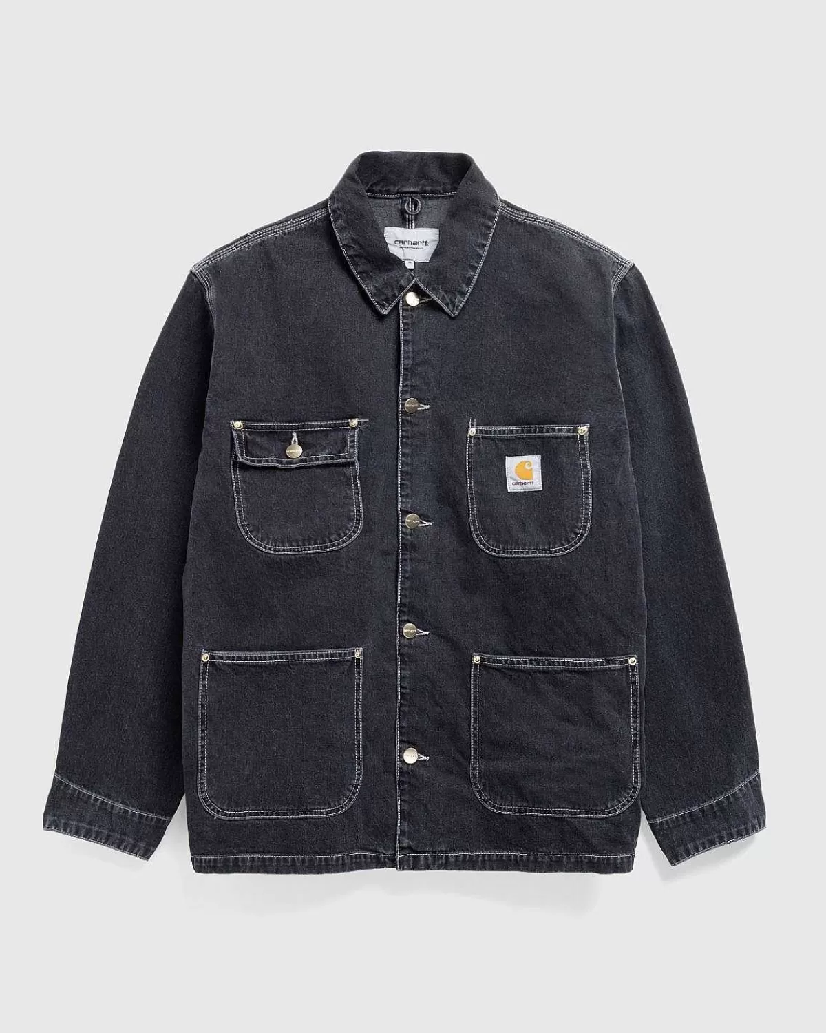 Denne Version Af Og Chore-Frakken Er Konstrueret Af Norco Denim, Et Robust Bomuldstwillstof I Klassisk Arbejdstøjstil. Overtøjet Er Skåret I En Løs Pasform, Der Passer Til Lagdeling, Med Traditionel Knaplukning Foran Og Justerbare Knapmanchetter. Fire Funktionelle Lommer Er Indbygget På Forsiden Af Silhuetten, Som Er Afsluttet Med En Lille Carhartt-Label Syet Til Venstre Brystlomme.