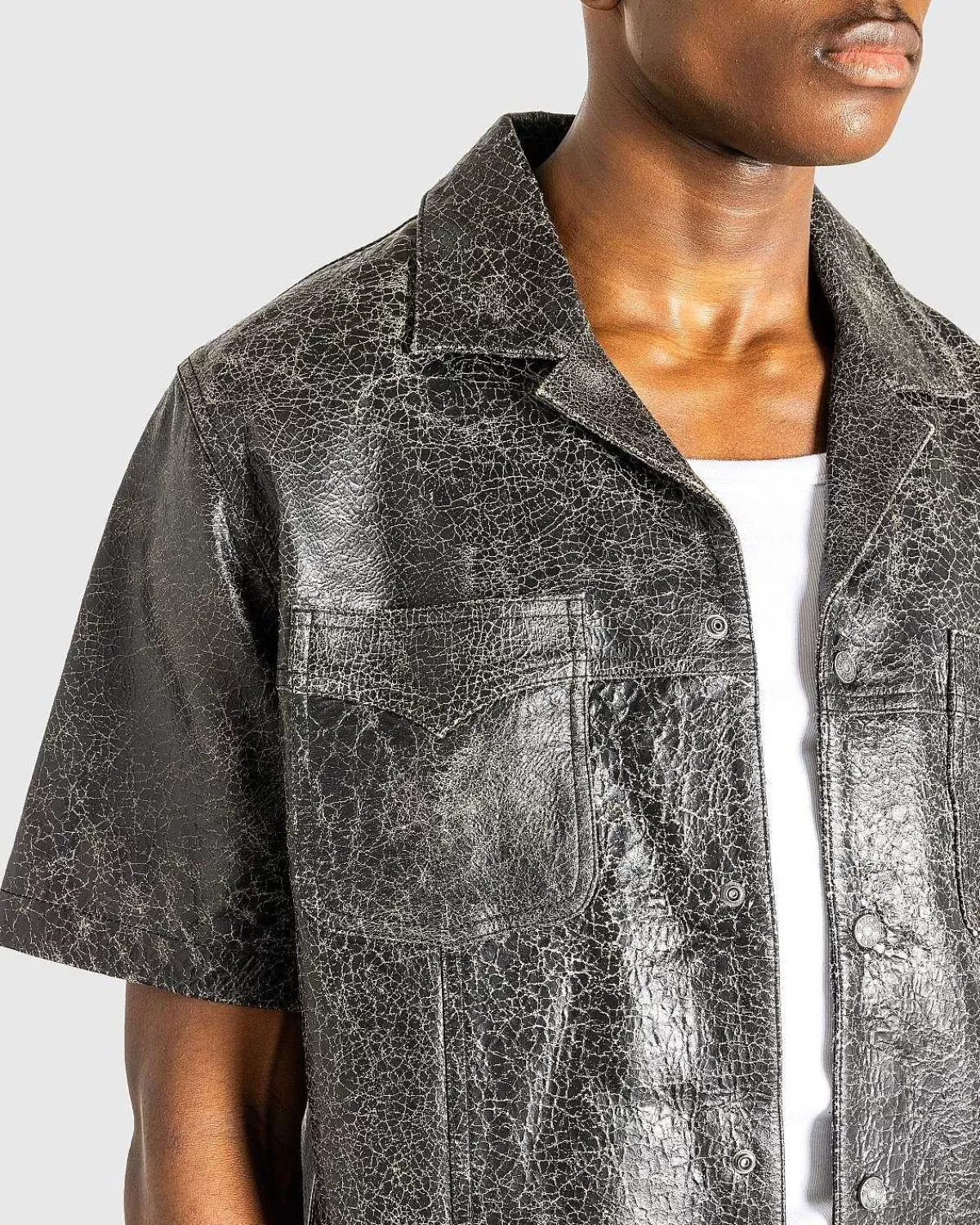 Den Knitrende Læderskjorte Bringer Et Karakteristisk Håndbelastet Look Til En Klassisk Stil. Produceret I 100 % Læder, Tøjet Er Skåret Til En Afslappet, Boxy Pasform, Med En Spredt Krave, Knaplukning Foran, Korte Ærmer Og En Lige Kant. Funktionelle Lommer Er Indbygget På Forsiden Af Tøjet For At Fuldende Designet.
