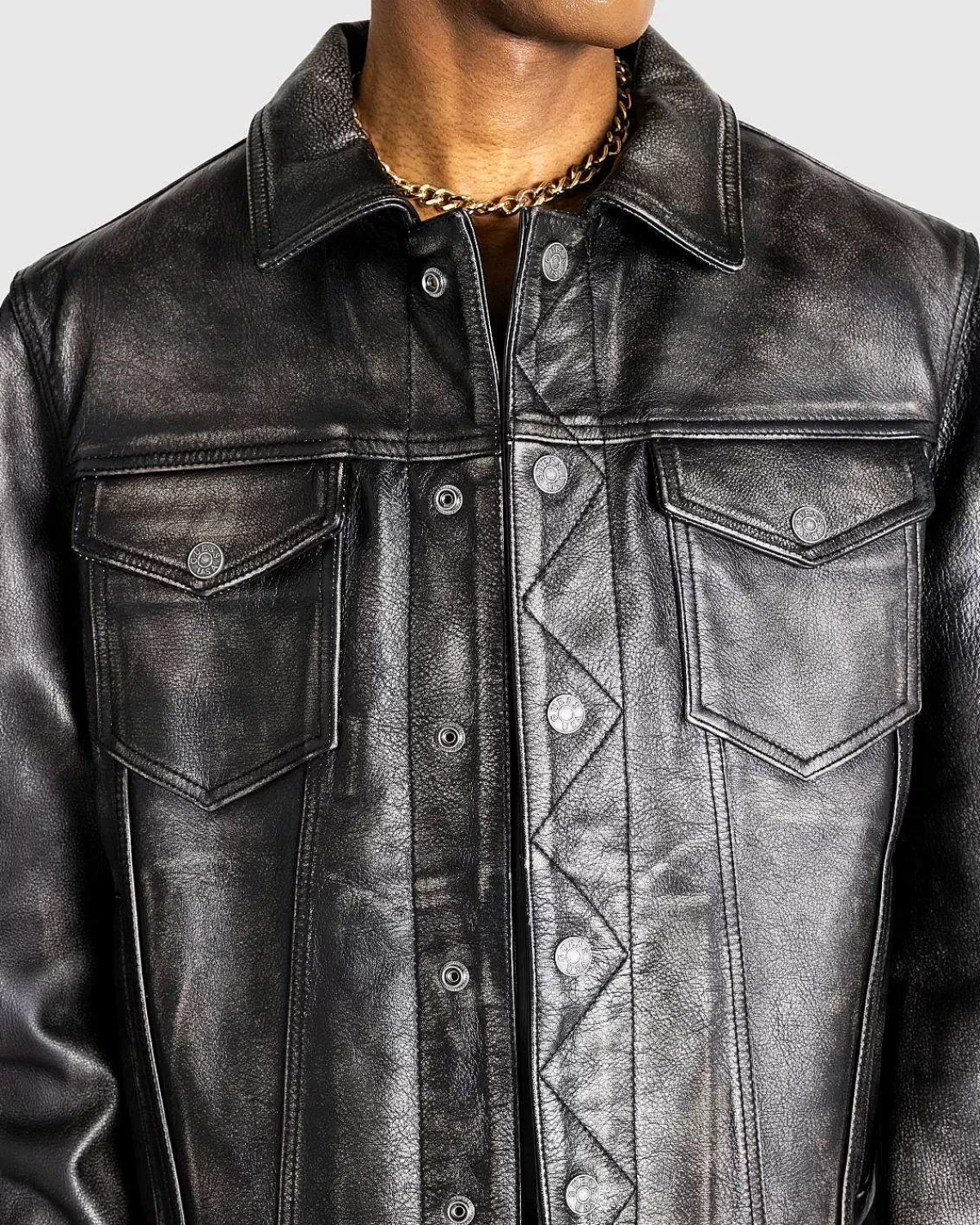 Overtøj>Guess USA Gusa Distressed Leather Trucker Jet Black Multi