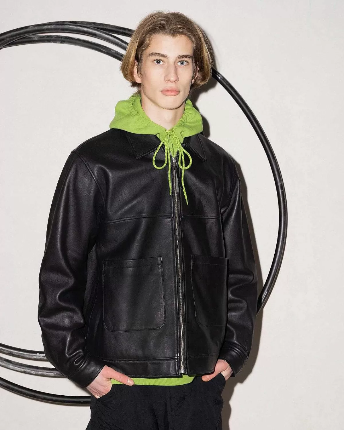 Denne Lynlåsjakke Er Fremstillet Udelukkende Af Blødt Lammelæder Og Kommer Med En Minimal Finish, Der Sætter Fokus På Stoffet. Designet, Der Låner Sin Form Fra Klassiske Arbejdstøjstilarter, Inkluderer To Udvendige Lappelommer. På Indersiden Finder Du Et Satinfor Og En Indvendig Lomme. Yderligere Detaljer Kommer I Form Af En Præget Lynlås, En Subtil Mærkevaremærkat Og En Intern Hængesløjfe Ved Kraven.