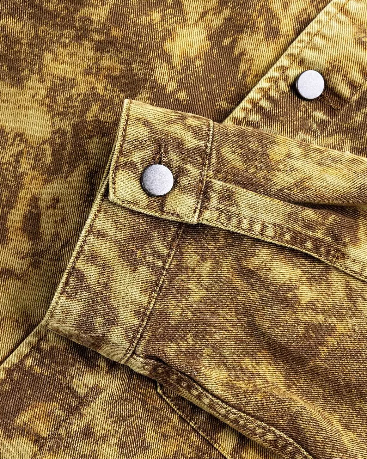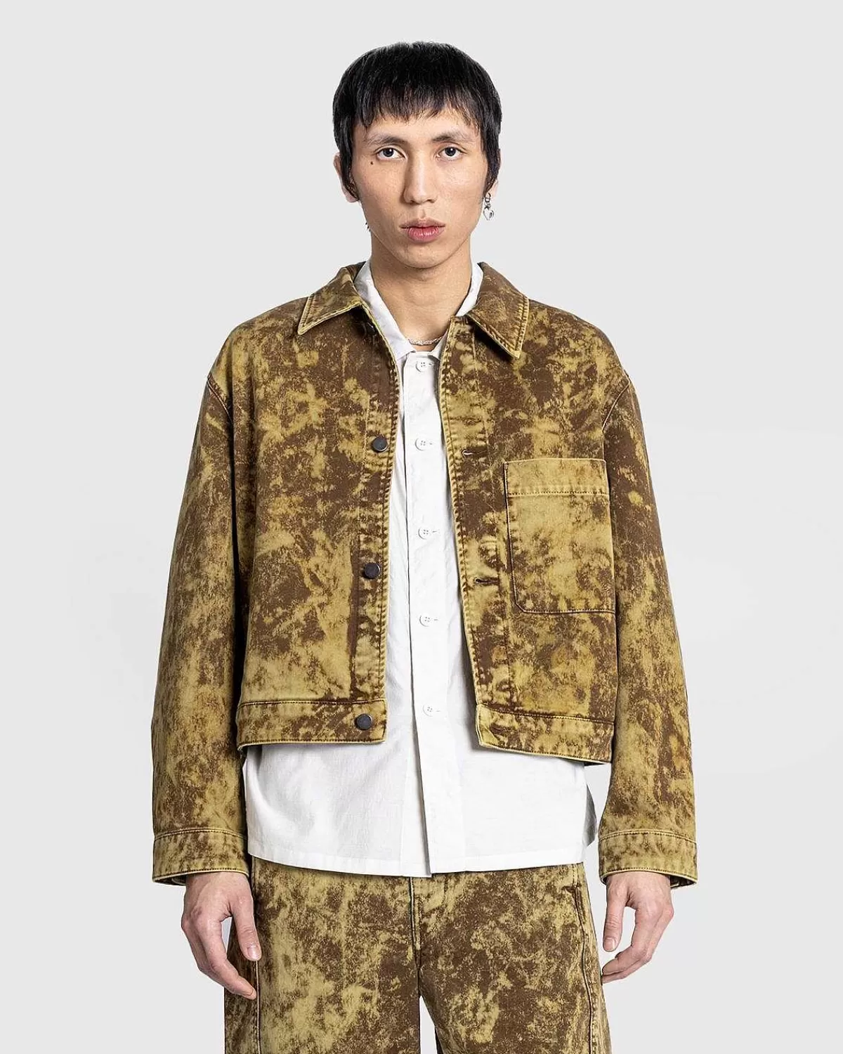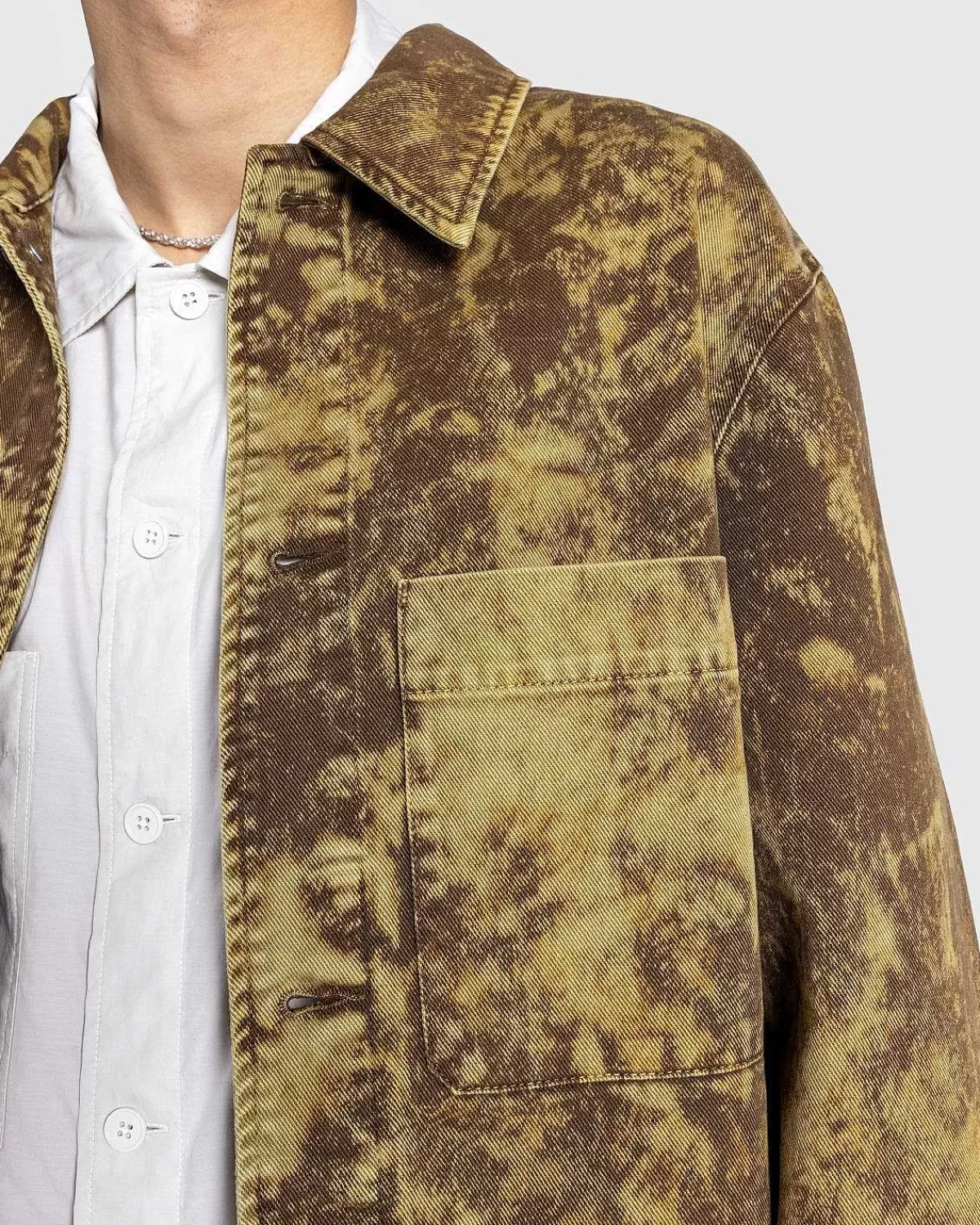 En Hæfteklat Lemaire-Overtøjsstil, Trucker-Jakken Er Lavet Af Et Kraftigt Denimstof Med En Tyk Rund Hånd. Denne Særlige Version Er Defineret Af En Syrevasket Behandling, Der Skaber Et Delikat, Simuleret Slidt Look Med En Ujævn Farvefordeling, Hvilket Gør Hvert Stykke Unikt For Sig Selv. Jakken Er Skåret Til En Klassisk Boxy Pasform Og Detaljeret Med Metalknapper, Samt Lommer Ved Sidesømme Og Venstre Bryst.