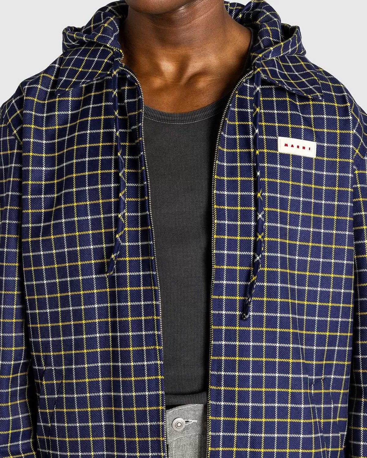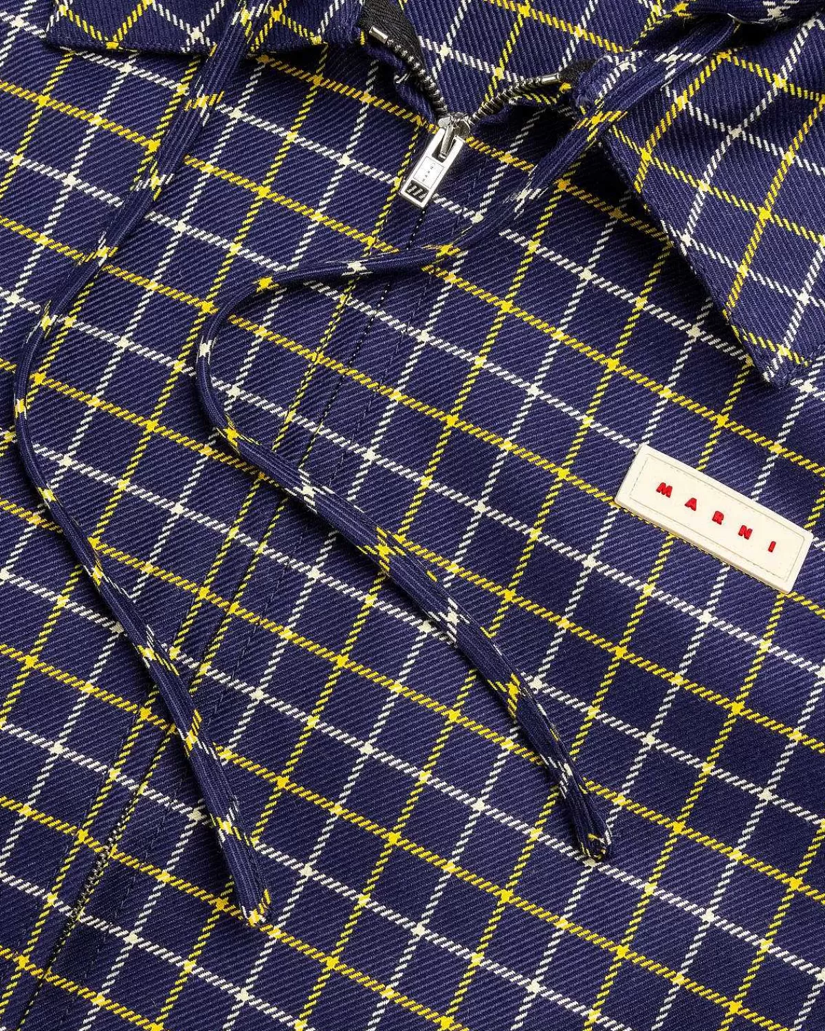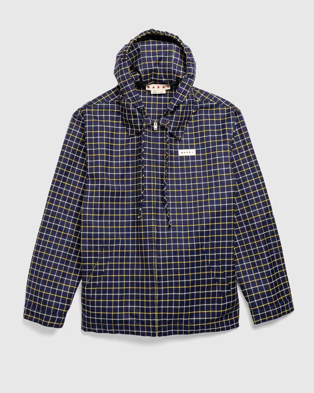 Denne Marni-Stil Er Et Stykke I Lag, Der Er Produceret I Et Virgin Uld- Og Bomuldsblandingsstof, Prydet Med Et Gennemgående Ternet Mønster. Den Har Ikke Kun En Klassisk Krave, Men Den Har Også En Hætte Med Snøre, Der Giver Tøjet En Moderne Kant. Yderligere Detaljer Inkluderer Lynlås Foran, Knapmanchetter Og Søm Og Welt-Håndlommer. Et Gummy Logo Patch Er Påført Brystet For At Mærke Stykket.