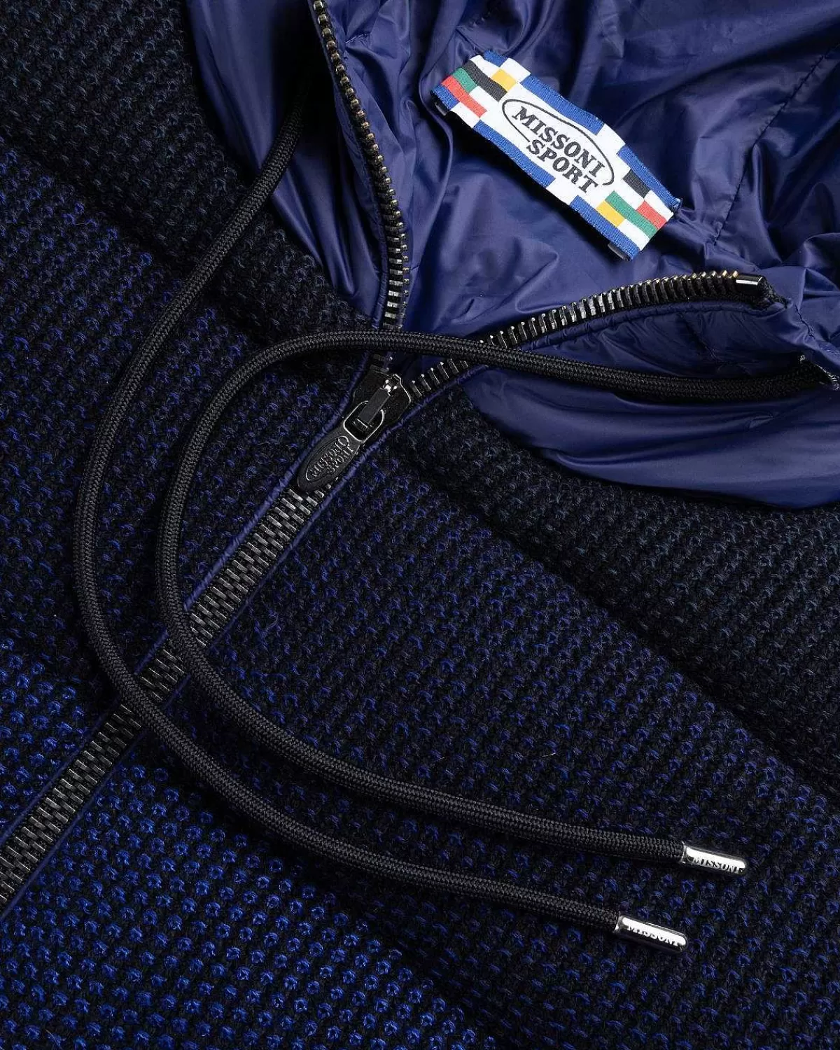 Missonis Dunjakke Med Hætte Fængsler Med En Iøjnefaldende Ombre-Effekt, Der Går Fra Nuancer Af Blå Til Sort. Vinterovertøjsstilen Er Overvejende Lavet Af Et Polstret, Ikke-Stretch Uldblandingsstof, Med Dunfjerfyld For Ekstra Varme Og Komfort. Snørebånd Er Indbygget I Hætten Og Forneden For At Give Mulighed For Mindre Justeringer Af Stylingen, Da Jakken Derefter Afsluttes Med Et Missoni Sport-Logo Påført På Venstre Ærme.