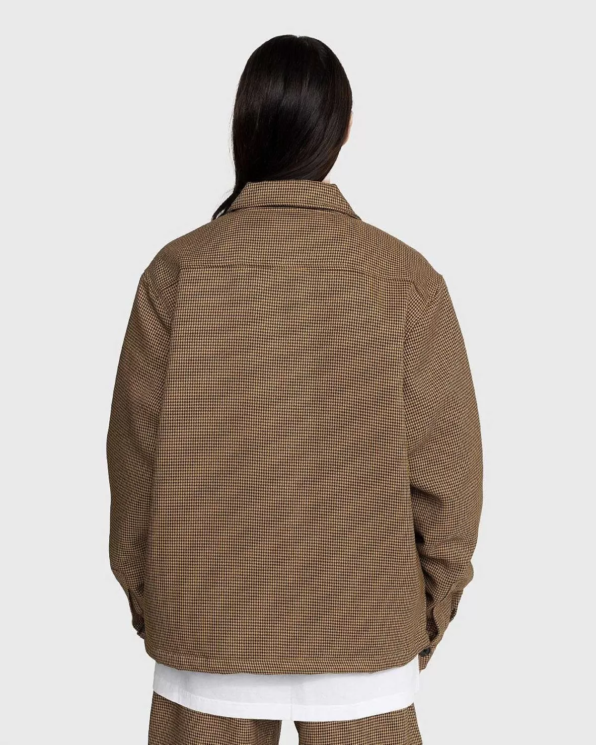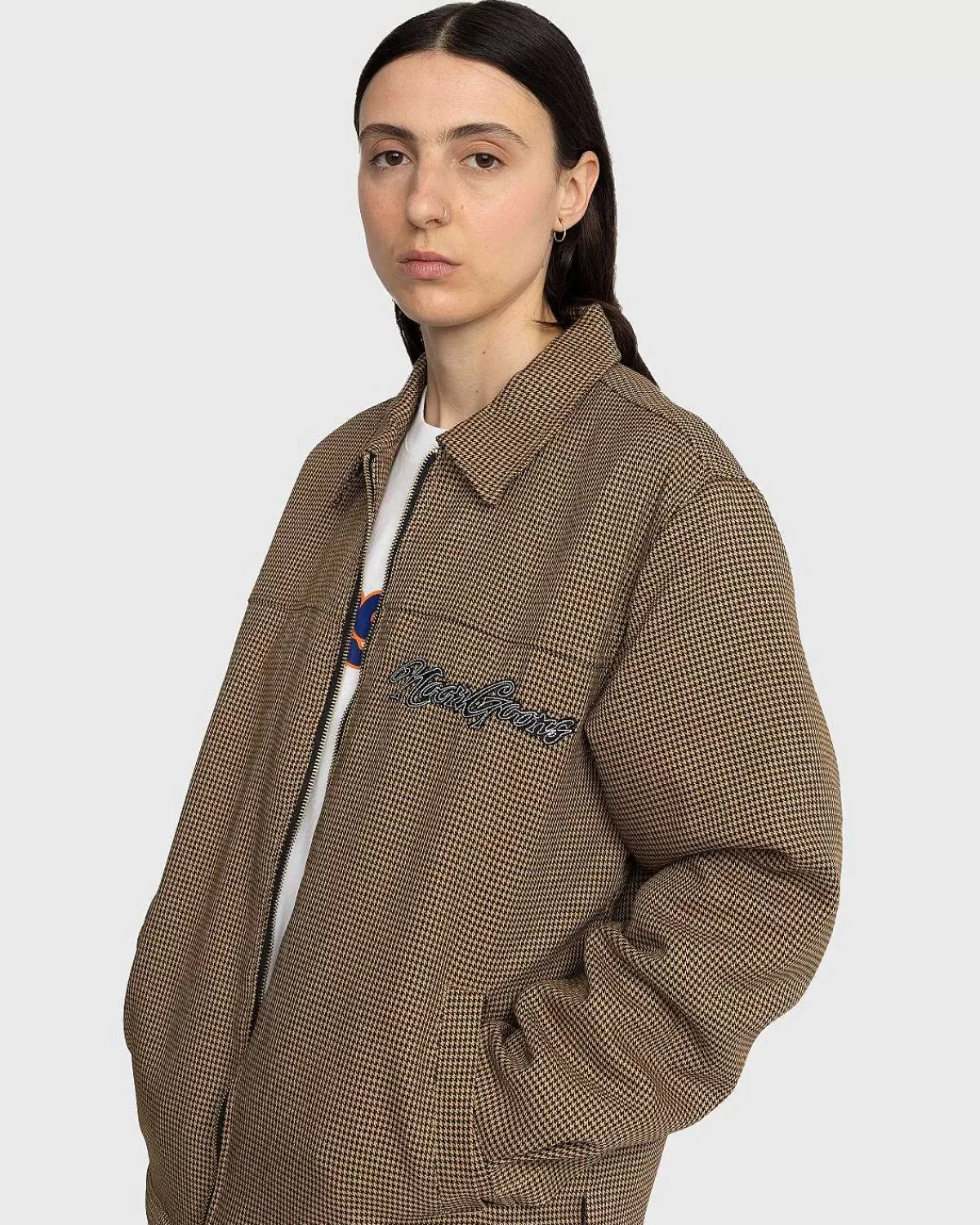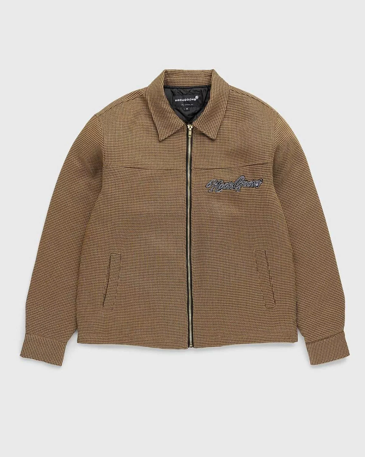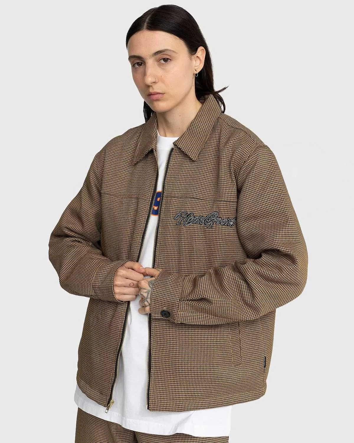 Den Banned Houndstooth-Jakke Er En Arbejdstøj-Inspireret Stil Produceret I 100 % Polyester På Ydersiden, Med Quiltet For. Ud Over At Fremvise Et Houndstooth-Mønster, Er Det Ydre Af Tøjet Yderligere Udsmykket Med Noon Goons-Logobroderi På Brystet. Andre Funktioner Inkluderer Lynlåslukning Foran Og Knapmanchetter, Der Giver Mulighed For Mindre Justeringer, Og Enkelt Håndlommer Samt En Indvendig Lappelomme. Jakken Er Skåret I En Boxy Pasform, Der Er Ægte Størrelse For Et Tidløst Look.