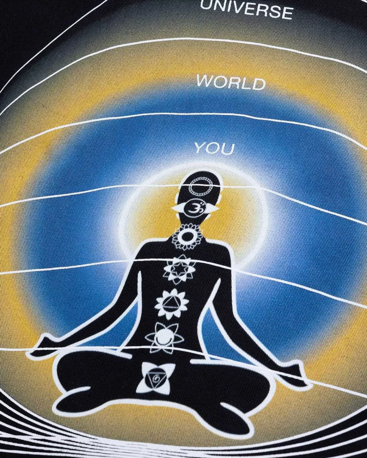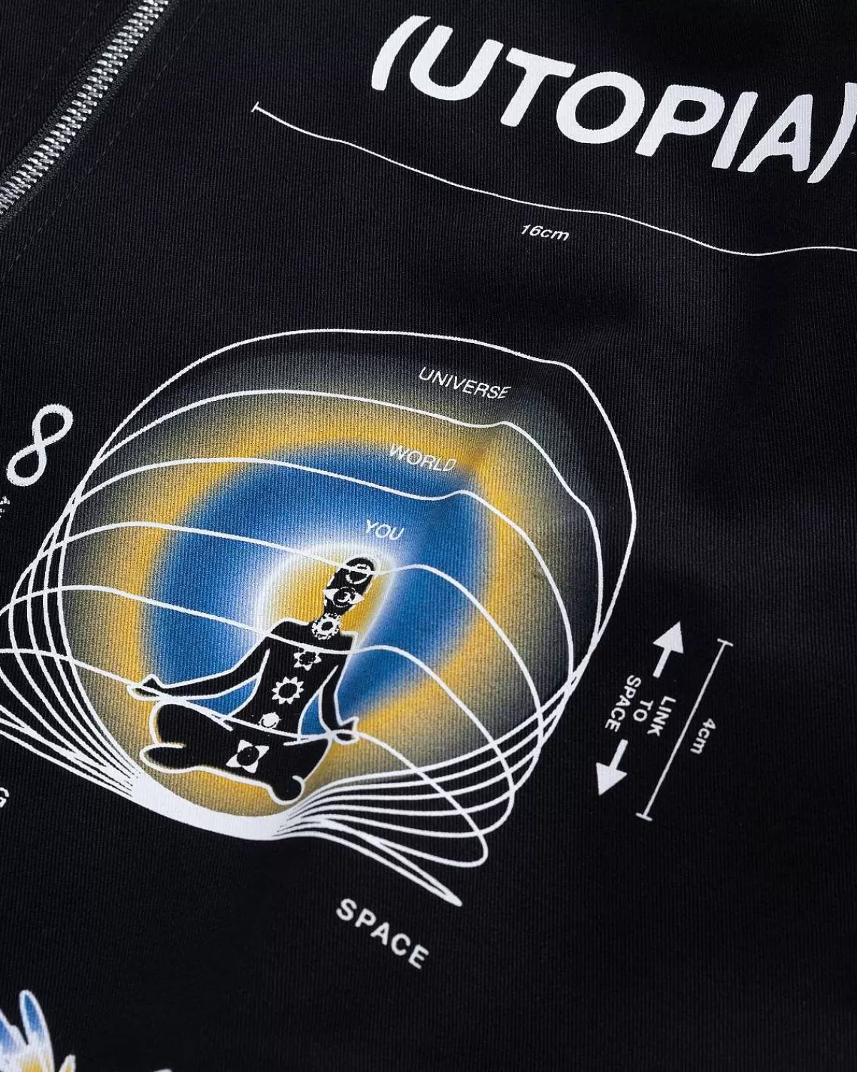 Utopia-Arbejdsjakken Er Lavet Af Genbrugt Bomuld Og Genbrugsbrudt Twill, Med Afskæringer Og Twill Fra Tøjfabrikker I Indonesien. Den Er Udsmykket Med Meditationsspecifik Grafik Udført Hele Vejen Igennem I Vandbaseret Blæk. Jakkens Medfølgende Svingmærke Er Produceret I Genbrugsplast Og Kan Genbruges Som Bordskåner Eller Dekorativt Skrivebordsobjekt.