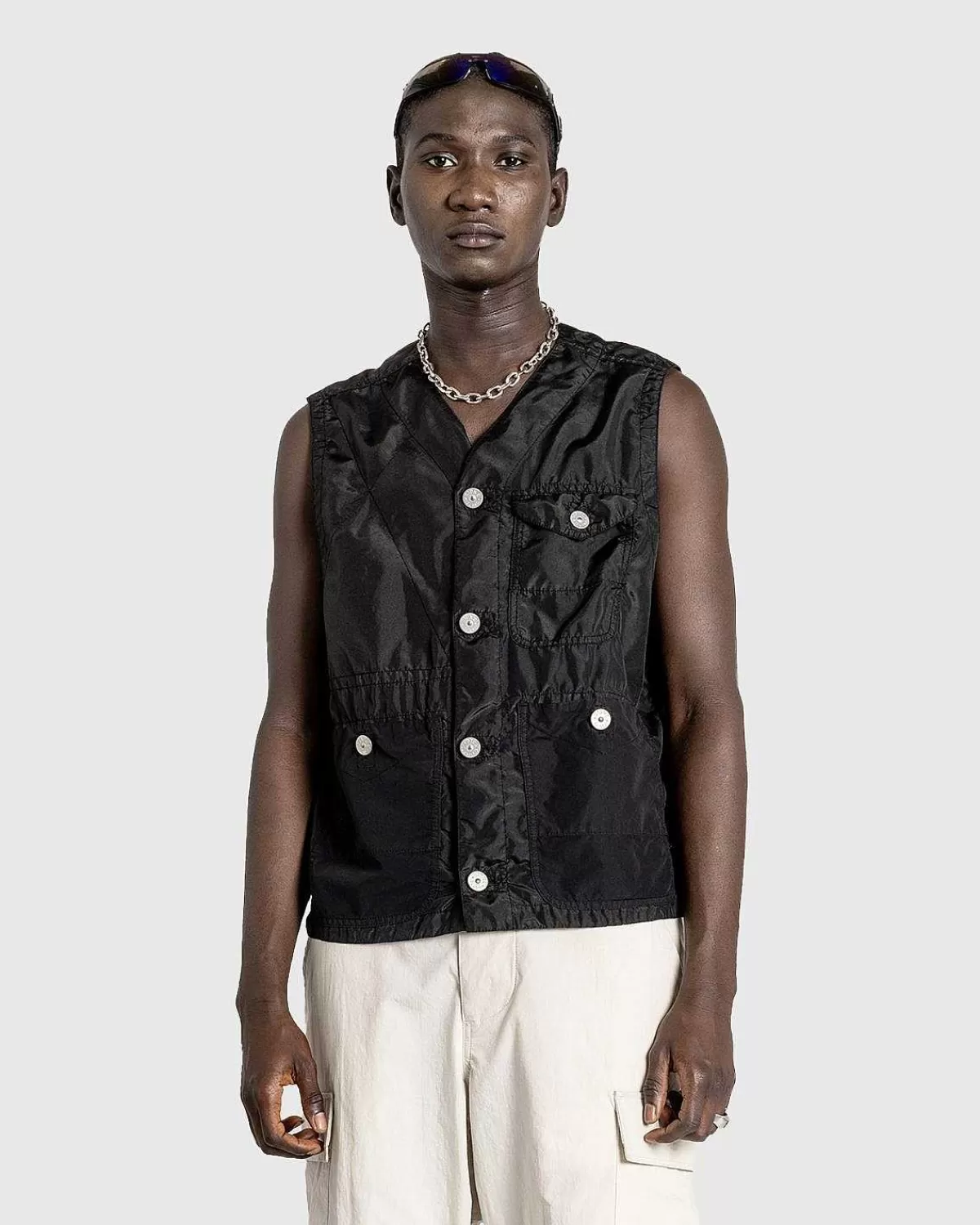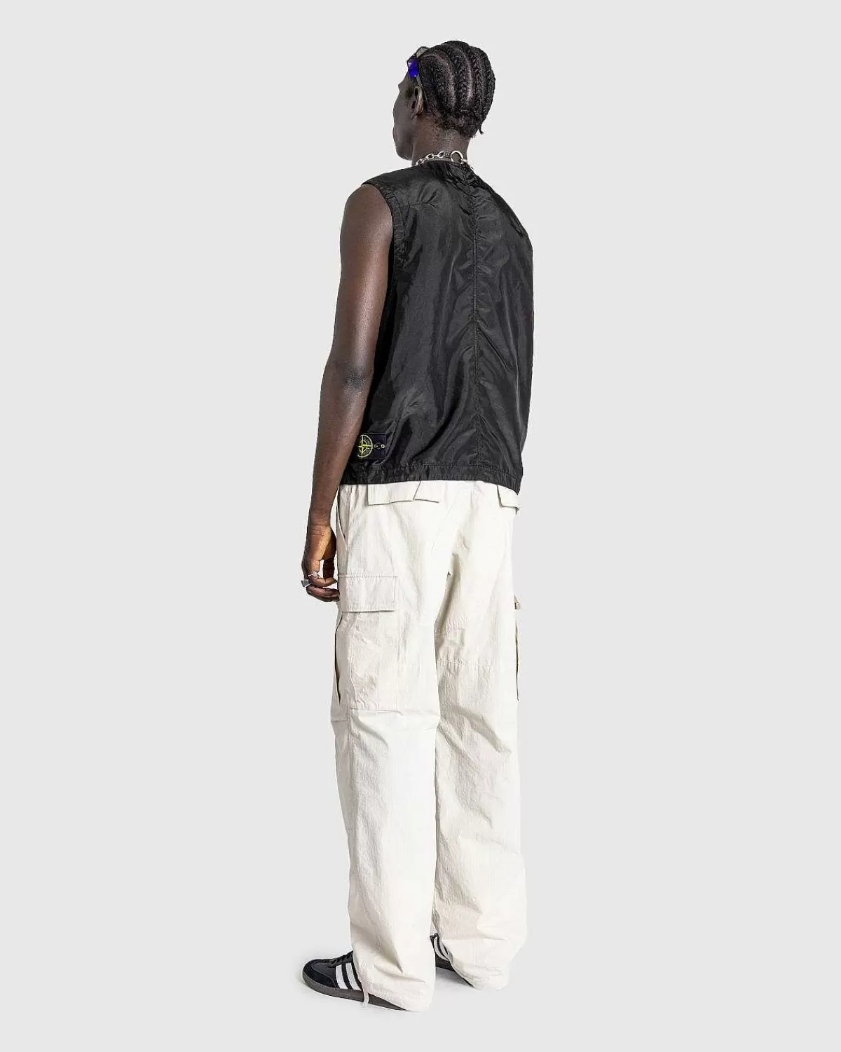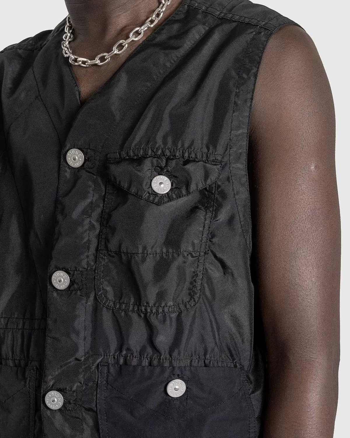 Denne Stenø-Vest Er Et Teknisk Lagdelt Stykke, Der Er Overvejende Produceret I Genbrugspolyester Og Har En Beklædningsfarvet Finish. Tøjet Er Vandafvisende Og Skåret Til En Standard Pasform. Den Har Ay-Hals, Knaplukning Foran Og En Række Lommer Indbygget På Forsiden Af Silhuetten. Ud Over Logoindgraveret Hardware Er Stykket Yderligere Udsmykket Med Det Ikoniske Stone Island-Logomærke I Venstre Side Af Vesten.