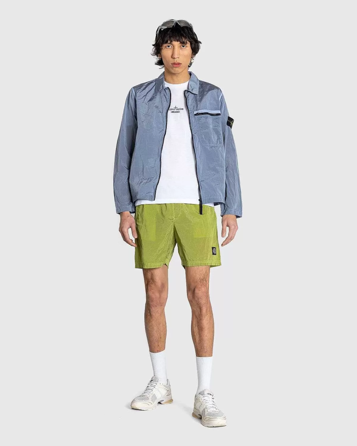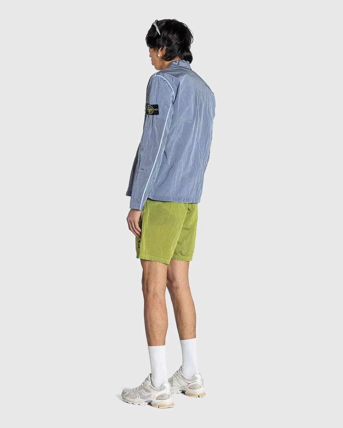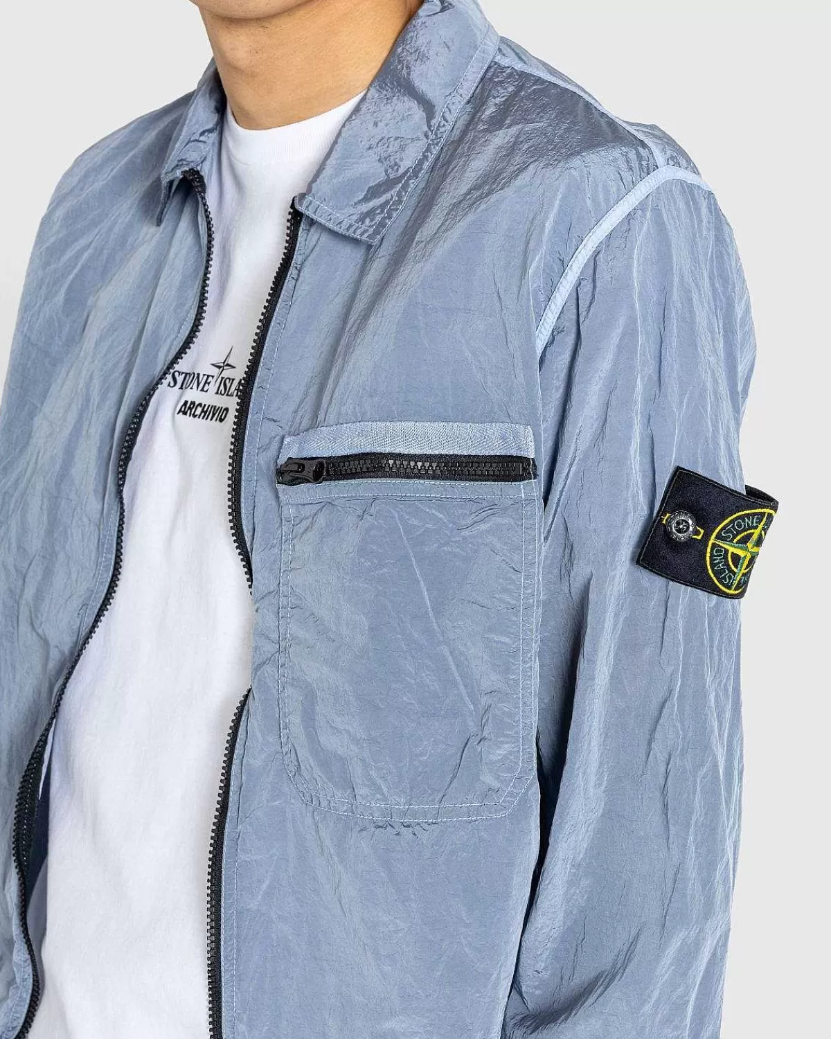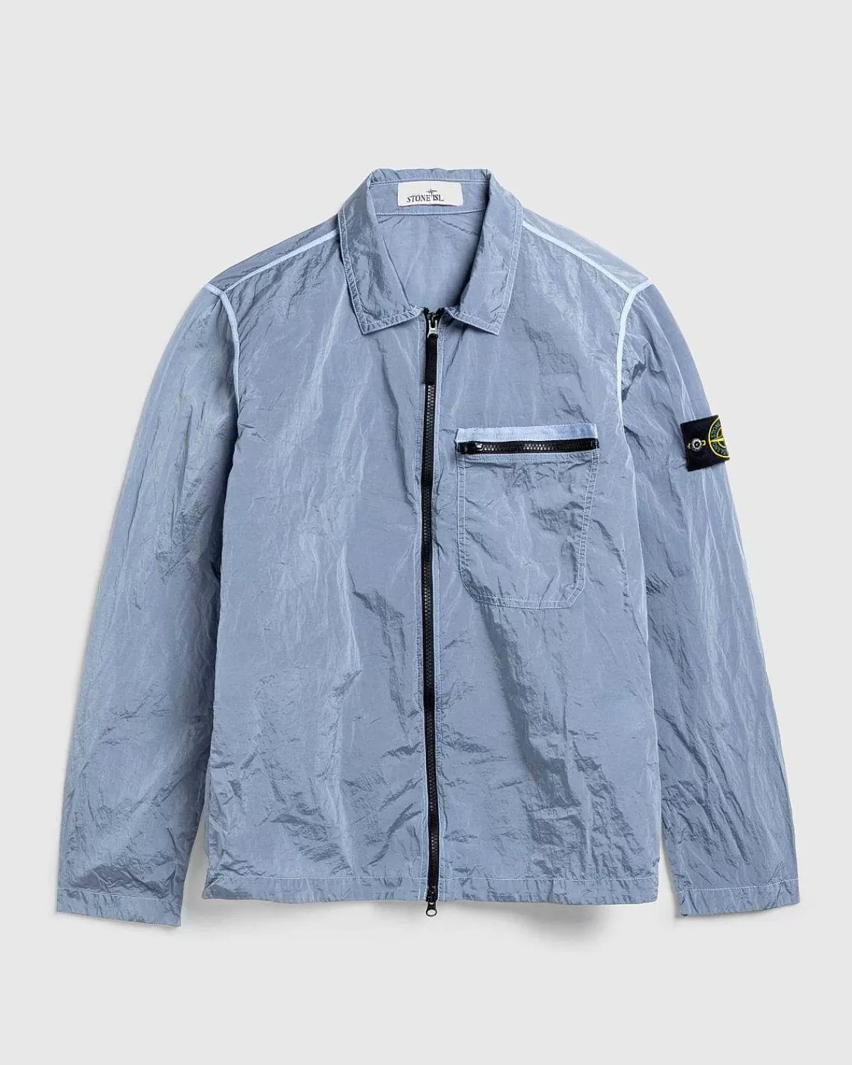 På Ægte Stone Island-Mode Er Nylonmetalovertrøjen Kendetegnet Ved Mærkets Karakteristiske Beklædningsfarvningsbehandling. Det Fjeragtige Overtøj Er Fremstillet Ved Hjælp Af Et Let, Holdbart, Harpiksbelagt Stof Sammensat Af Mekanisk Spundet Nylon. Den Vand- Og Vindafvisende Overtrøje Har Tovejs Lynlåslukning I Midten, Og Er Udstyret Med En Enkelt Brystlomme Med Lynlås.