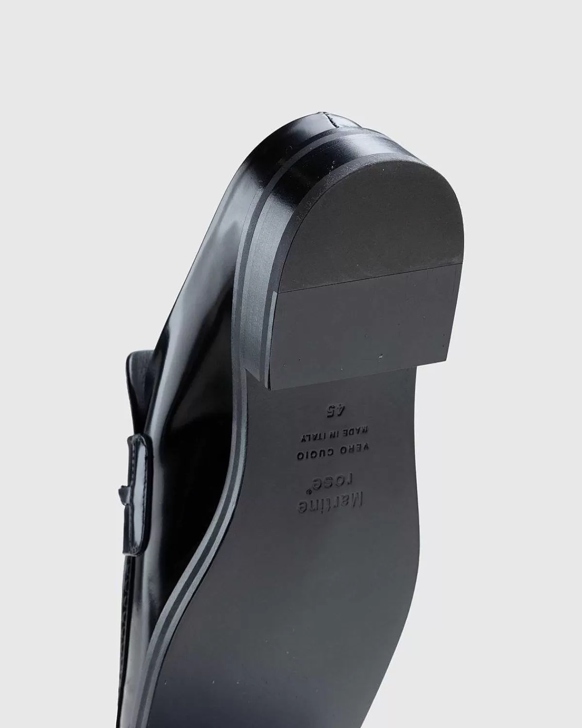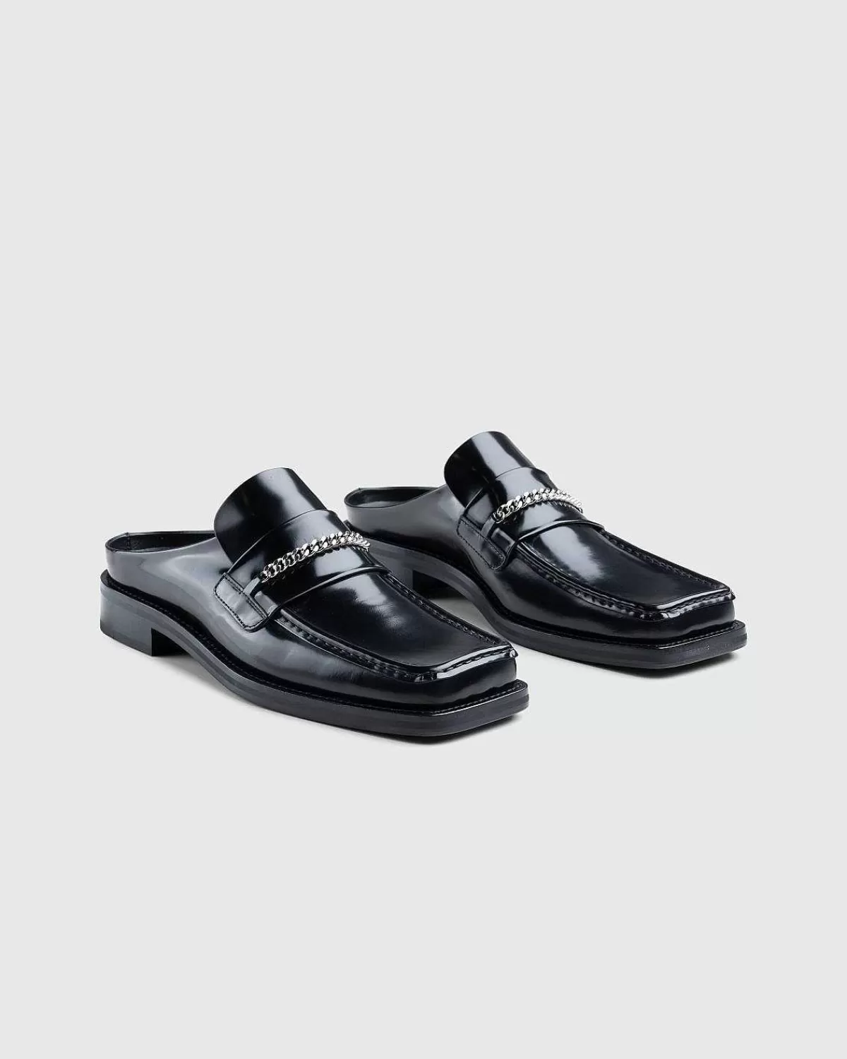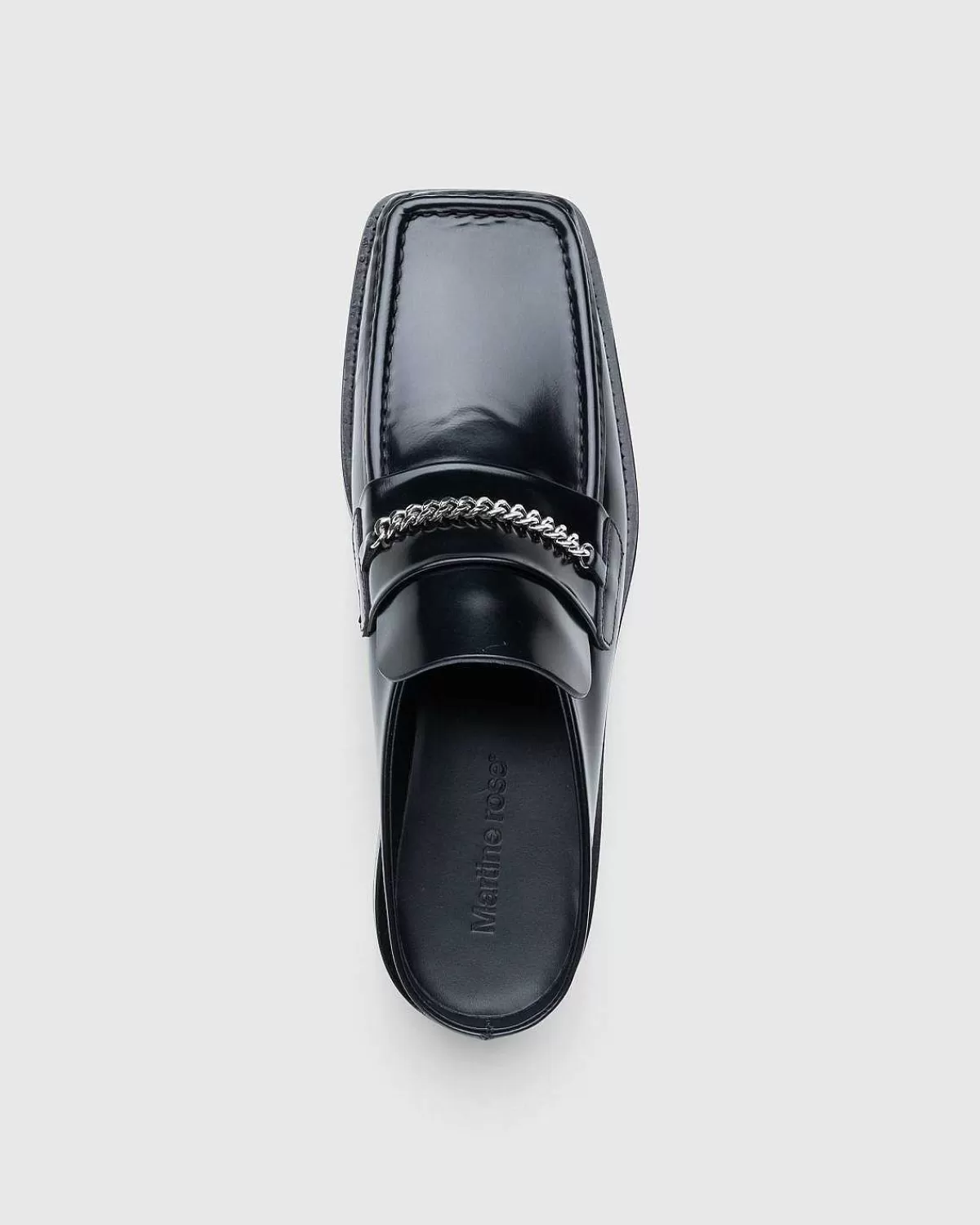 Martine Rose Kommer Igennem Med Et Luksuriøst, High-Fashion Take På Slip-On Mule. Denne Nye Stil Er Lavet Af Premium Bovint Læder, Med En Metalkædedetalje På Forfoden. En Firkantet Moc Toe Definerer Derefter Silhuetten, Da Parret Er Afsluttet Med En Logopræget Fodseng, Der Fungerer Som Det Enlige Branding-Hit.