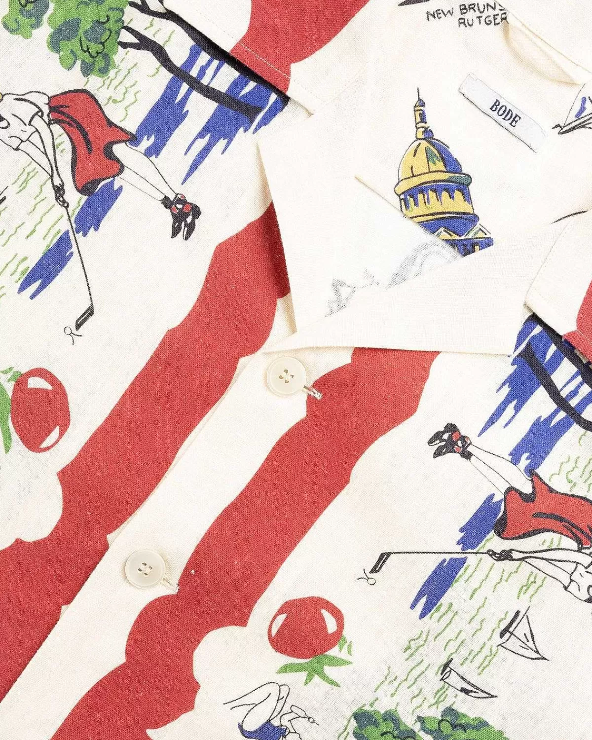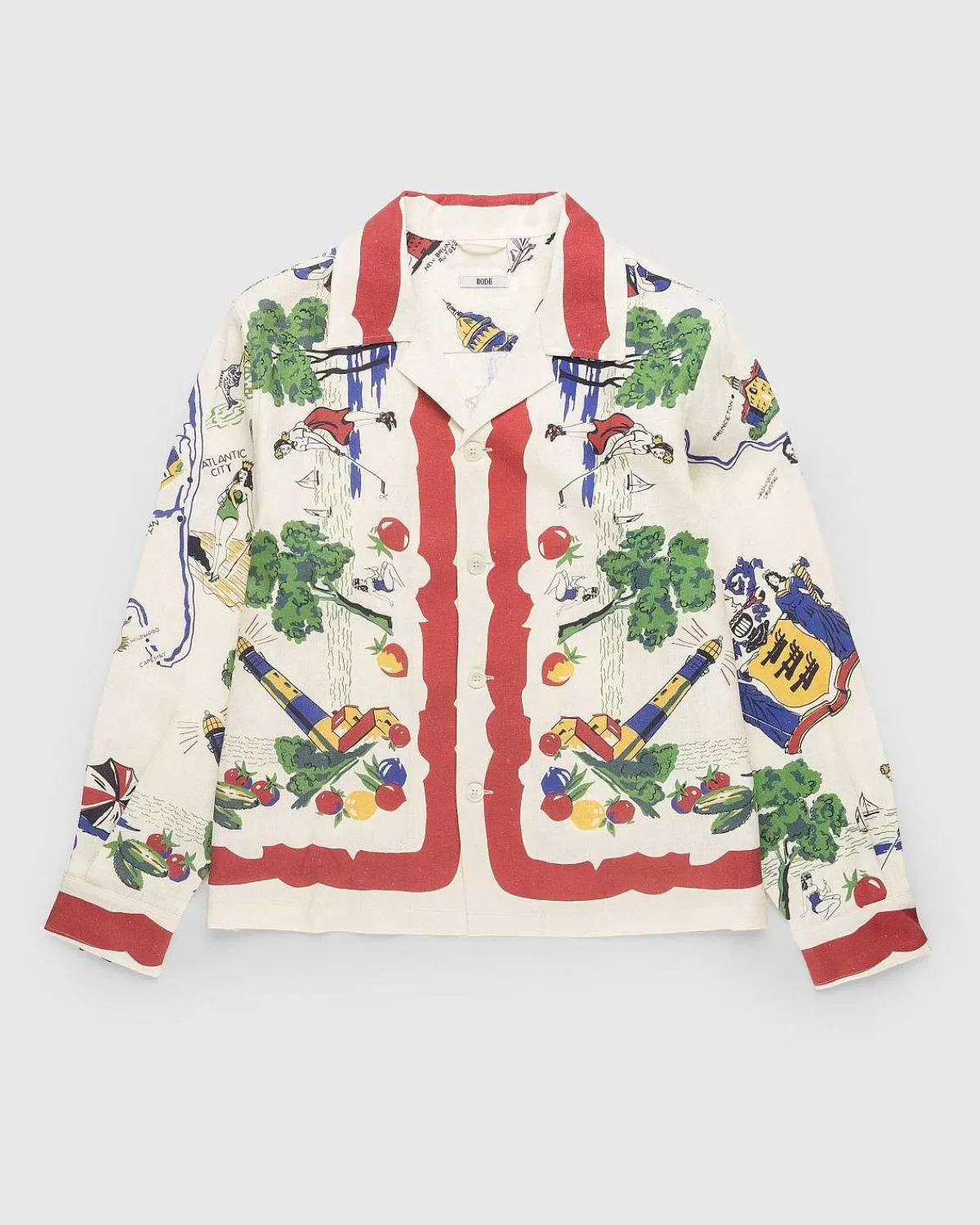 The Garden State-Skjorte Henter Inspiration Fra En Nyhedsdug Fra Midten Af Århundredet, Sandsynligvis Et Souvenirstykke Produceret Under Efterkrigstidens Turismeboom. En Replikering Af Kludens Originale Illustration Med New Jersey-Landemærker, Aktiviteter Og Motiver Er Igen Implementeret I Hele Silhuetten. Skjorten Er Lavet Af 100 % Hør Og Har En Lejrkrave, Knaplukning Foran Og Knapmanchetter Og Har En Klassisk Boxy Pasform.