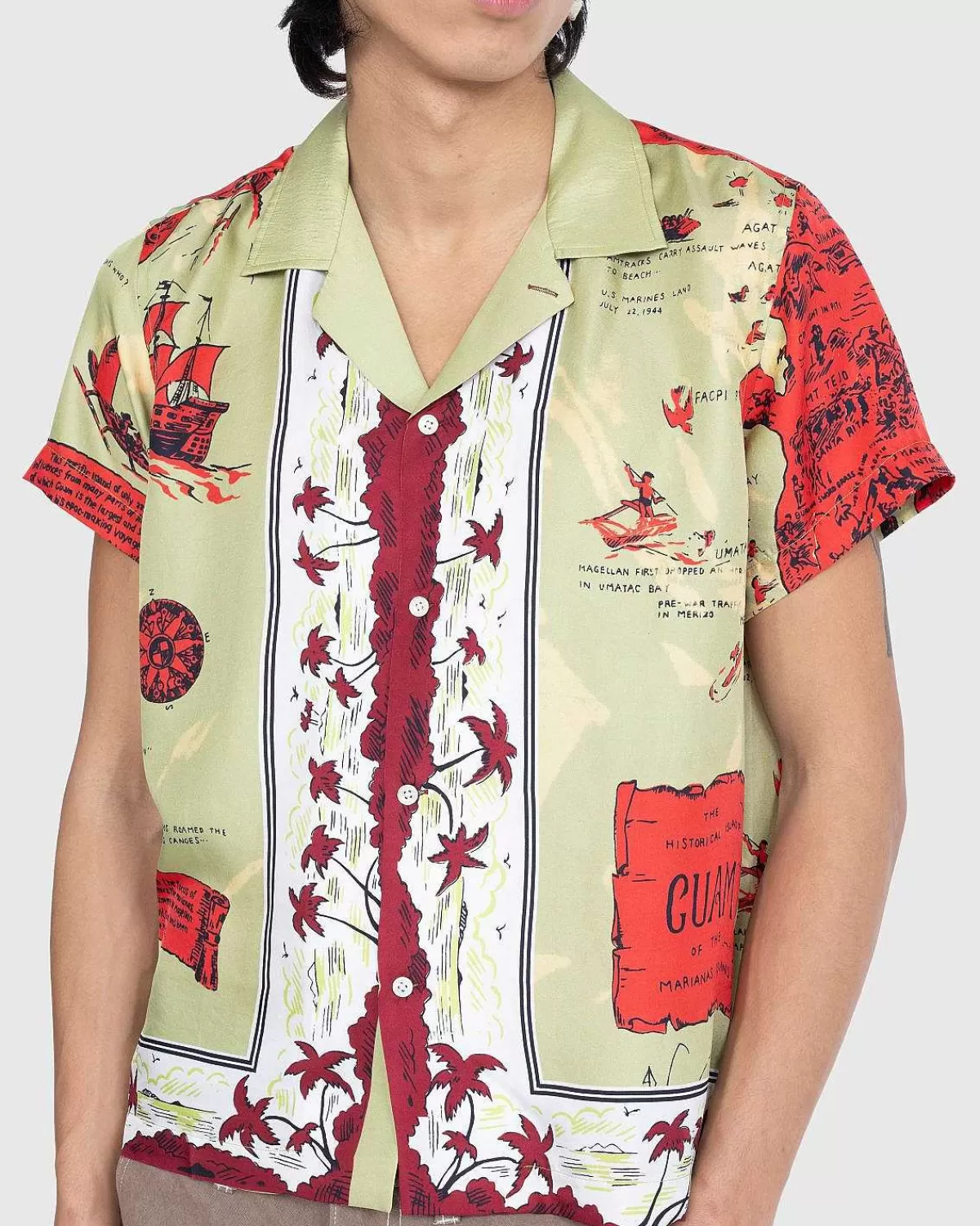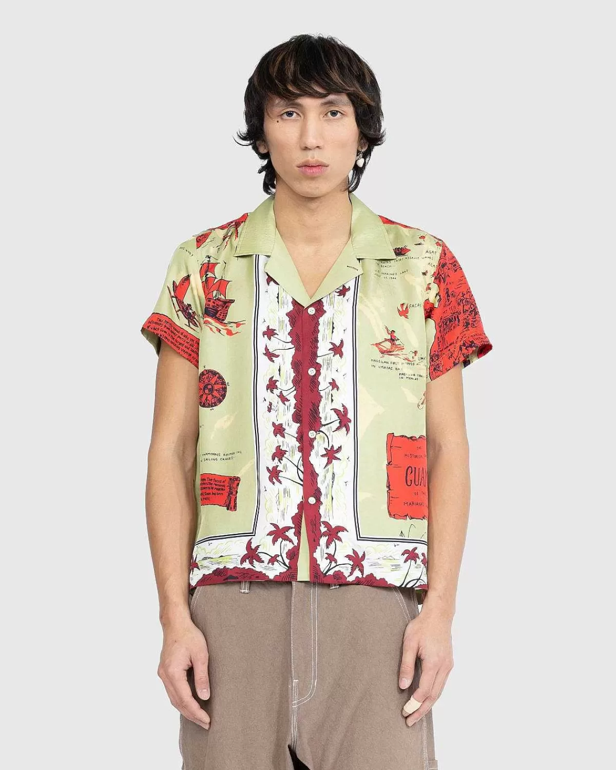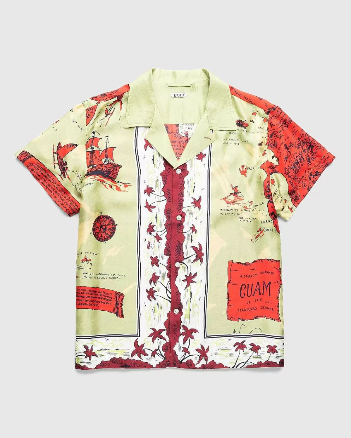 Bode Hentede Inspiration Fra Et Souvenir-Tørklæde Omkring Det Tidlige 20. Århundrede Og Gengav Dette Særlige Tryk For At Skabe Den Helt Nye Guam-Skjorte. Toppen I Feriestil Er Lavet I Indien Af Silke Og Fremviser Et Farverigt Motiv Med Illustrationer, Der Fremhæver Guams Historie. Skåret Til En Boxy Pasform, Den Kortærmede Skjorte Har En Spredt Krave, Knaplukning Foran Og En Lige Kant.