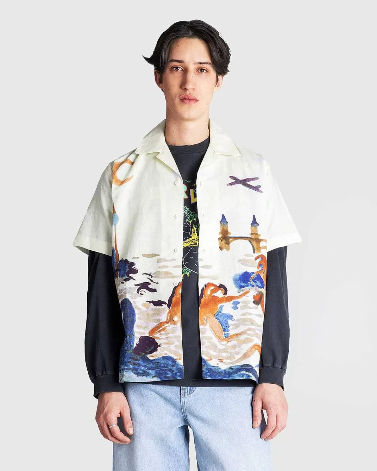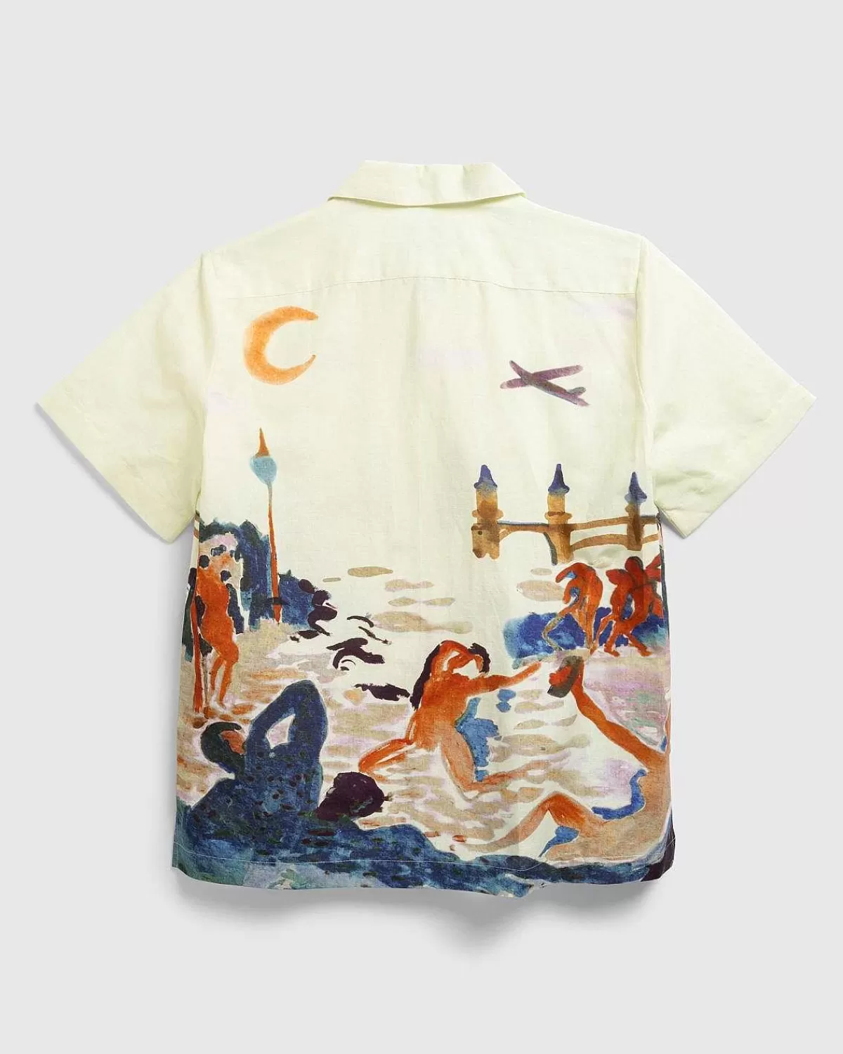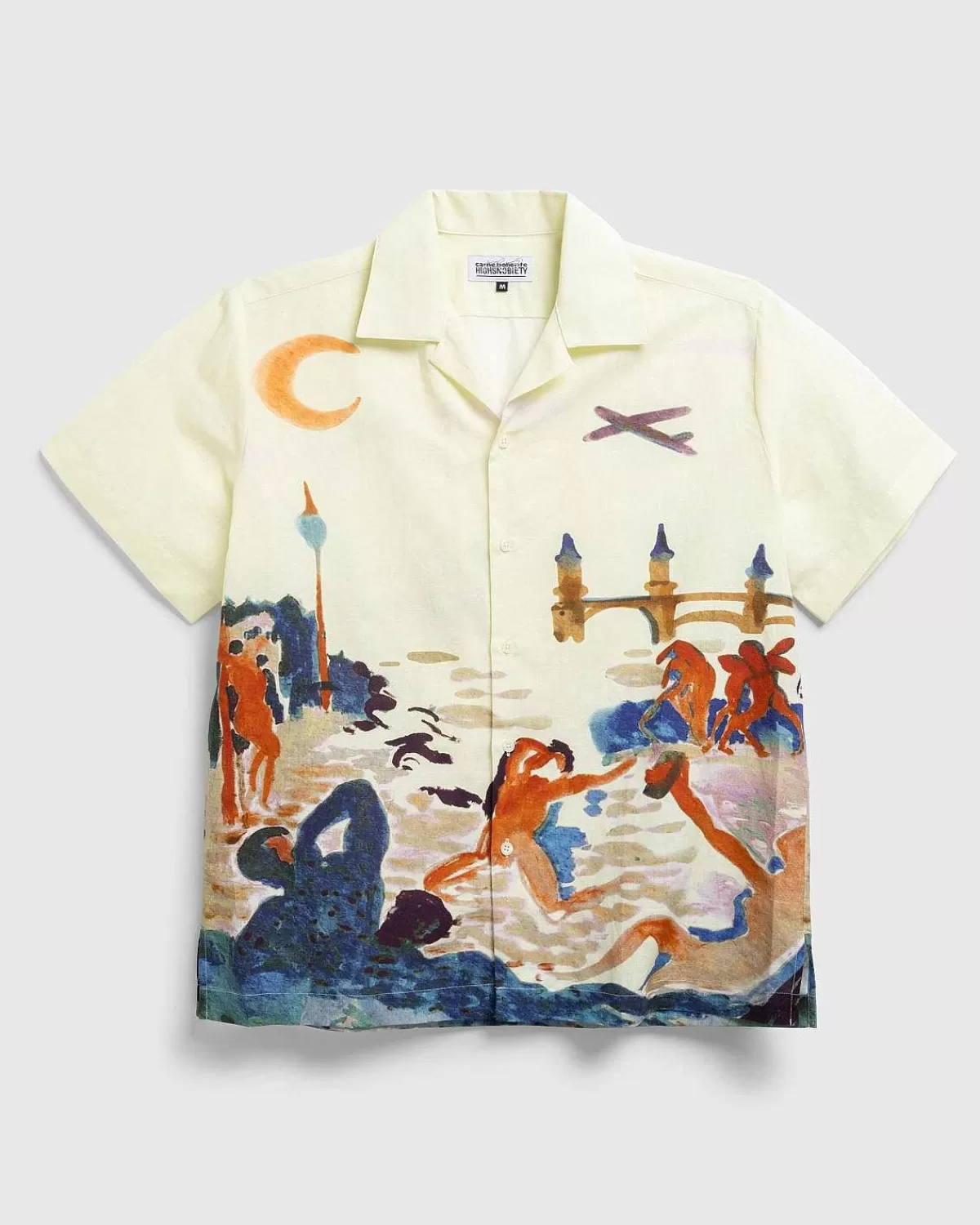 Denne Lejrkraveskjorte Lavet Af En Hør-Bomuldsblanding Er Forvandlet Til En Forførende Scene Prydet Med Carne Bollentes Legende Billedsprog. Nøgenbilleder Er Afbildet, Der Behager Sig Selv Og Danser I Måneskin Med Berlins Oberbaumbrücke, Der Fremhæver Landskabet. Den Kortærmede Top Er Afsluttet Med Print Og Kommer Med En Delt Kant Og Et Co-Branded Vævet Mærke Indeni.