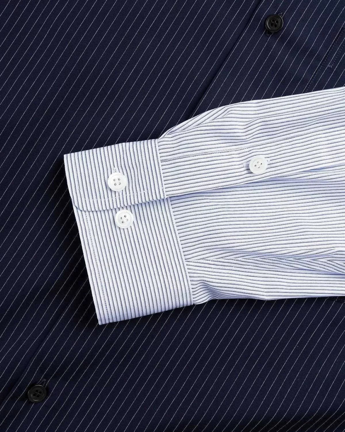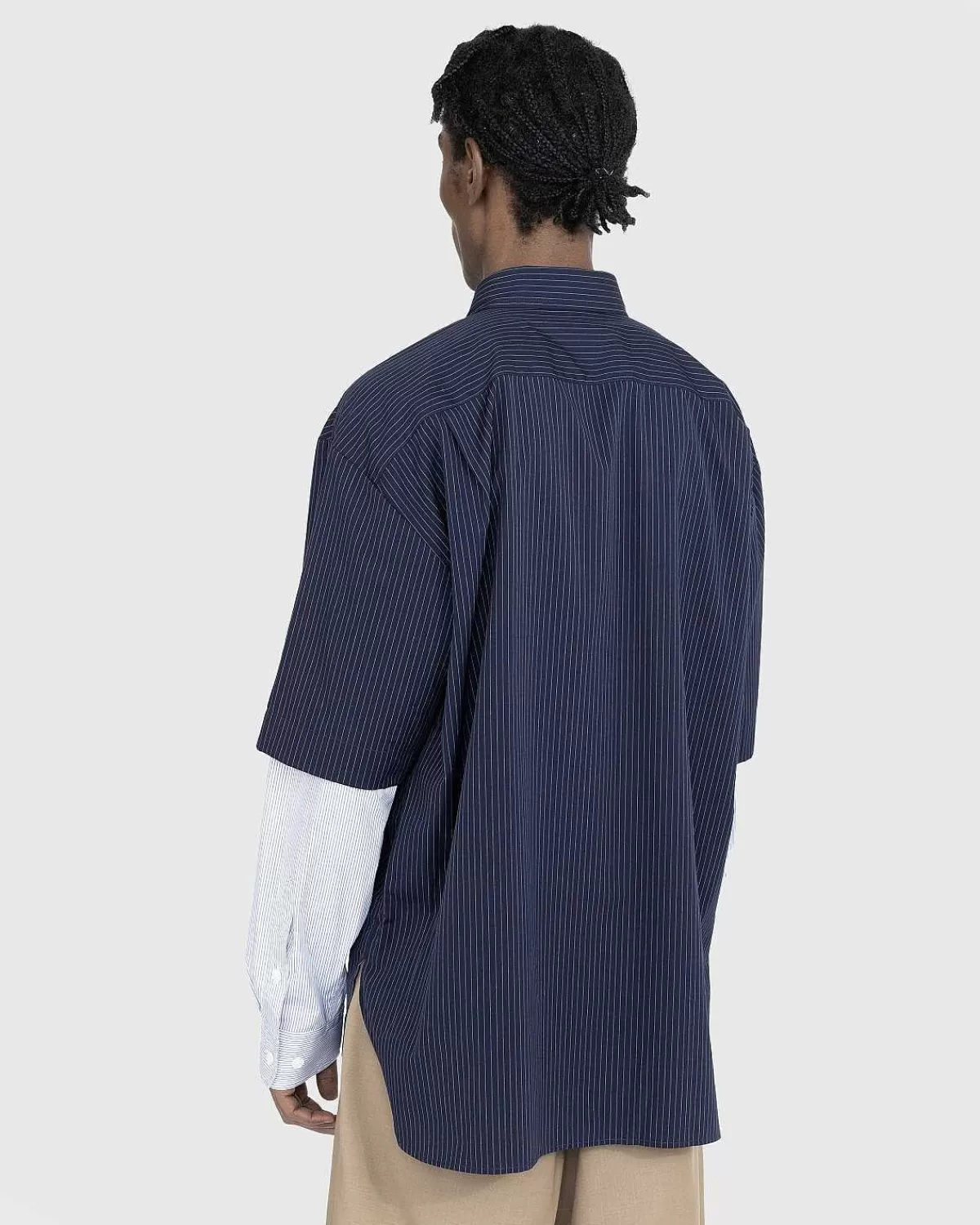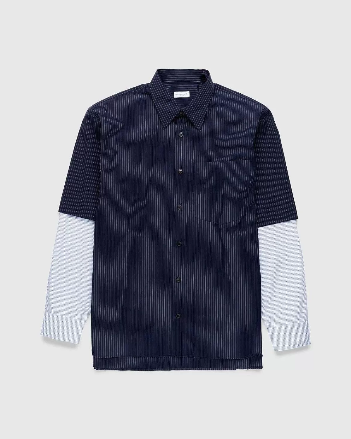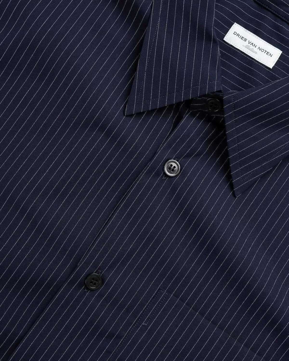 The Carle Er En Karakteristisk Button-Down-Stil Af Dries Van Noten, Der Ankommer Denne Sæson I En Alsidig Marinefarve. Beklædningsgenstanden Er Produceret I 100 % Bomuld Og Er Defineret Ved Kontrasterende Dobbeltærmer, Alt Sammen Mens Den Viser Et All-Over Nålestribet Design. Skjorten Er Detaljeret Med En Spids Krave, Knapmanchetter Og En Enkelt Brystlomme Og Er Skåret I En Løs Pasform Til Ekstra Behagelig Brug.