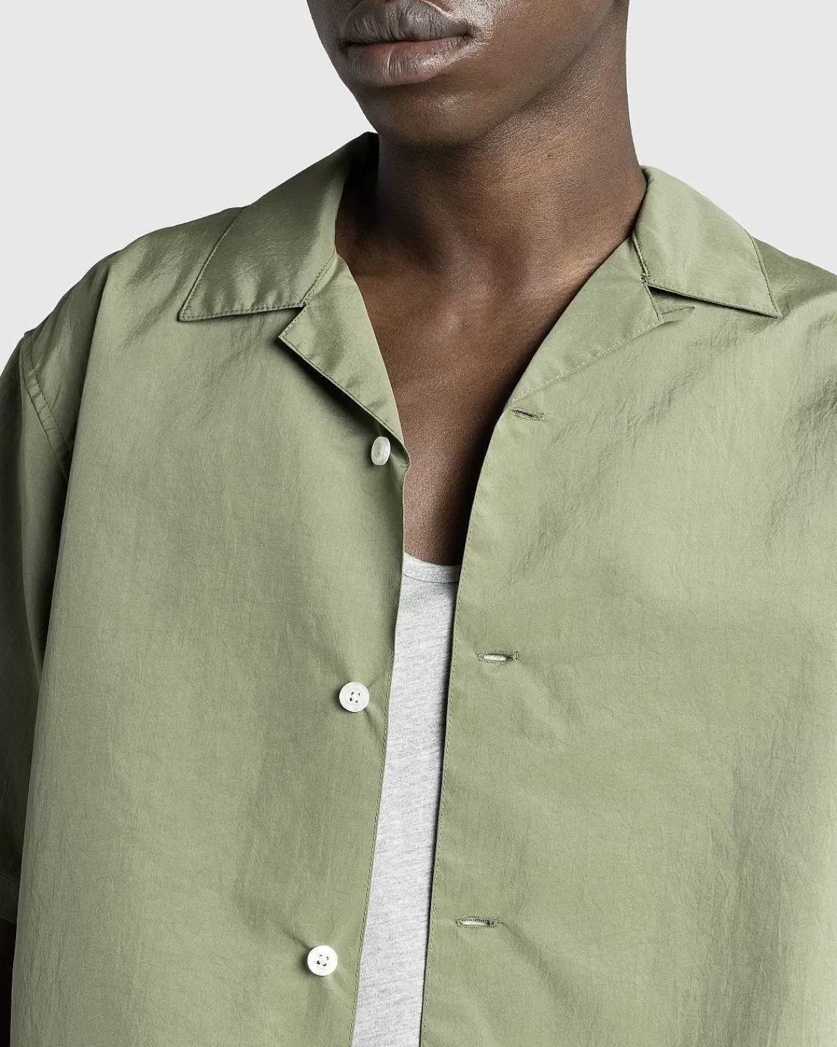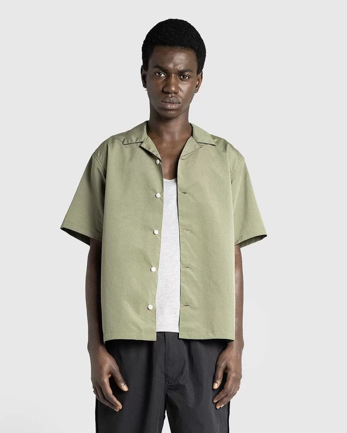 Let Og Med En Afslappet Lejrkrave Er Denne Kortærmede Topskjorte Lavet Af Japansk Nylon. Toppen Er Skåret I En Boxy Pasform Prydet Med Røgede Perlemor-Knapper Og Har En Hs05-Flagetikette Ved Sømmen.