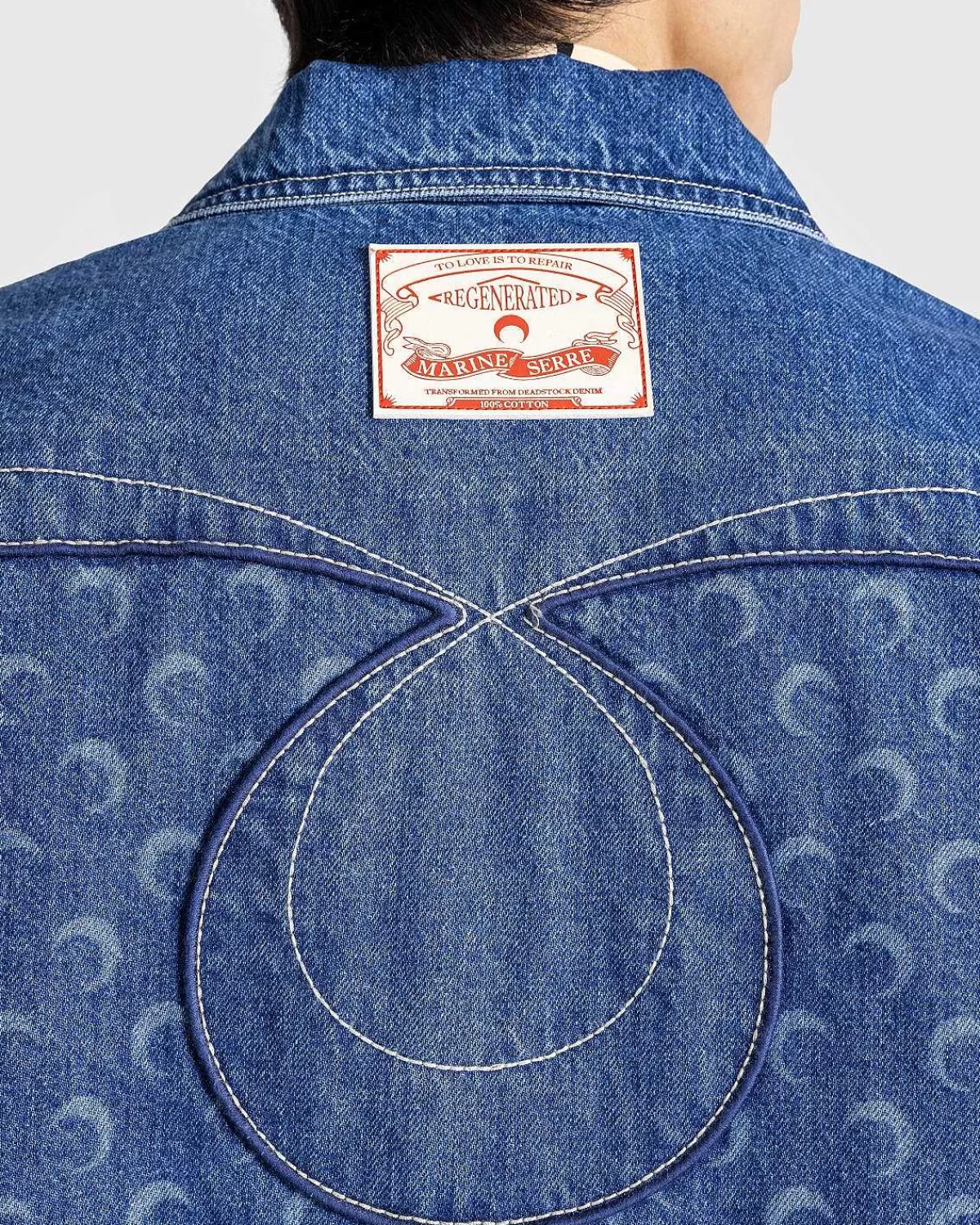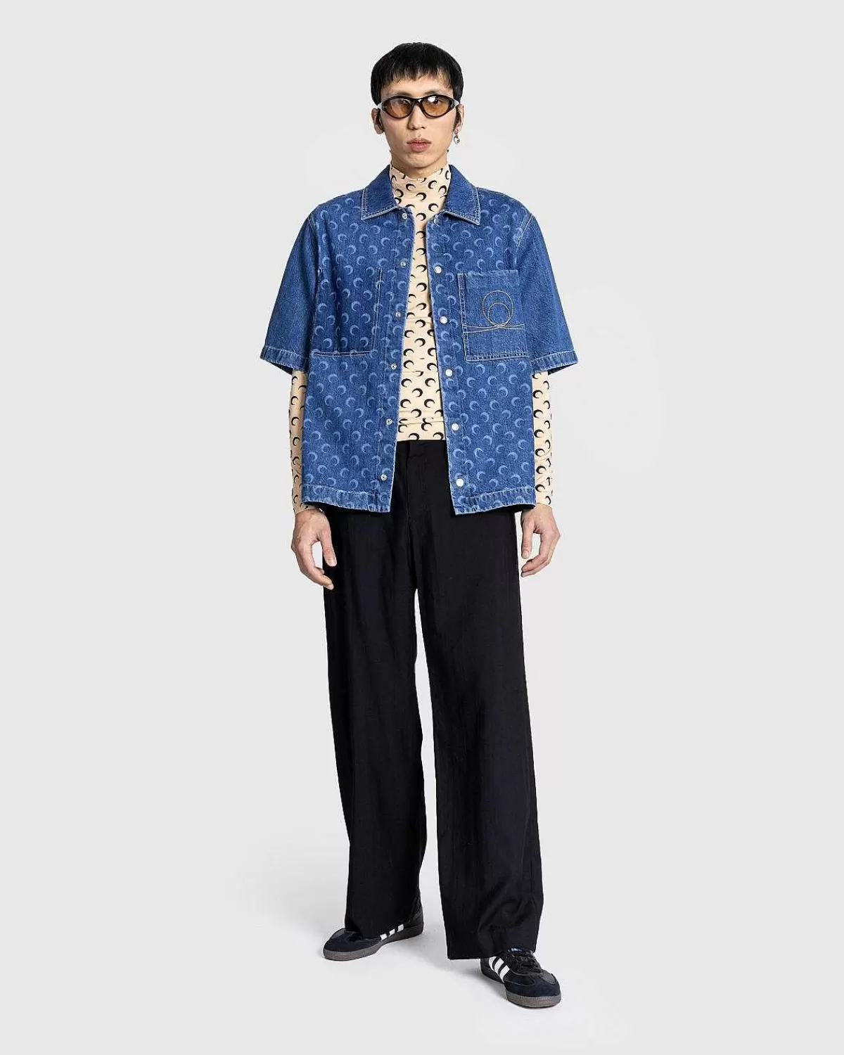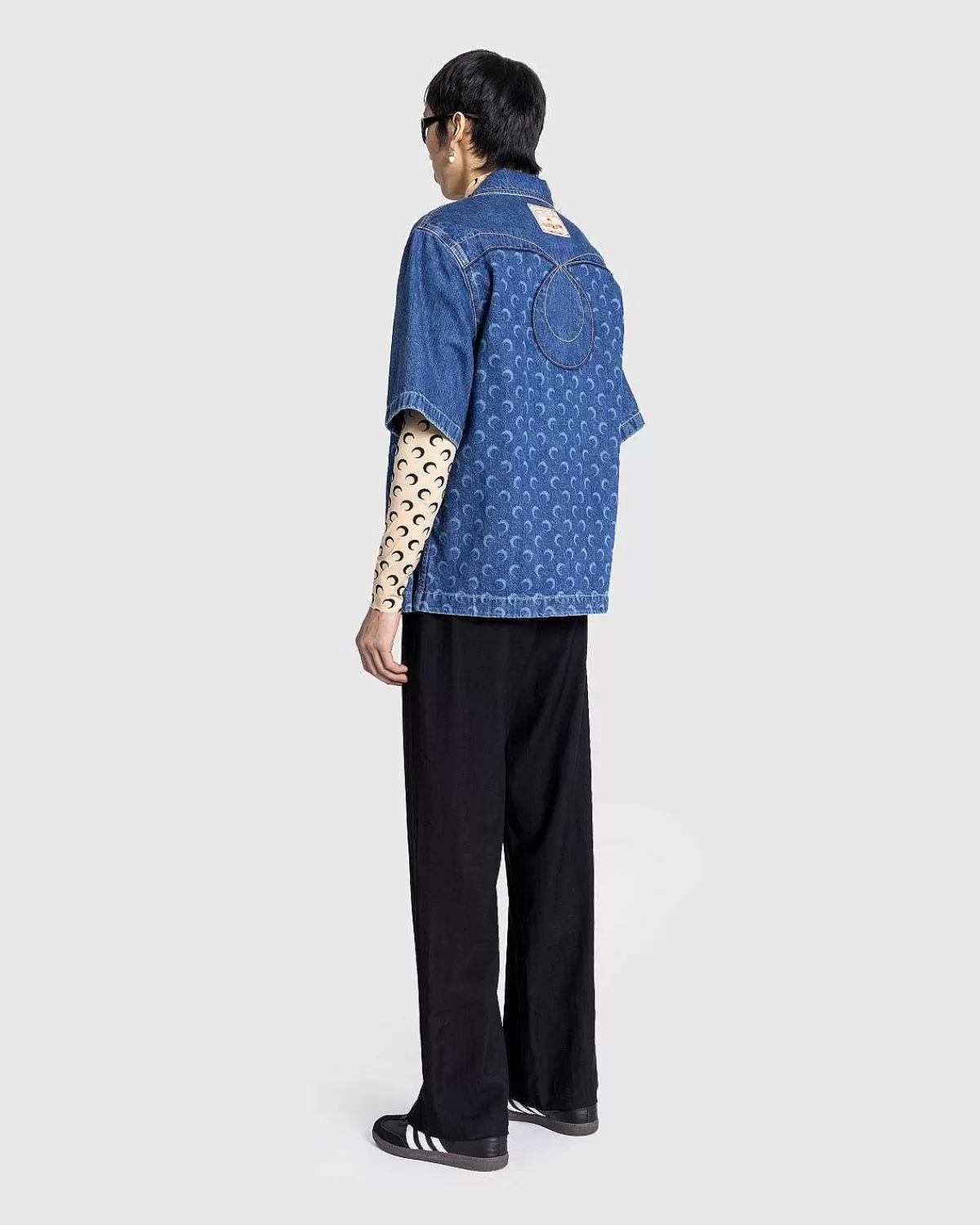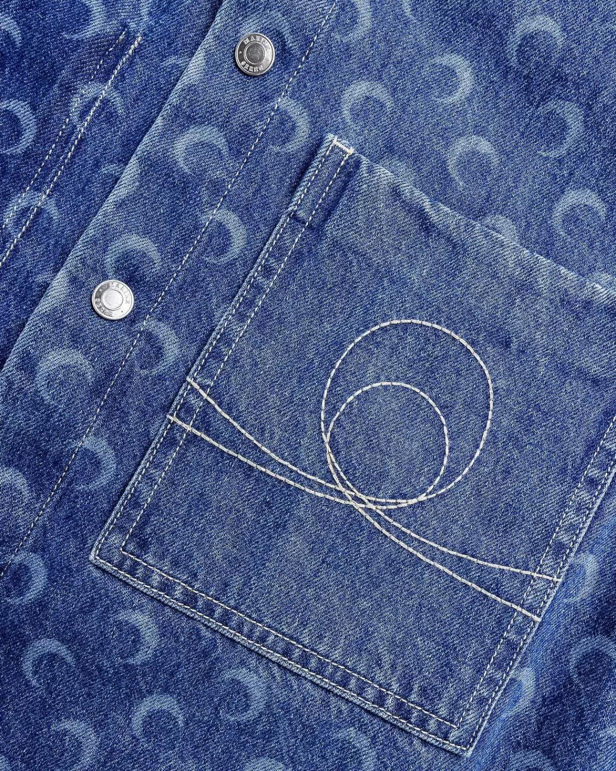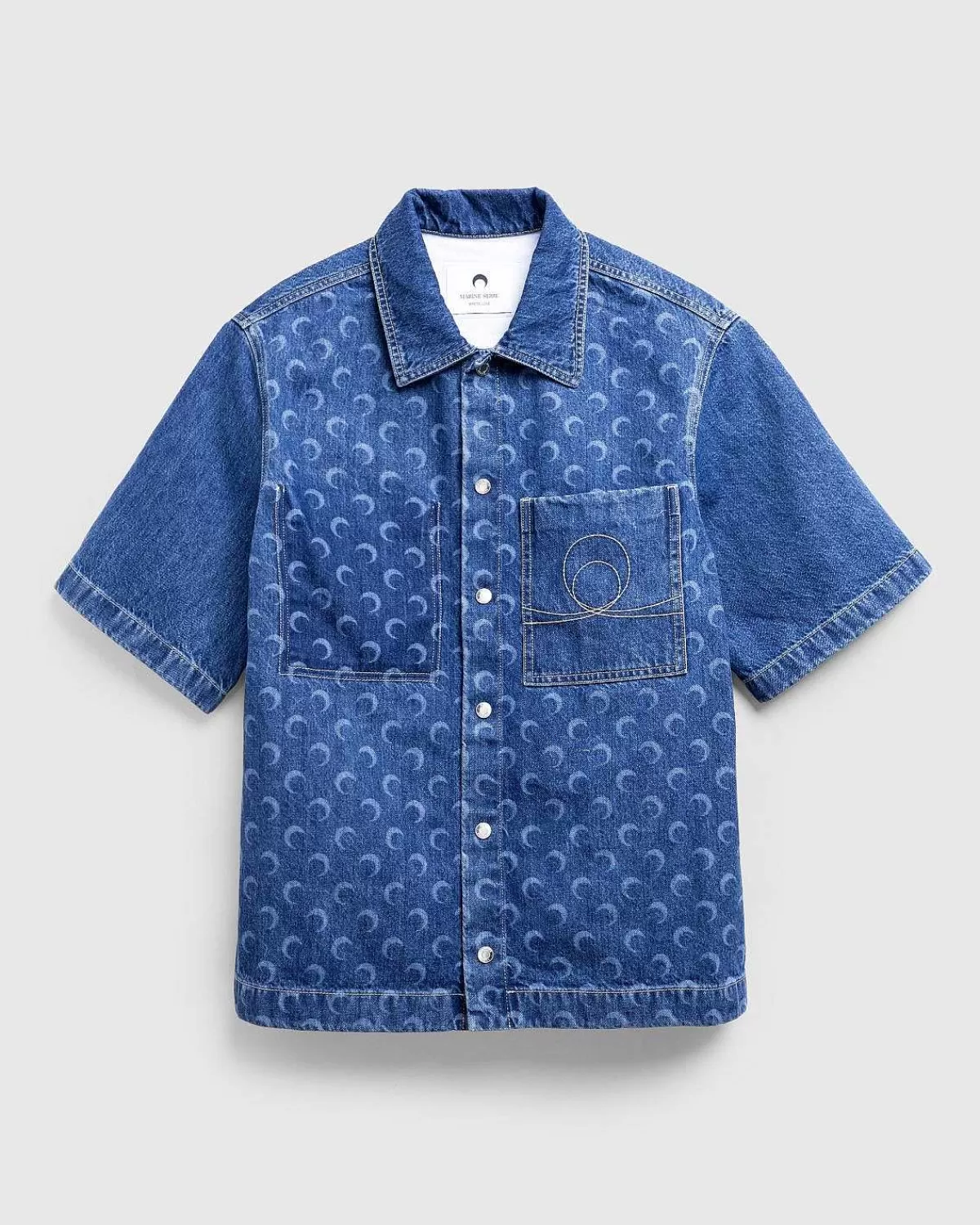 Denne Marine Serre-Stil, Der Tegner Sig Fra Klassisk Arbejdstøj, Fungerer Som Et High-Fashion-Tak På En Denim-Knap. Den Kortærmede Beklædningsgenstand Er Lavet I Italien Af 100 % Bomuld Og Detaljeret Med Mærkets Signaturmåneprint, Ud Over Indviklet Broderi På Forsiden Såvel Som Bagsiden. Yderligere Designelementer Omfatter En Spredt Krave, Trykknapper, Lige Søm, En Venstre Brystlomme Og En Højre Skyggelomme.