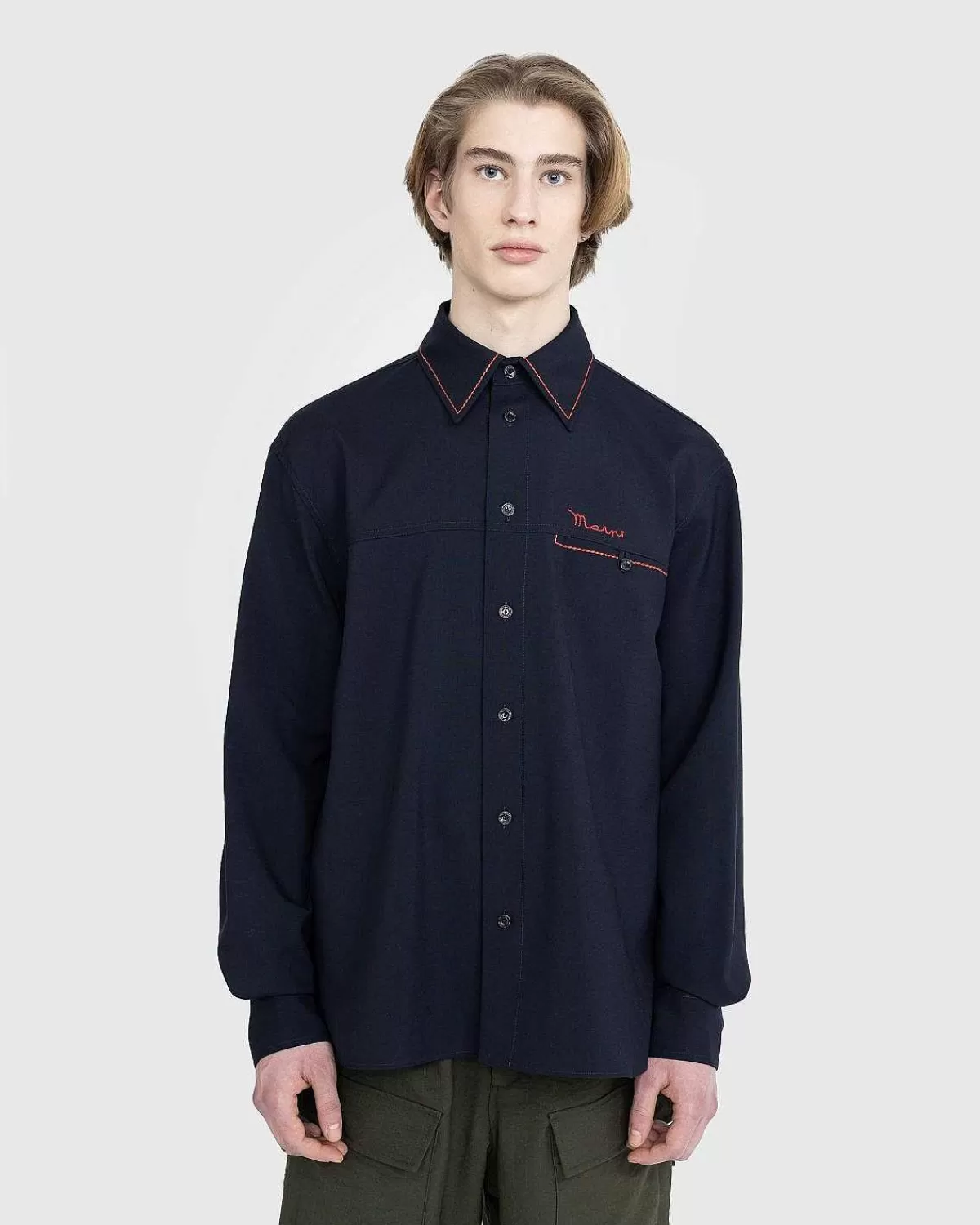 Denne Marni Button-Up Er Defineret Ved Kontrasterende Syninger Ved Kraven Og Brystlommen. Vævet Af 100 % Jomfruuld, Den Afslappede Pasform Er Legende Mærket Med Et Rødt Marni-Logo, Der Matcher Topstikningen. Traditionelle Skjortedetaljer Omfatter Tabte Skuldre, Knaplukning I Midten Foran Og Knapmanchetter.