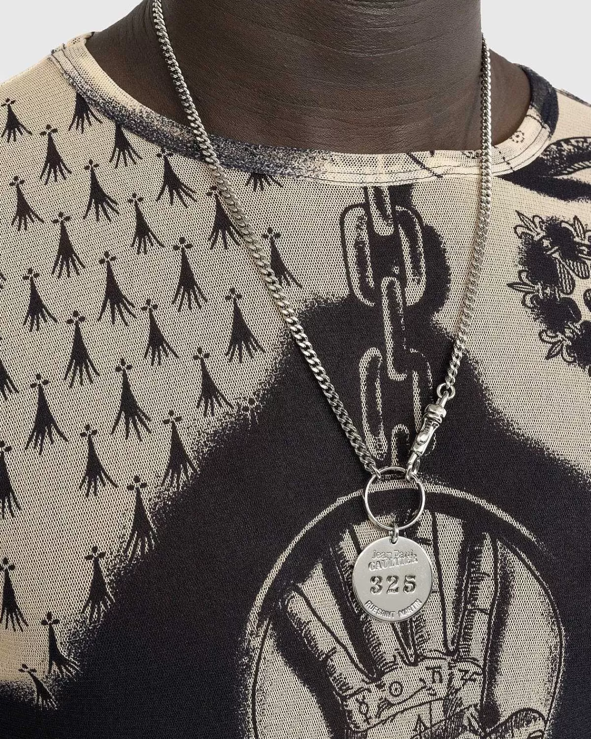 Dette Hverdagstilbehør Ankommer Som En Del Af Jean Paul Gaultiers Seneste Tatoveringskollektion Med En Sølvfarvet Farvevariant, Der Har En Medaljon Med Mærkets Nr. 325 Rue Saint Martin Præget I Midten. Halskæden Er Afsluttet Med En Hummerlås Lukning Og En Nøglering Påsat, Så Du Kan Style Den Som Du Vil.