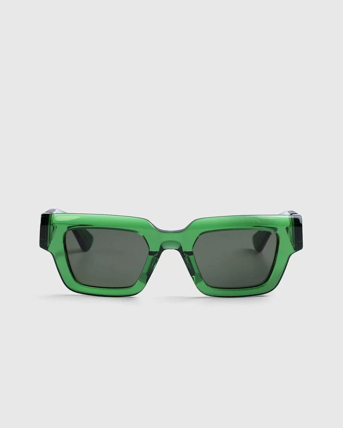 Bring En Moderne Kant Til Dine Outfits Med De Grønne Firkantede Solbriller Fra Bottega Veneta. Det Gennemskinnelige Par…