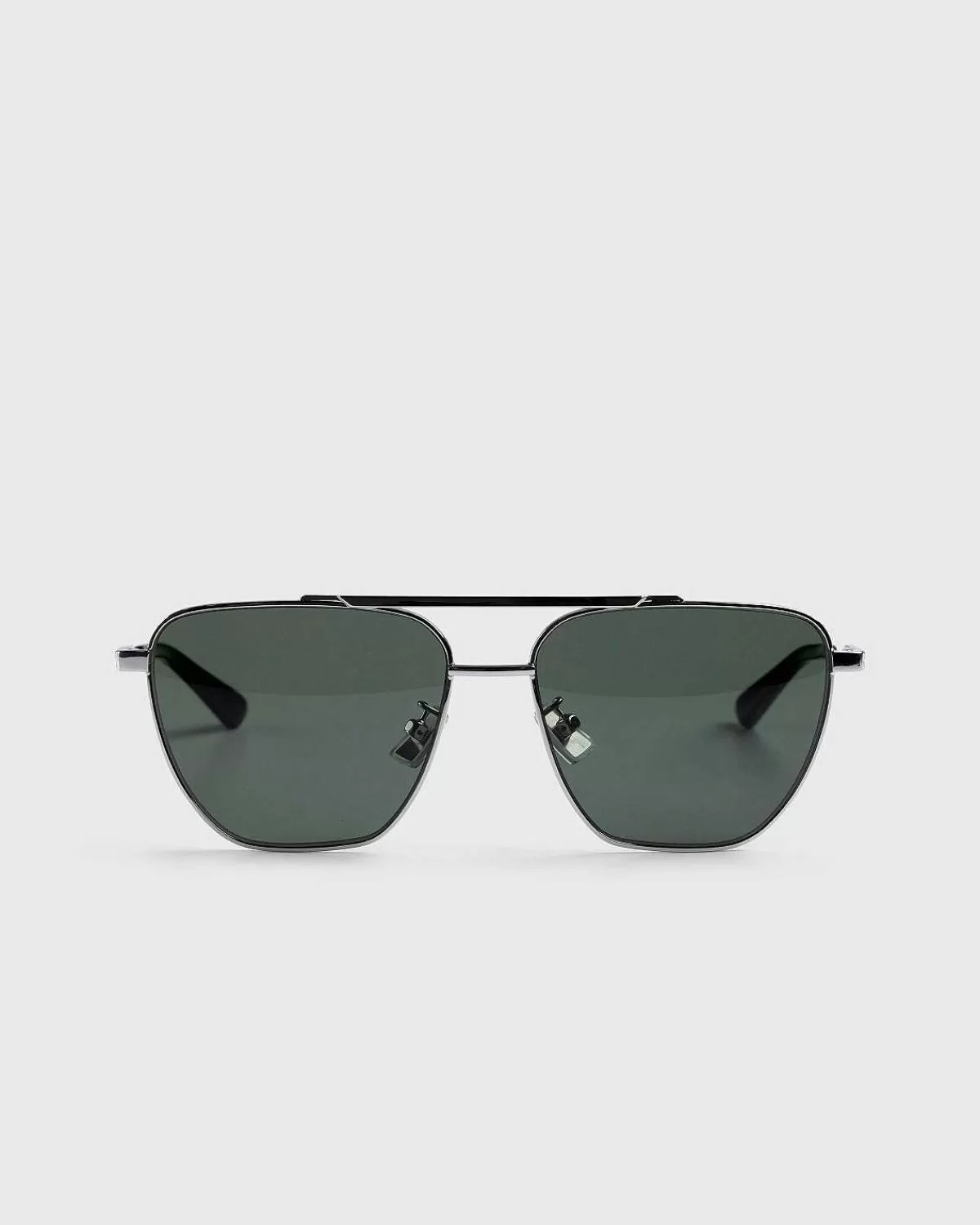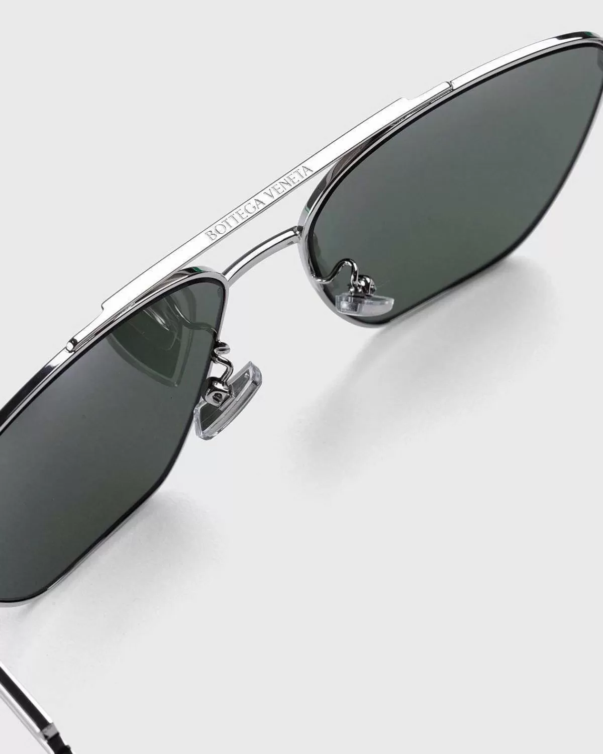 Bottega Venetas Pilotsolbriller Fungerer Som En Moderne Opdatering Til En Ikonisk Brillestil. Sølvparret Kombinerer Firkantede Metalrammer Med Fuld Kant Med Ensfarvede Linser, Justerbare Gumminæsepuder Og Acetattinderspidser. Stilen Er Derefter Fremhævet Med Et Indgraveret Bottega-Logo Indbygget På Den Øverste Bjælke.