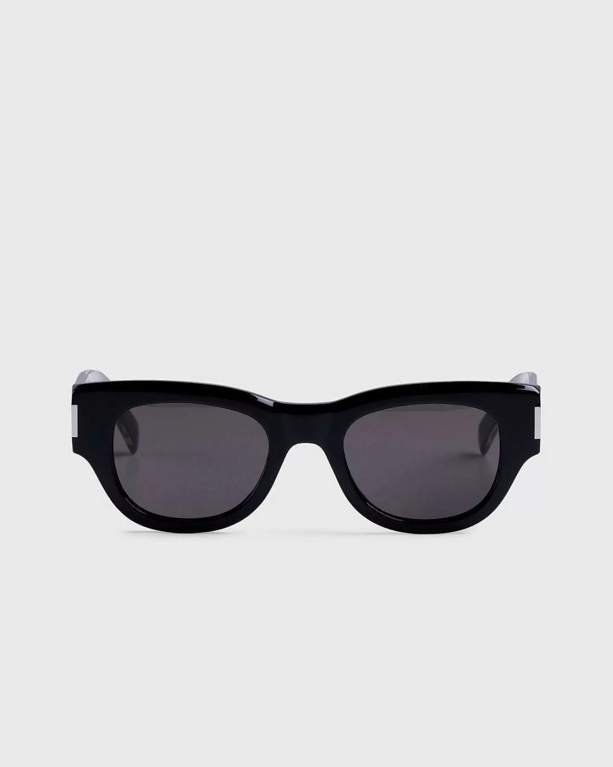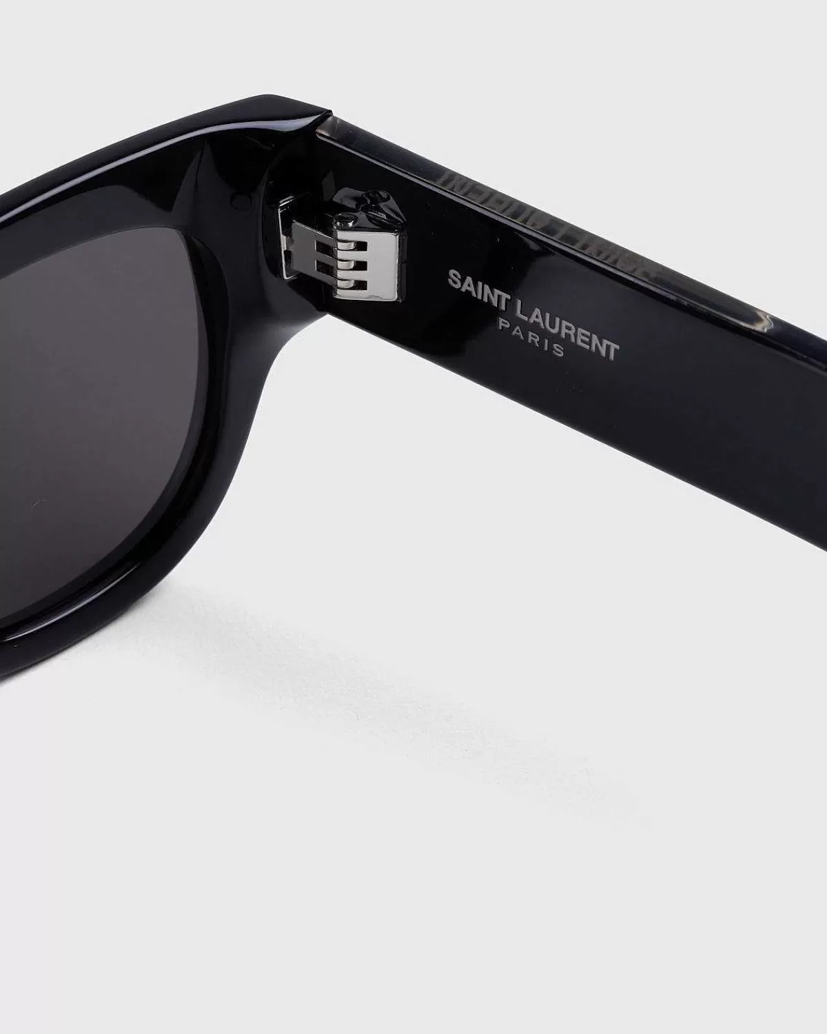 Dette Par Saint Laurent-Solbriller Er Et Tykt Katteøje-Stel, Der Ankommer Denne Sæson I En Snigende Sort/Krystal/Grå Gentagelse. Brillerne Er Lavet Af 100% Acetat Og Kombinerer Sorte Tonede Linser Med Et Sort Katteøje Stel, Da Parret Derefter Er Detaljeret Med Logogravering På Hver Arm.