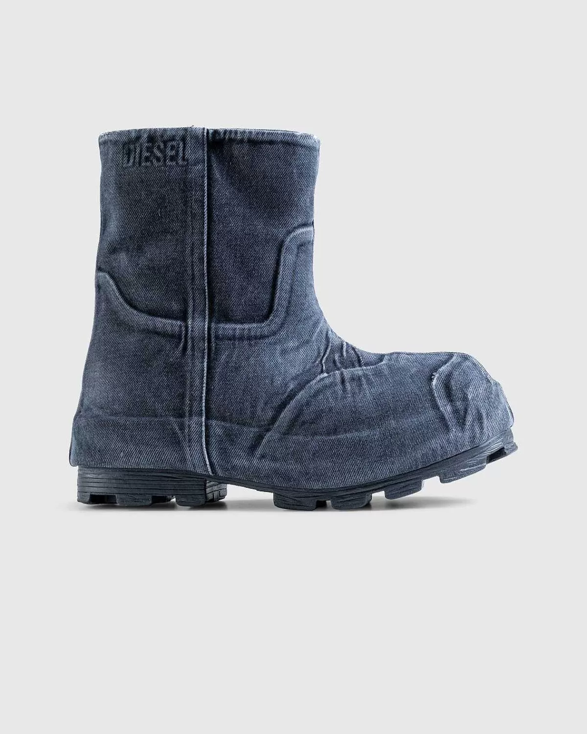 D-Hammer Er En Del Af Diesel Runway-Kollektionen Og Er En Moderne Opdatering Til Den Klassiske Chelsea-Støvle. Unisex-Parret Er Kendetegnet Ved En Sort Stenvasket Denimbelægning, Mens Den Har En Tyk Støbt Konstruktion, Synlige Syninger Og En Sål. Mærkets Logo Er Præget På Kraven For At Tjene Som Det Enlige Ydre Branding-Hit.