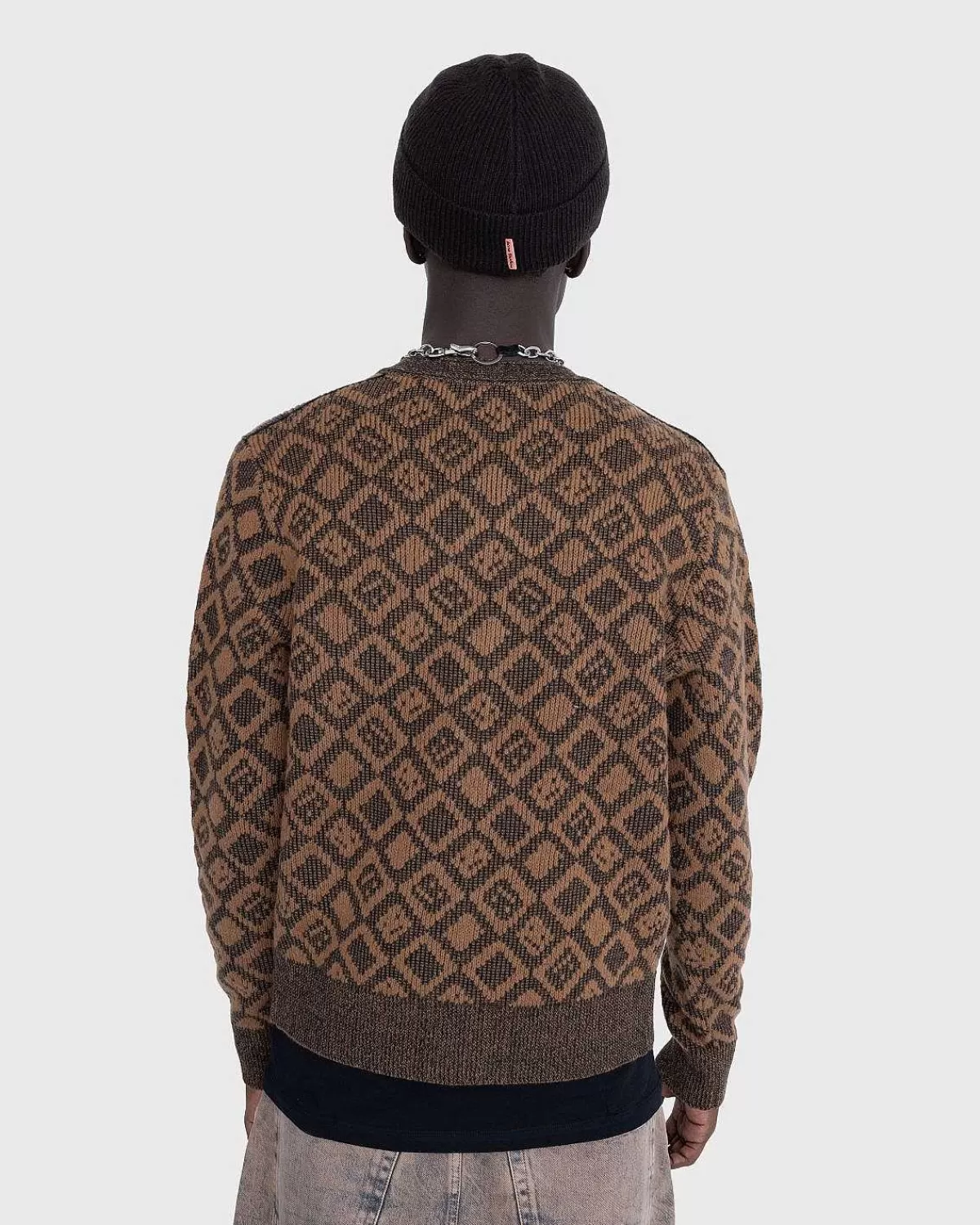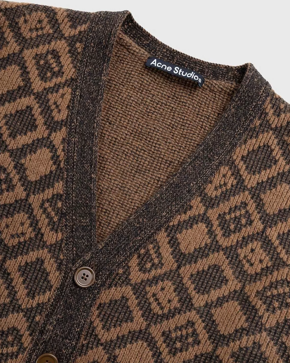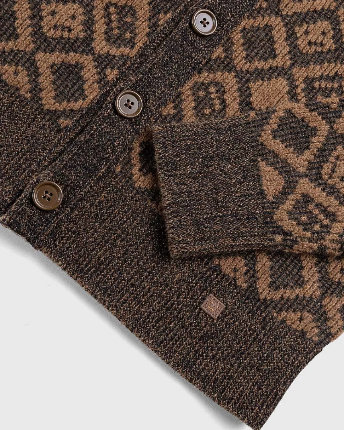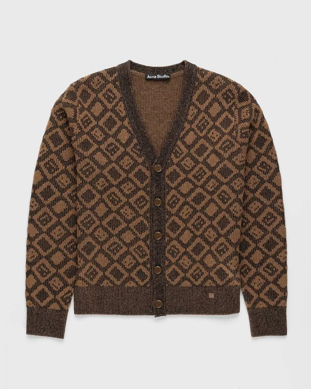 Cardigans Behøver Ikke At Være Kedelige, Og Denne Acne Studios-Stil Er Alt Andet End. Det Strikkede Design Er Dekoreret Med Et Legende Motiv I All-Over Mode. Ankommer I En Tofarvet Brun Farvevariant, Uld-Bomuldsblandingstrøjen Er Lavet Med Knaplukning Foran Og Har En V-Udskæring Med Rib, Manchetter Og Kant. Det Er Et Unisex-Tilbud, Der Er Skåret Til En Normal Pasform.