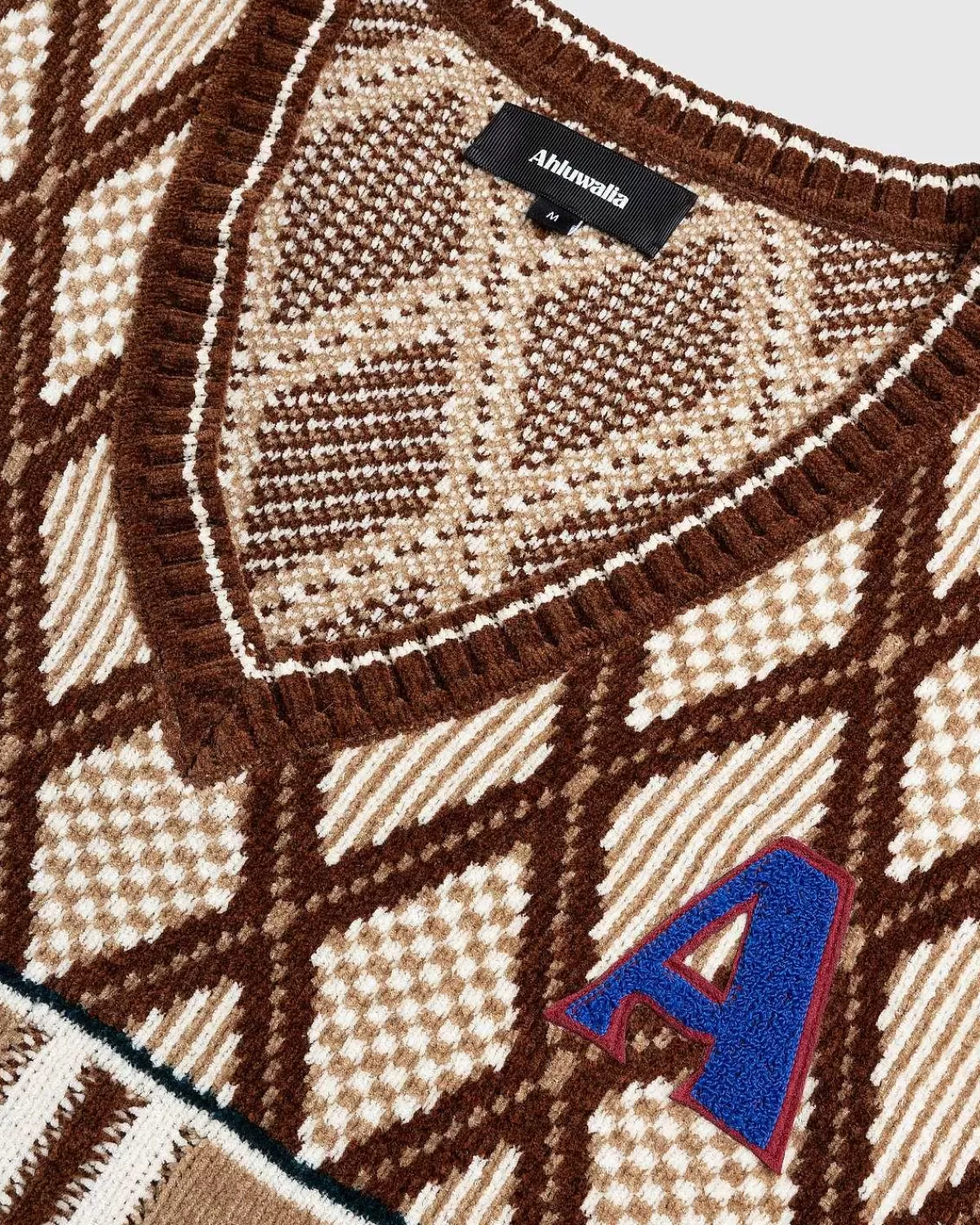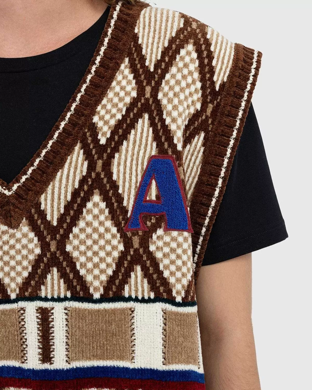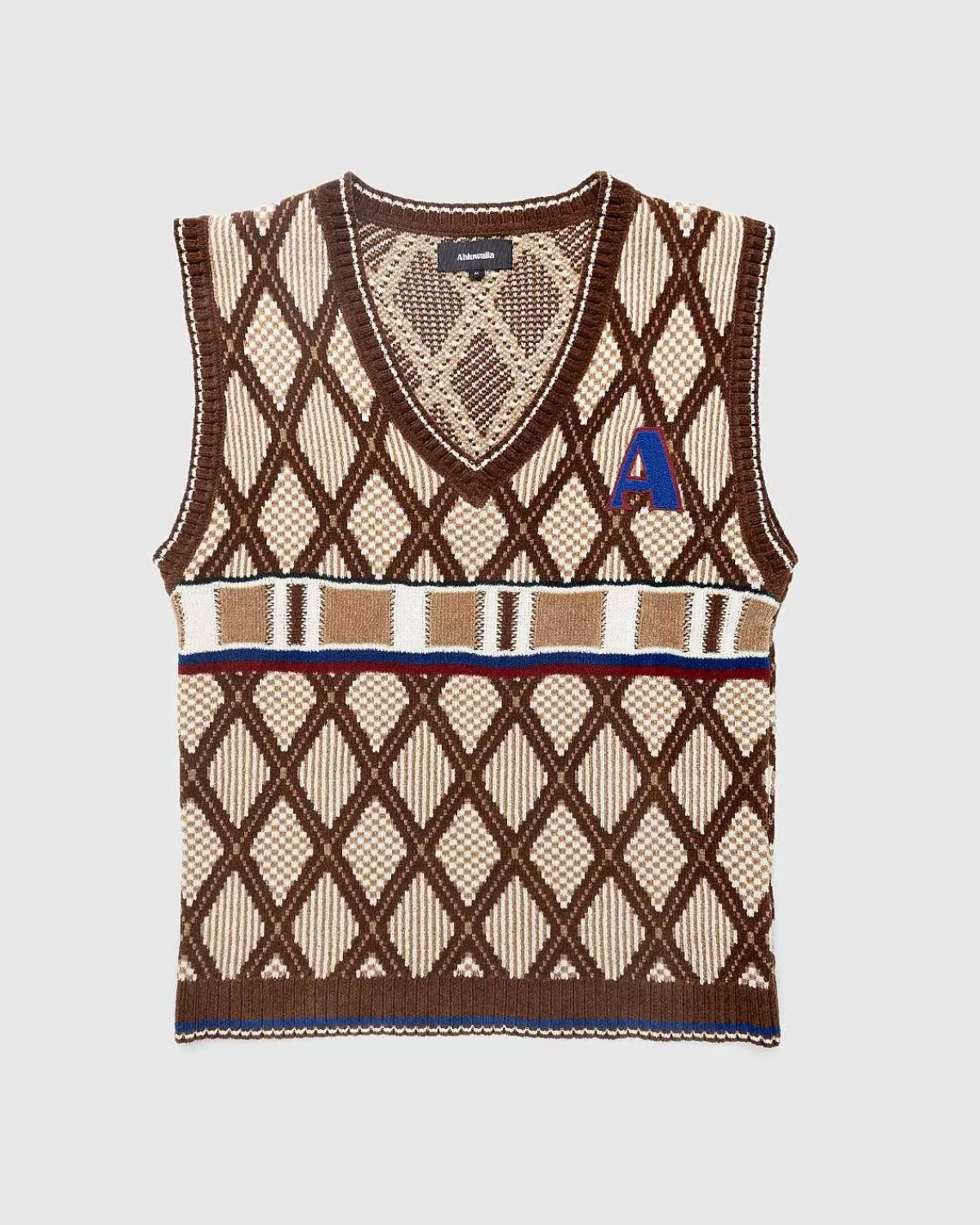 Kingpin-Vesten Er Strikket Af Et Blødt Viskose-Organisk Bomuldsstof. Den Har Et Diamanttryk Overalt Med Et “A” Patchwork-Motiv På Brystet. Yderligere Designdetaljer Inkluderer Av-Halsudskæring, Lige Søm Og Ribstrikket Kant.
