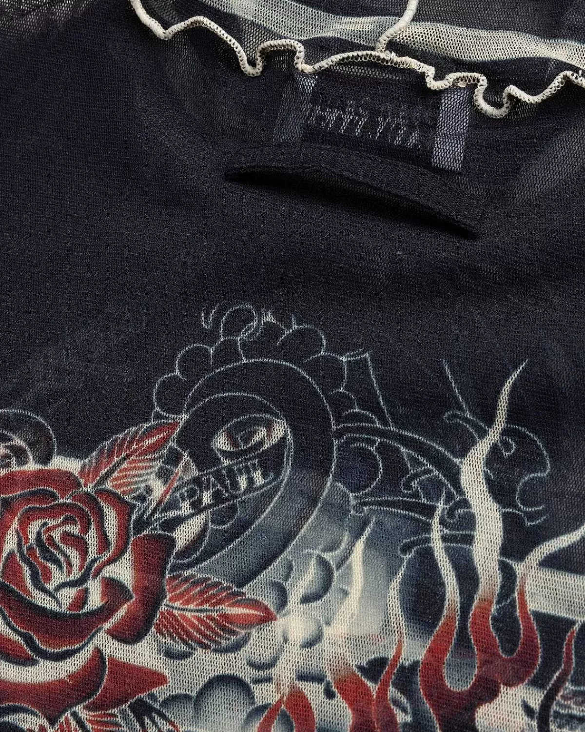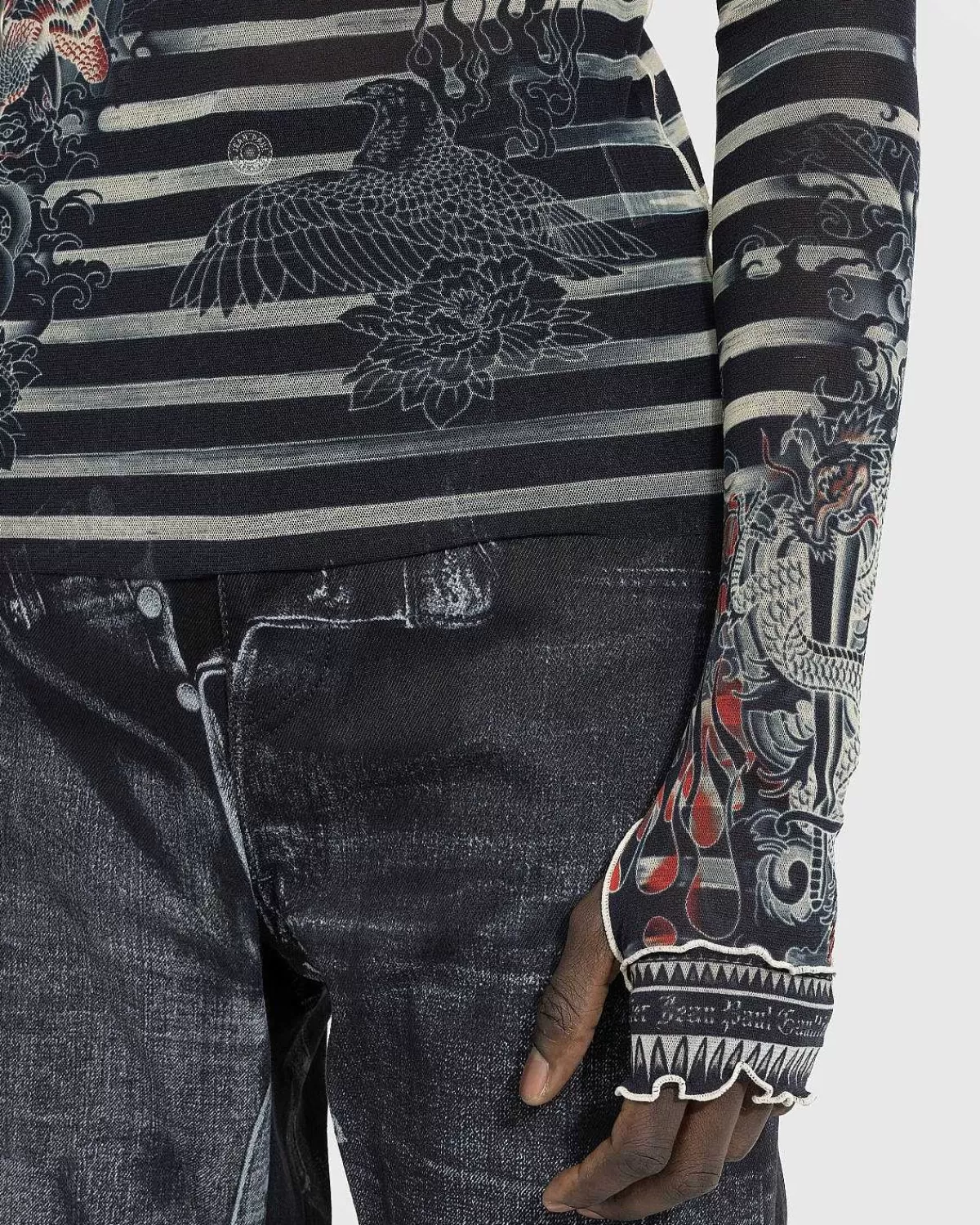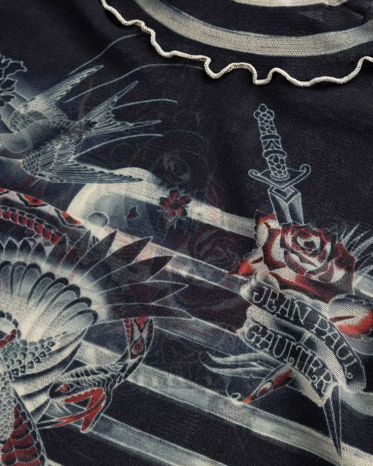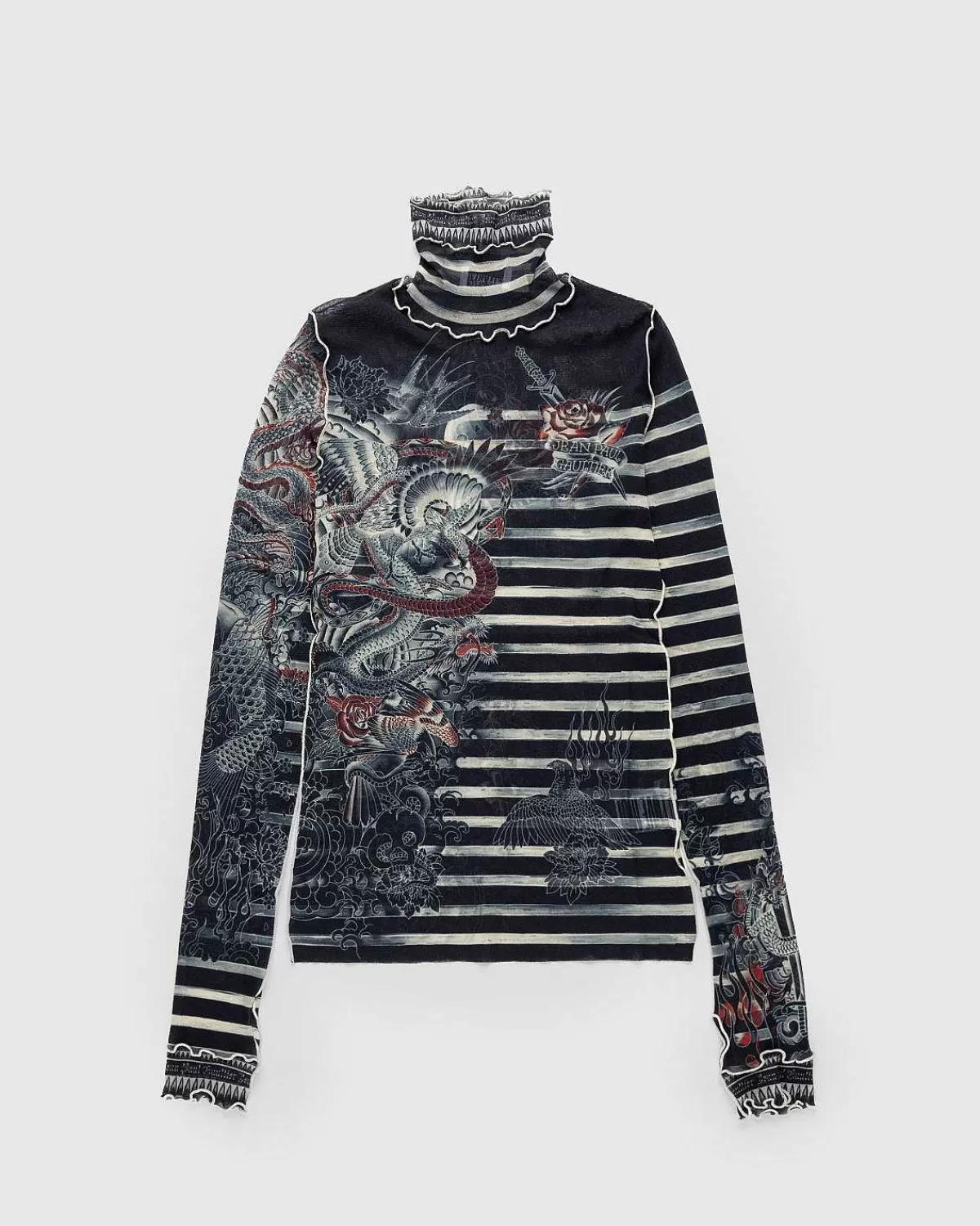 Tatoveringer, Piercinger, Kropsudsmykninger – Alle Er Fair Play I Jean Paul Gaultiers Univers Af Klar-Til-Brug Stykker. Mærkets Seneste Tatoveringssamling Gensøger Sit Arkiv Af Strækbare, Gennemsigtige Silhuetter Som Sailor Tattoo Top, Der Er Produceret Udelukkende Fra Tyl. Detaljeret Med Mærkets Signaturstriber Og Tatoveringer Med Print Over Det Hele, Den Langærmede Top Er Færdig Med Tommelfingeråbninger, En Rullekrave Og Kontrasterende Overlocksømme Ved Sømmene.