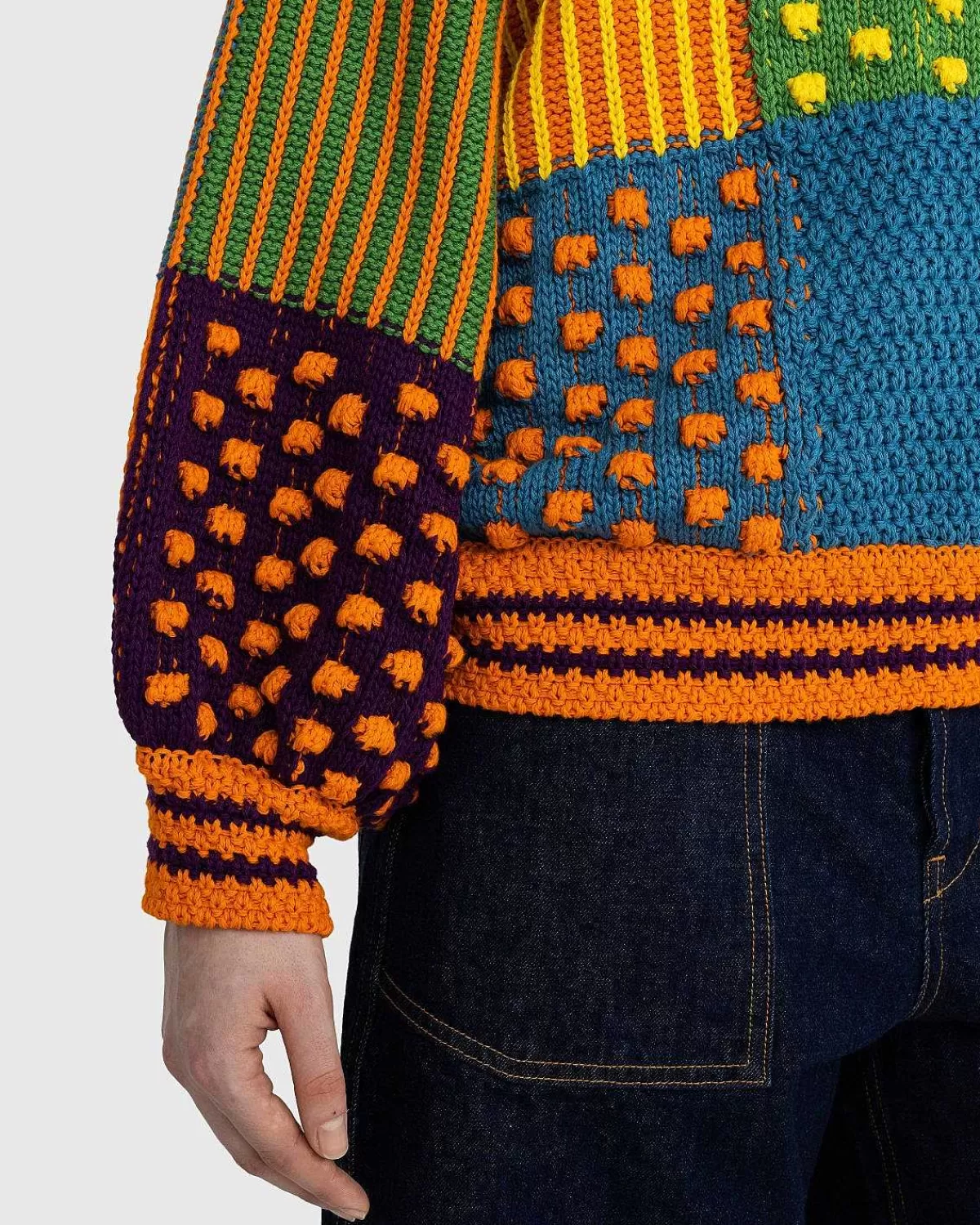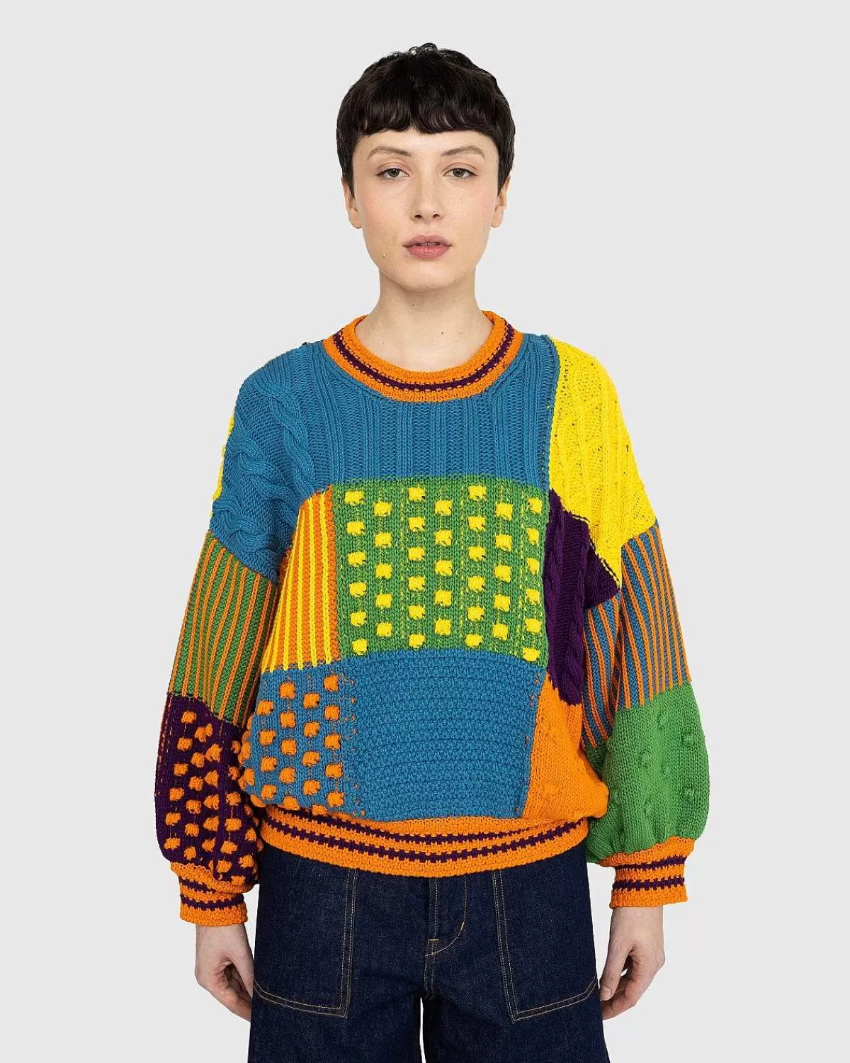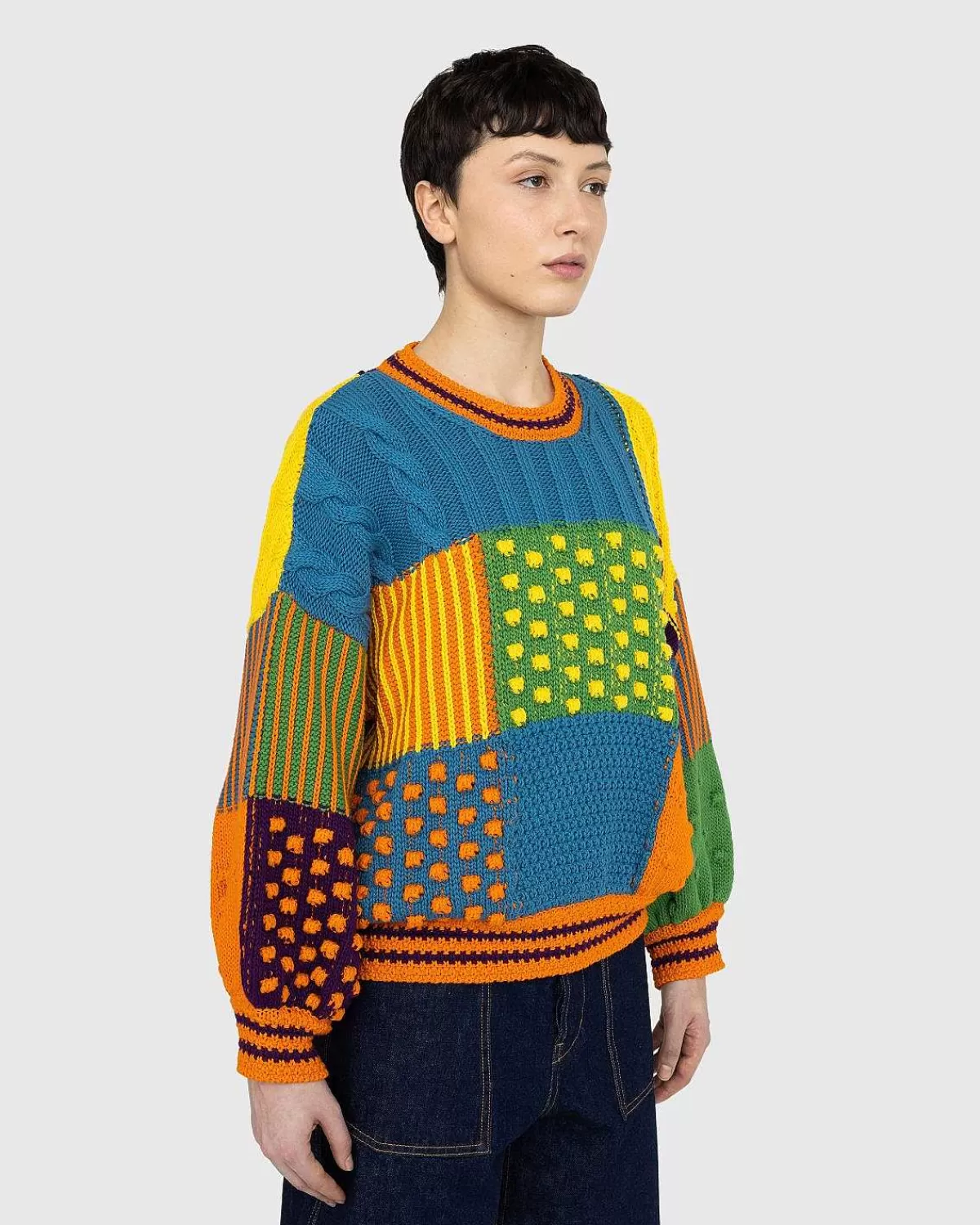 Denne Sweater Har En Farverig Patchwork-Finish Og Er Lavet Med Forskellige Kontrastmønstre Og Teksturer, Der Alle Samles For At Skabe Et Retro-Inspireret Stykke Strik. Skåret I En Overdimensioneret, Boxy Pasform Med Drop-Skuldre, Orange Ribdetaljer Er Brugt Til Manchetter Og Halsudskæring. Denne Stil Er Fremstillet Udelukkende Fra Gots (Global Organic Textile Standard) Certificeret Økologisk Bomuld, Hvilket Betyder, At Der Blev Brugt Miljøbevidste Metoder Såsom Vandbesparende Landbrugsmetoder Og Dyrkning I Et Miljø Uden Kemisk Gødning.