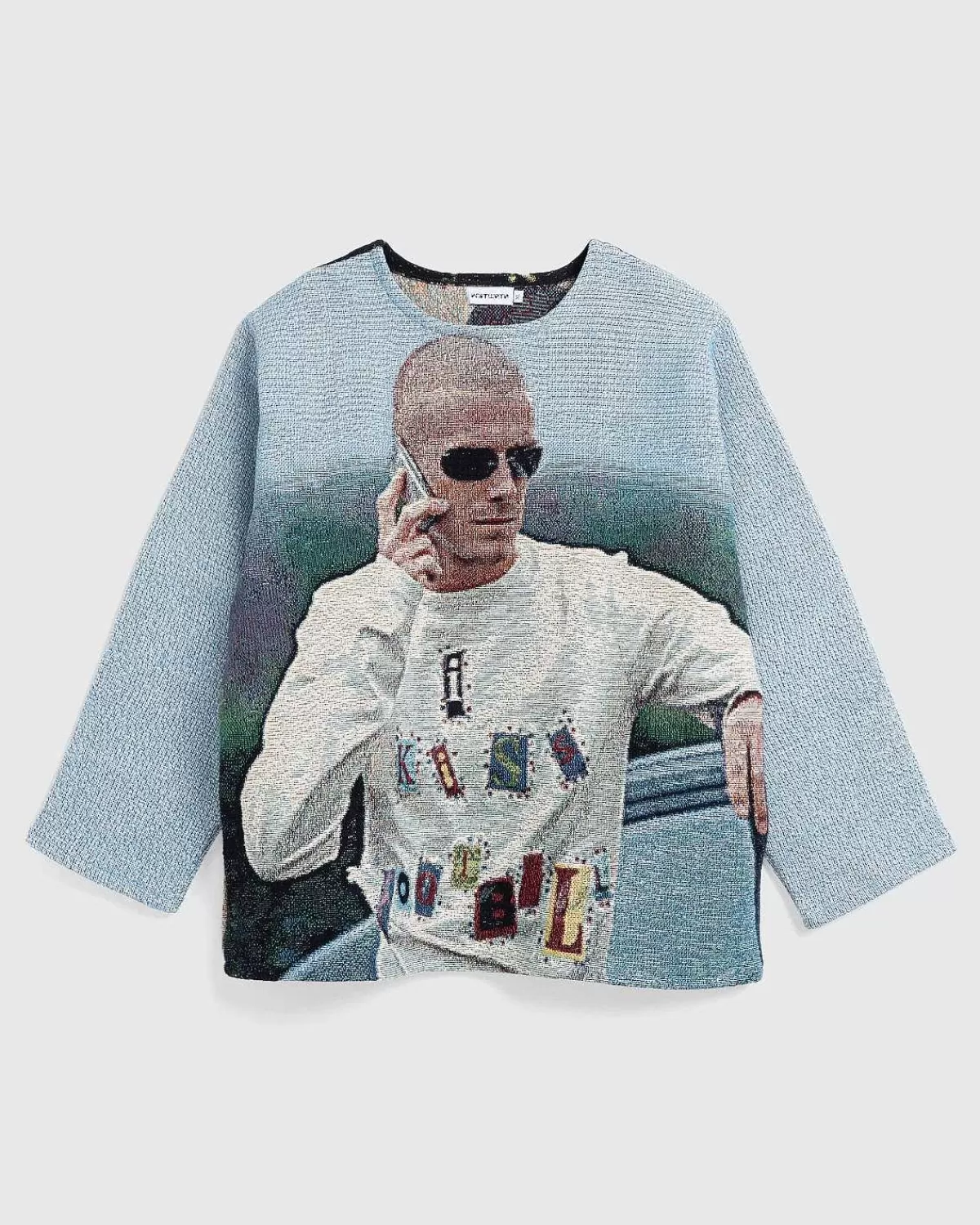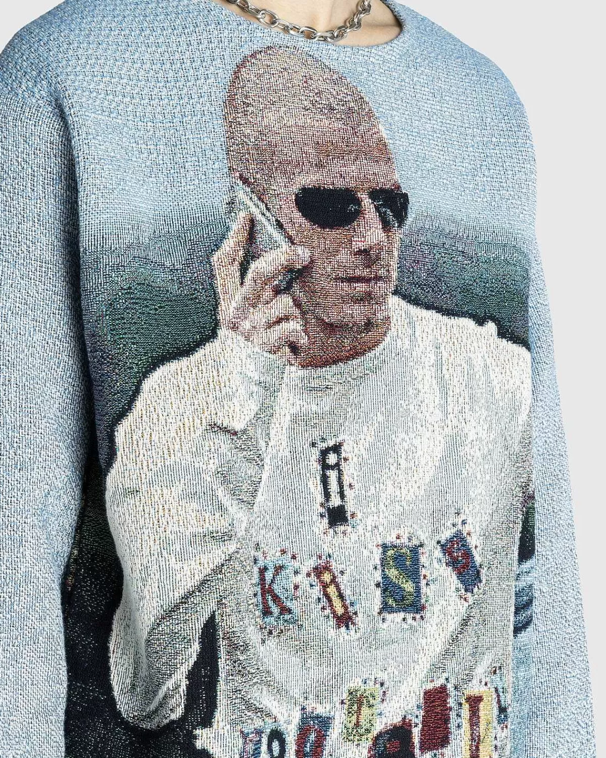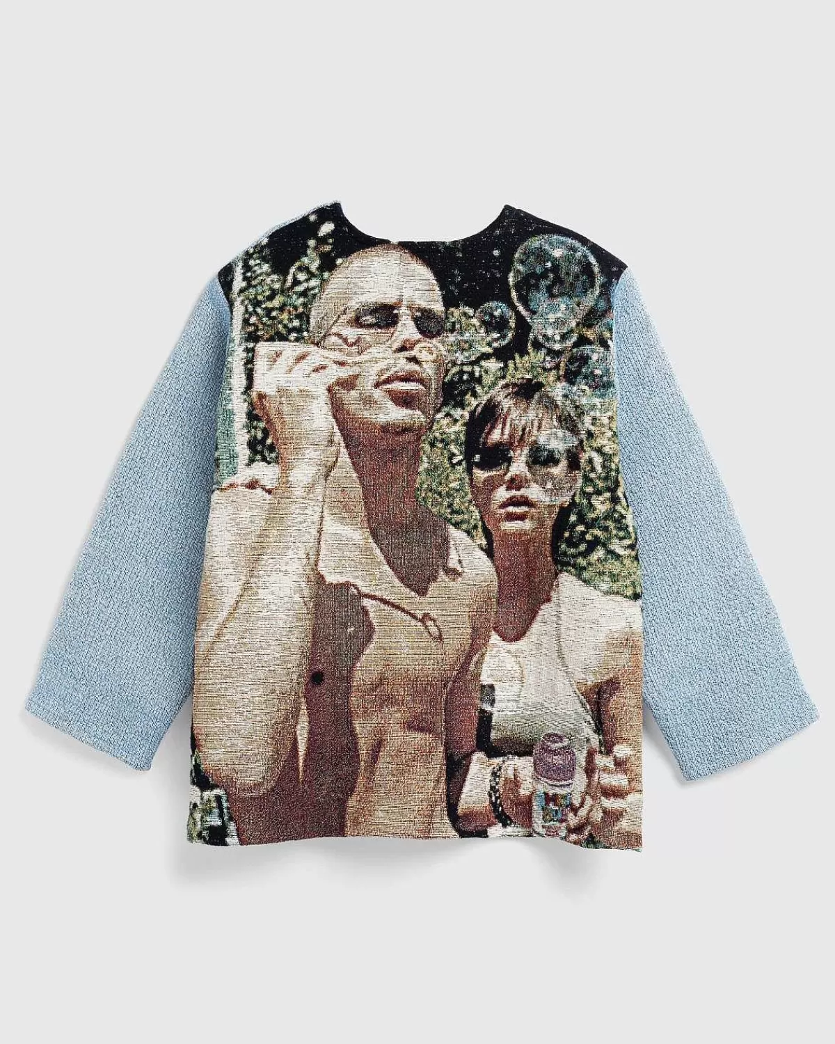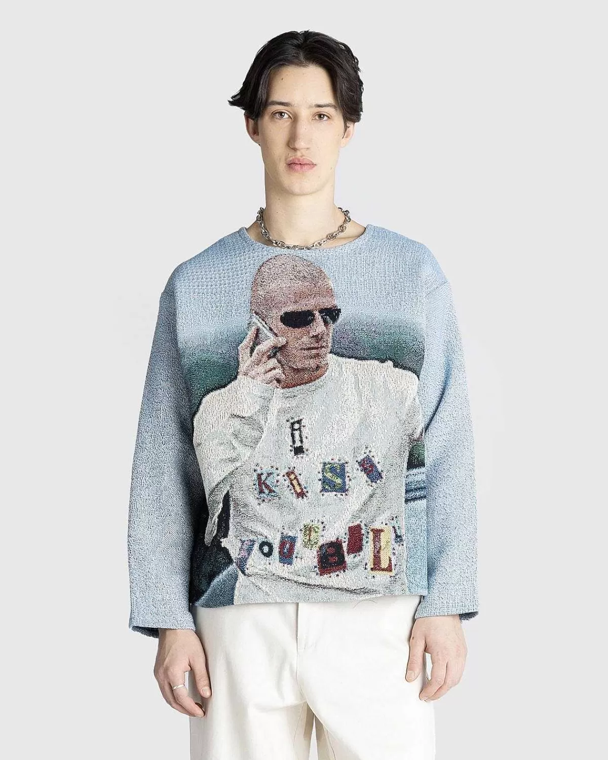 Kendt For Sine Indviklede Toppe, Der Blander Forskellige Aspekter Af Popkultur, Er Knitwrth Vokset Til At Være Et Go-To-Brand For Store Navne Som Peggy Gou, Emily Ratajkwoski, Nia Archives Og Mere. Denne Striktrøje Er Prydet Med En Overordnet Grafik, Der Ligner Fodboldlegenden David Beckham Og Har Et Åbenhjertigt Portræt Af Ham Og Hans Kone, Victoria Beckham, På Bagsiden.