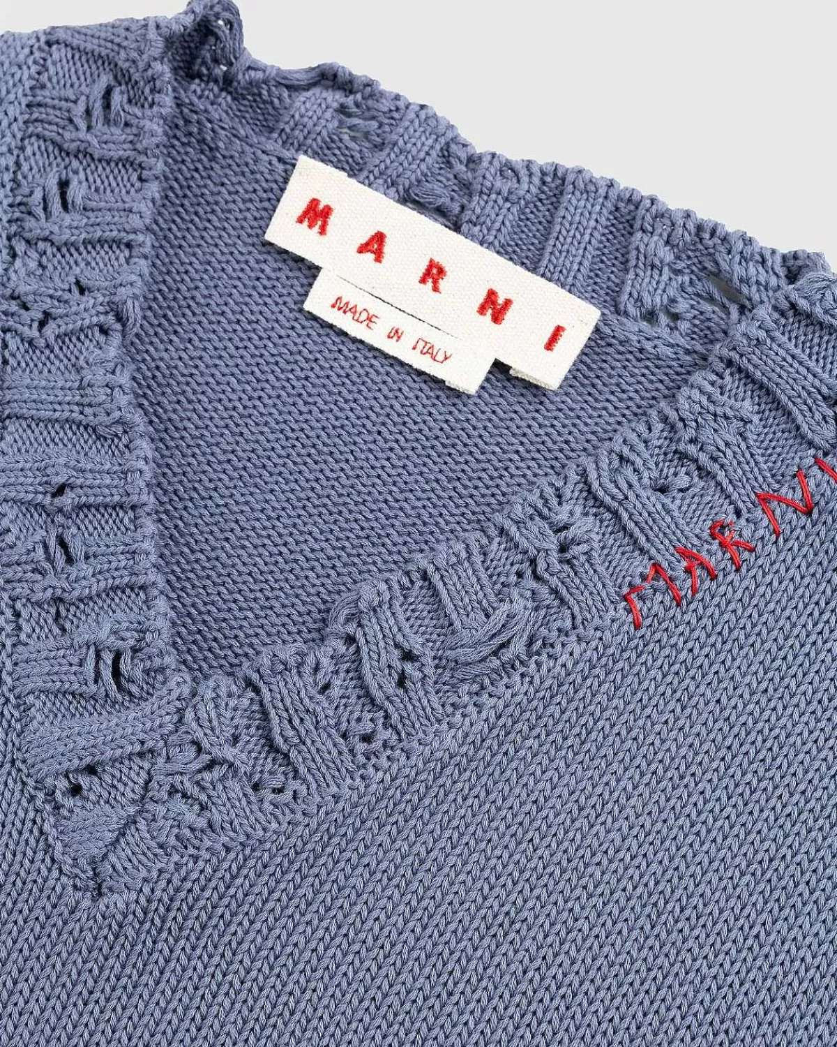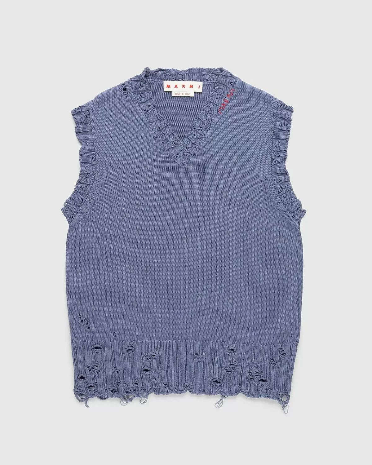 Denne Marni-Trøjevest Er I En Nødstilet Strik Af 100 % Bomuld. Det Er Defineret Af Distressed Detaljering, Mens Det Har Traditionelle Ribstrikkede Trim Ved Halsudskæring, Manchetter Og Kant. For Yderligere At Udsmykke Stykket Er Et Håndsyet Marni-Logo Indbygget Ved Halsen I Kontrasterende Tråd.